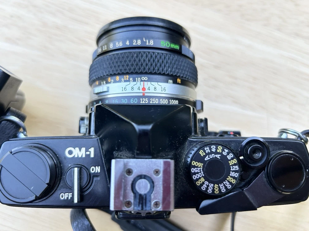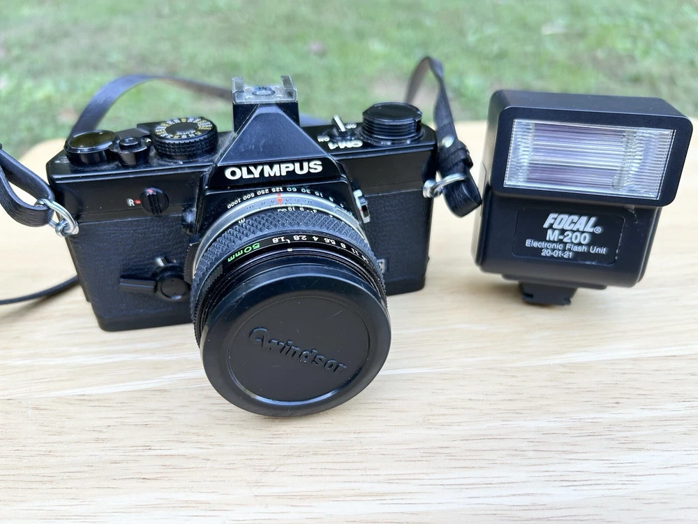 VTG Olympus OM-1 35 MM Camera W/ 50 MM Lens & Focal M-200 Electronic Flash Unit UNTESTED SHUTTER WORKS Made in Japan