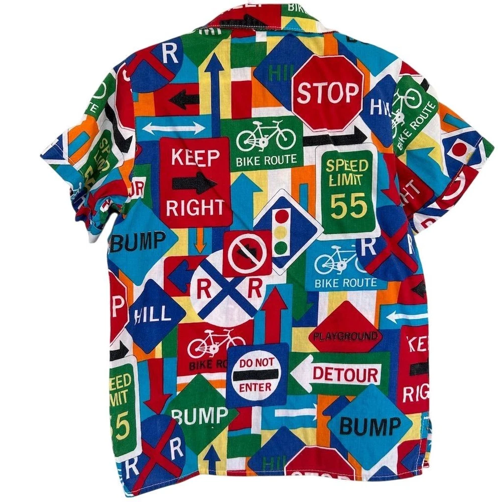 Kids road signs graphic collared short sleeve shirt. Vibrant allover print featuring traffic signs, speed limits, and bike routes. Button front closure with a chest pocket. Perfect for casual outings or themed parties. Measurements: • Chest (pit to pit): 15 in • Length (shoulder to hem): 18 in • Sleeve length: 6 in Department: Unisex Kids Type: Casual Sleeve Length: Short Sleeve Theme: USA Closure: Button Fabric Type: Cotton Pattern: Graphic Print Material: 100% Cotton All items come from a smoke free, pet friendly home. All of items unless NWT or Dry Clean Only are washed with Tide. We try our best to disclose any flaws with items, if we miss something please reach out and let us know. We offer combined shipping on all our items. We do take measurements of our clothing listed for sale. Please compare the measurements to something you already own.