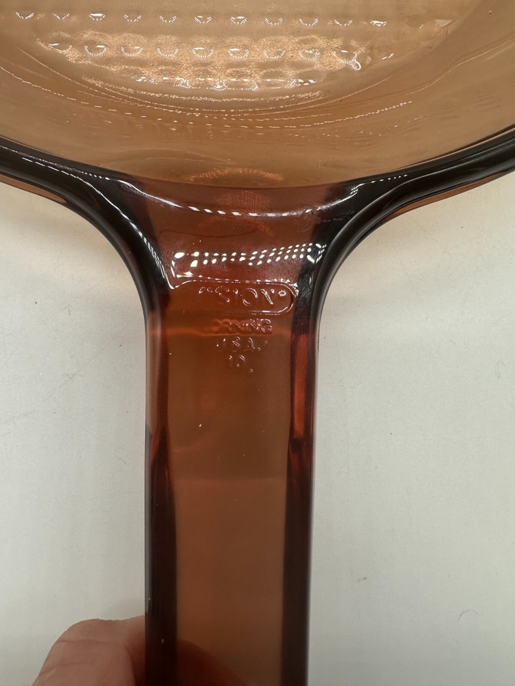 UPC: Does not apply Color: Amber Brand: Vision Cookware Object Type: Sauce Pans / Pots & Lids gtin13: Does not apply Material: Amber Glass Country/Region of Manufacture: United States Type: Glass Cooking Pots Pattern: Visions Seller Notes: “Used , scratch on bottom outside of pan , does not effect use, otherwise in great shape” Set Includes: Pots Original/Reproduction: Vintage Original Product Line: Visionware