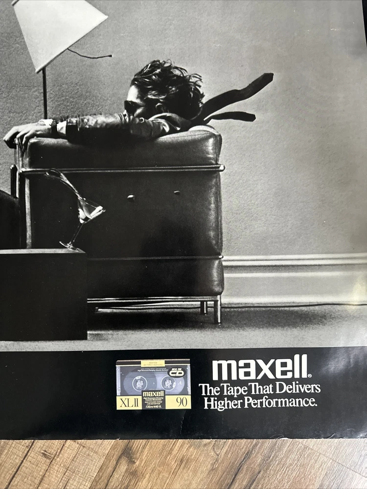 This is an original 1990 poster. It’s an ad for Maxell Cassette Tapes. Blown Away Guy. “Maxell the Tape that Delivers Higher Performance” in bottom right corner. Good condition, but has a minor tear on upper right edge and some minor white wrinkles around edges. See photos for close-up. Could be custom-matted to exclude these minor white marks and tiny corner pinholes, if framing, as they are just around the 1”edge of poster. See photos. The central artwork/photo part is in very good condition. It’s been rolled up for 34 years and will ship rolled in a tube. Measures. 20” x 39.5”.