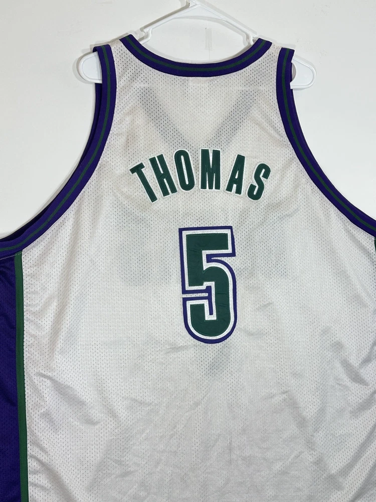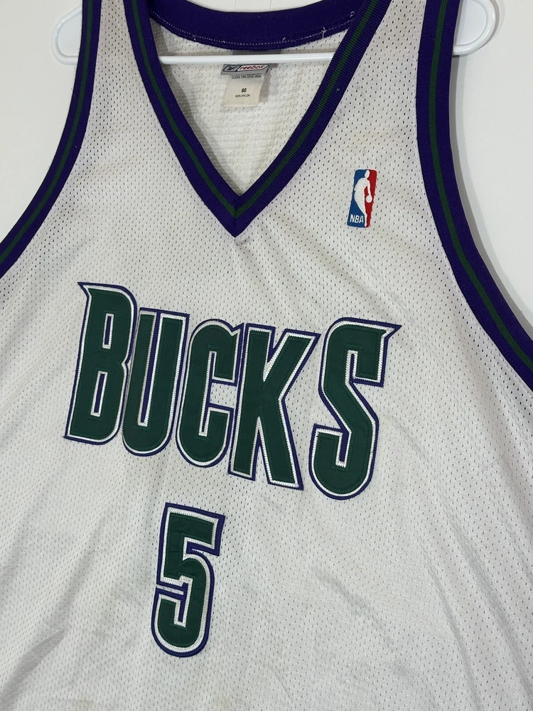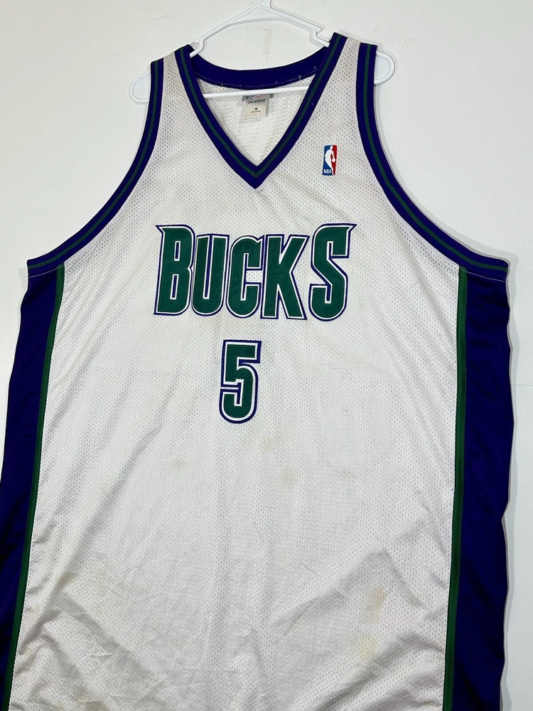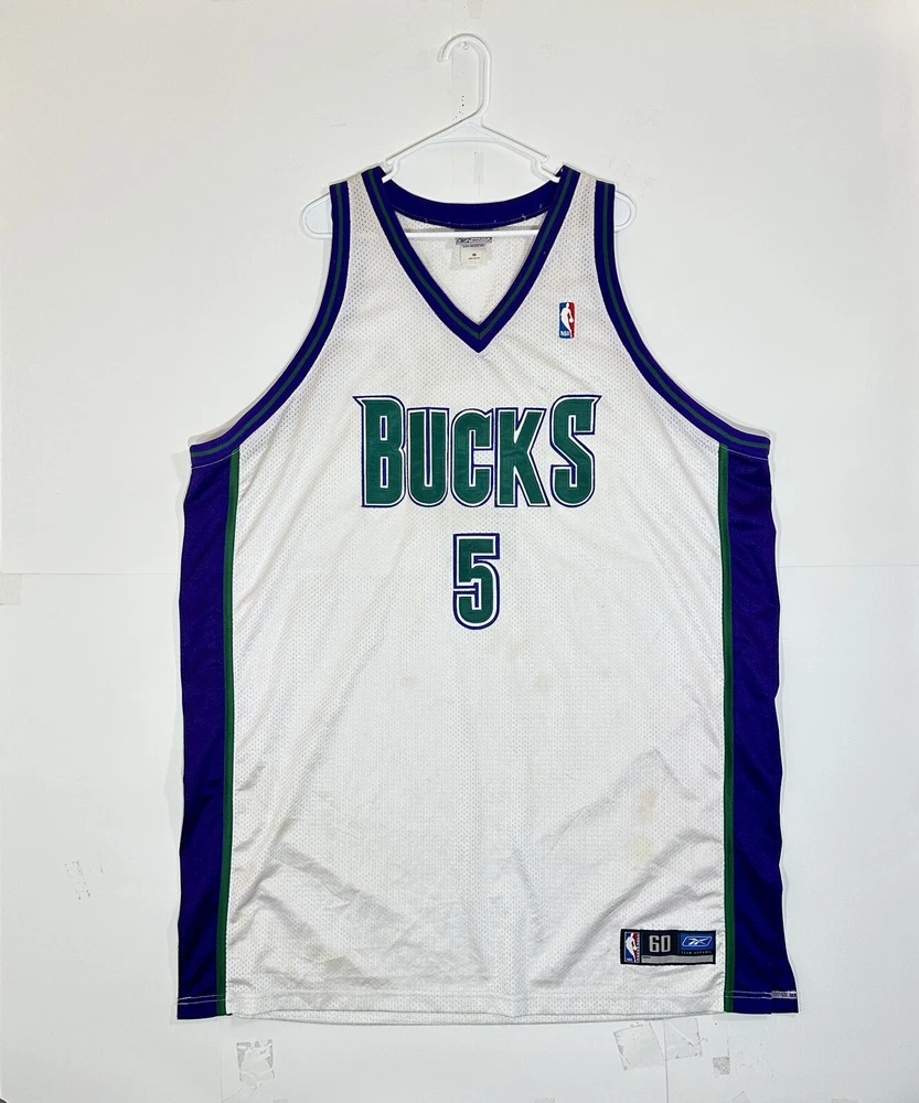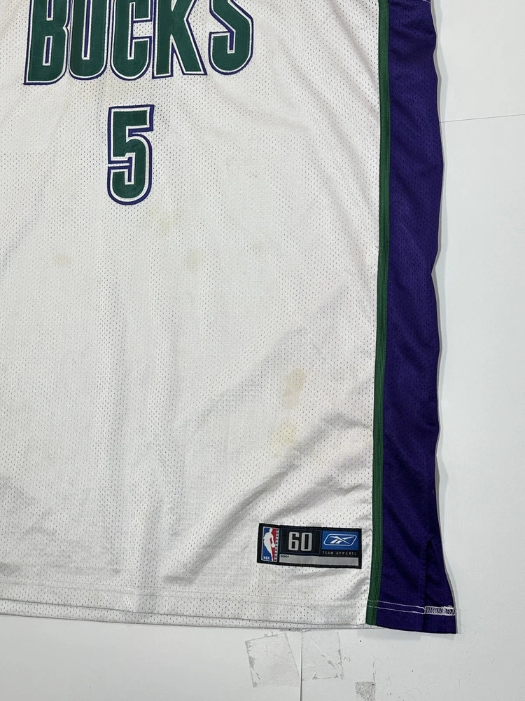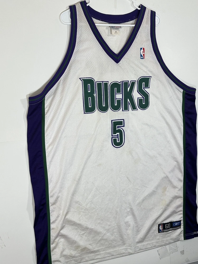 Vintage Reebok Authentic NBA Milwaukee Bucks Tim Thomas #5 Jersey Size 60 HUGE Sewn RARE Decent - to - pretty good condition overall - see ALL photos very closely - worn white jersey - only flaws little stains throughout - READ Massive huge jersey size - Size 60 - see tag Jersey is in pretty solid condition overall - has light - moderate wear/tear overall - however jersey has faint little stains/marks throughout both sides of the jersey - mostly on front side - some on back side too - stains are mid chest area to bottom trim throughout - little stains /marks small - mid size only flaws - see ALL photos very closely for condition of jersey Will ship with care