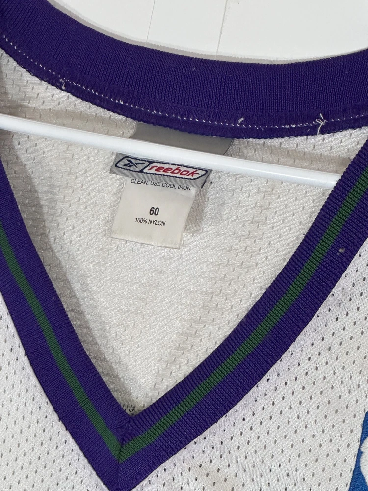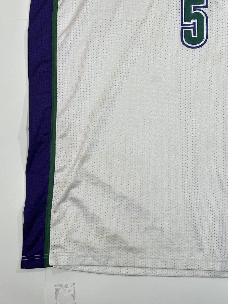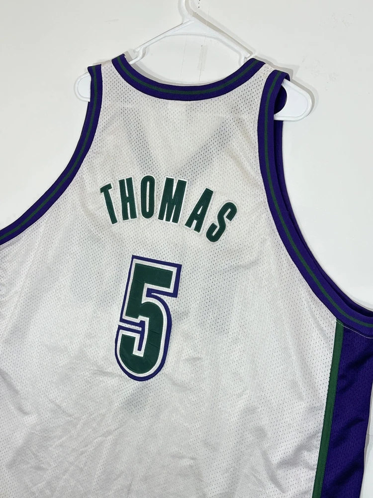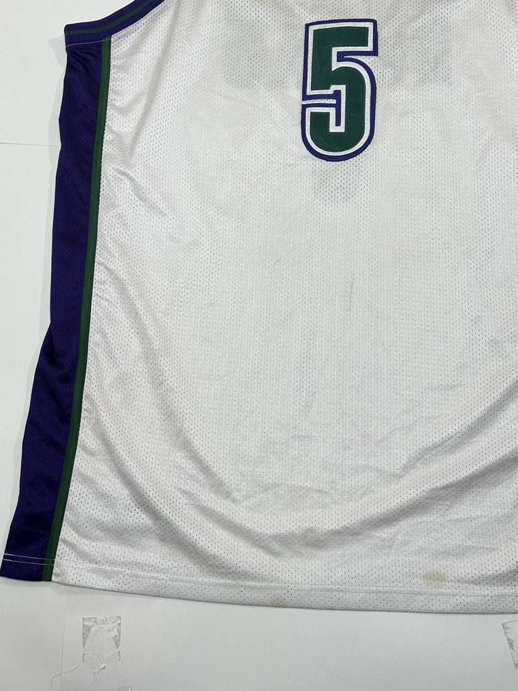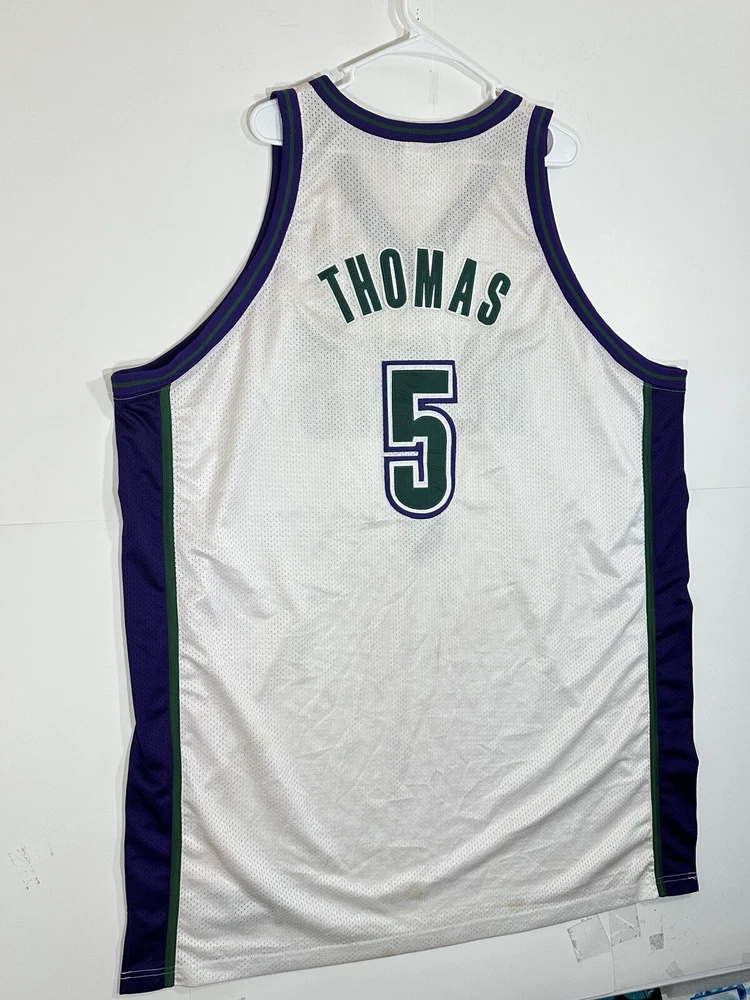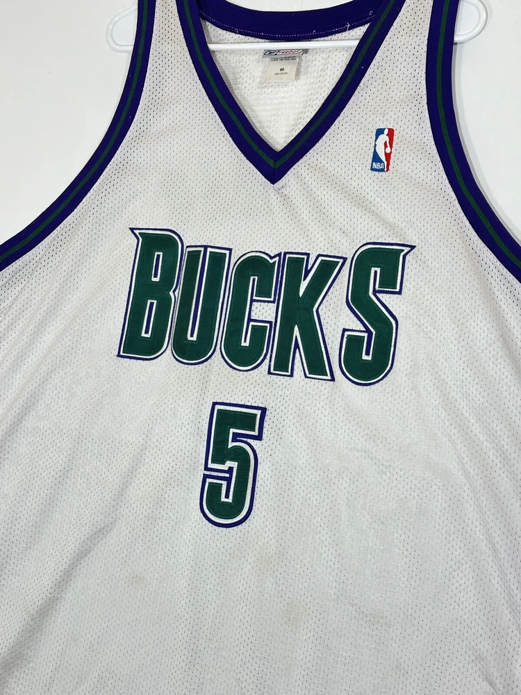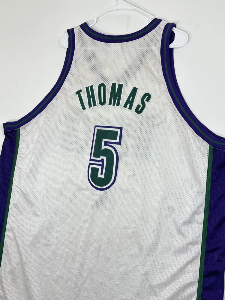 Vintage Reebok Authentic NBA Milwaukee Bucks Tim Thomas #5 Jersey Size 60 HUGE Sewn RARE Decent - to - pretty good condition overall - see ALL photos very closely - worn white jersey - only flaws little stains throughout - READ Massive huge jersey size - Size 60 - see tag Jersey is in pretty solid condition overall - has light - moderate wear/tear overall - however jersey has faint little stains/marks throughout both sides of the jersey - mostly on front side - some on back side too - stains are mid chest area to bottom trim throughout - little stains /marks small - mid size only flaws - see ALL photos very closely for condition of jersey Will ship with care