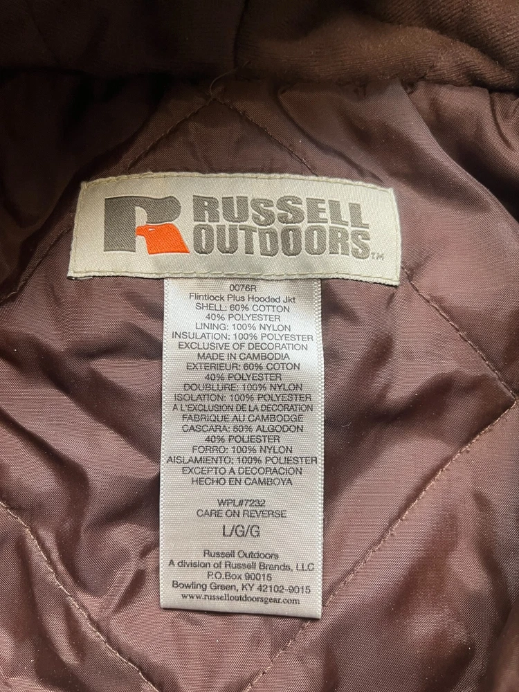 Size: L Pattern: Camouflage Gender: Men Features: Hood Color: Multi-Color Seller Notes: “excellent used condition” Size Type: Regular Brand: Russell Outdoors Material: Cotton Blend