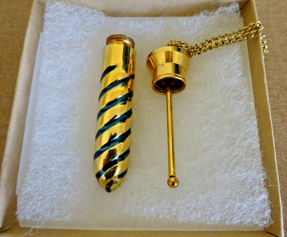 For your consideration is a solid brass perfume bottle pendant with brass threaded cap dauber. It comes on a 30" chain. It is part of an estate jewelry collection and is in very good, clean condition. It shows slight signs of usage. I try to describe evident defects, but may miss some, which does not constitute an item "Not as Described". Any color spots or discoloration you may see is a reflection unless described otherwise. This item is sold "as pictured and as described", so please ask questions before bidding. All items are satisfaction money back guaranteed. Winning bidder pays S&H. I combine S&H on multiple purchases .