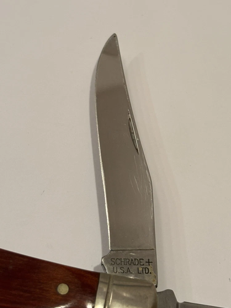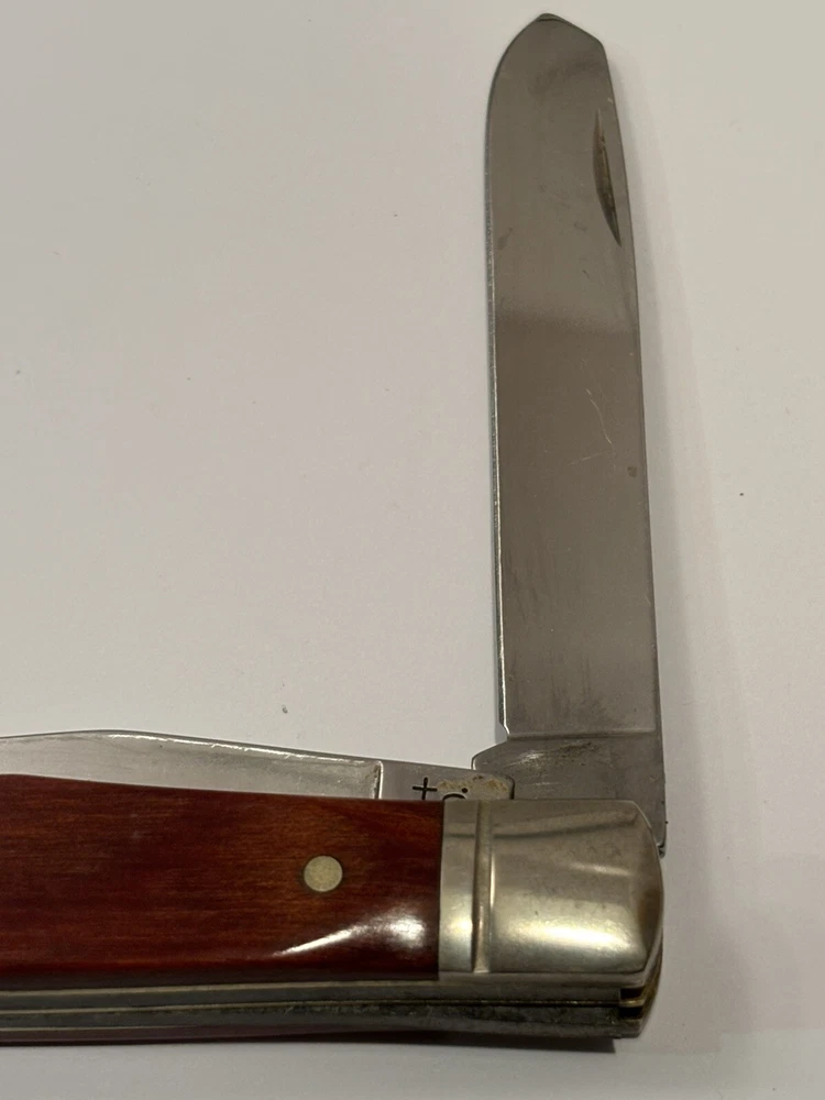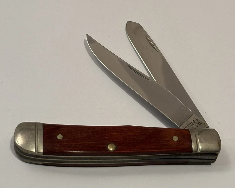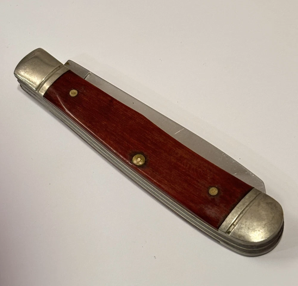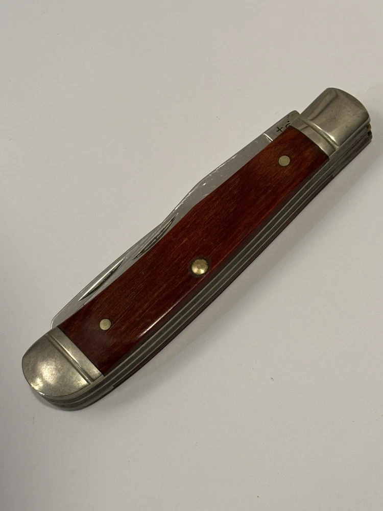 Crafted for both collectors and practical use, the VTG Schrade + USA LTD. 2 Blade Tapper is a premium pocket knife that combines functionality with a touch of vintage charm. Its solid cherry wood handle provides a comfortable grip, ensuring ease of use and a classic aesthetic that knife enthusiasts appreciate. Looks unused. Measures 4” end to end.
