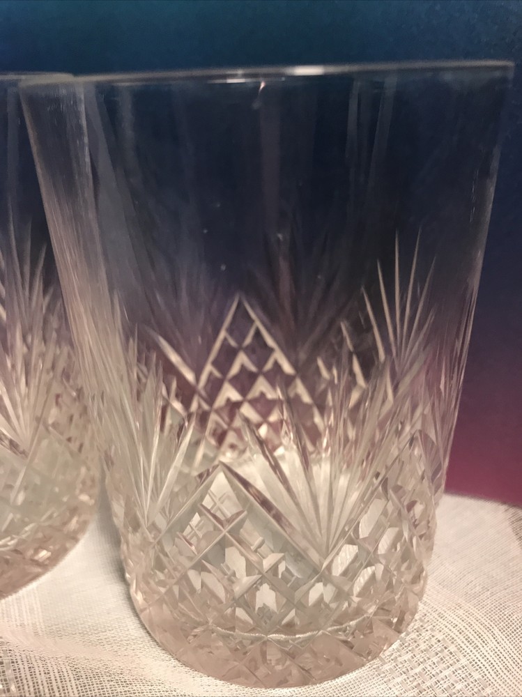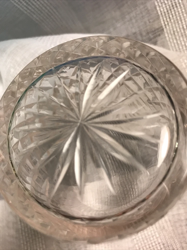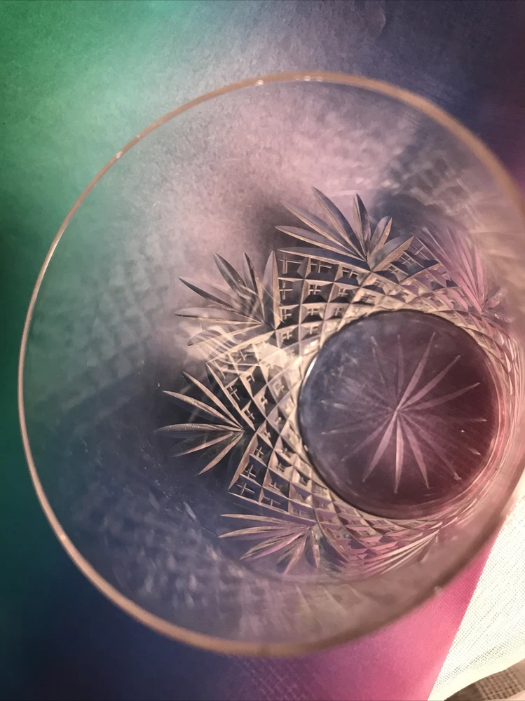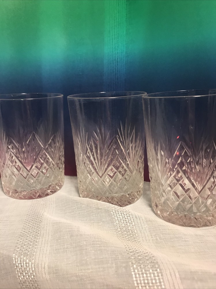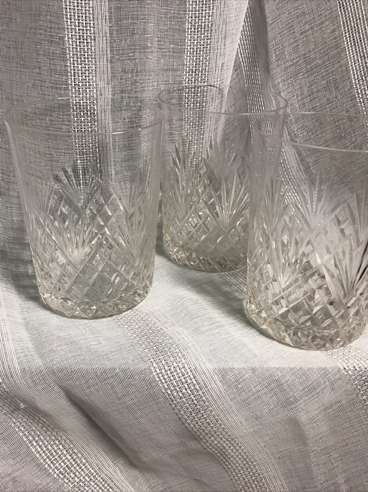 CLEAR Starburst BOTTOM CLEAR BEVERAGE Juice Cordial Drinking Glass. Set of 3 Item sold as shown please see photos for all details including measurements and condition immediate ship will combine ship Collectible, vintage Replacement pieces Delicate Diamond cut pattern , palm frond Vintage estate collectible pieces Add elegance and style to your dining table with this vintage set of 3 clear drinking glasses. The round glasses feature a starburst cut design with a diamond pattern that is perfect for all occasions. Made of high-quality glass, these glasses have a capacity to hold cordial and juice drinks, making them perfect for teens, boys, adults, and kids. The set includes three glasses, each measuring the perfect size for comfortable drinking. The clear glasses have a unisex design, making them suitable for both boys and girls. Whether you are hosting a party or enjoying a quiet dinner at home, these glasses will add a touch of sophistication to your table setting.