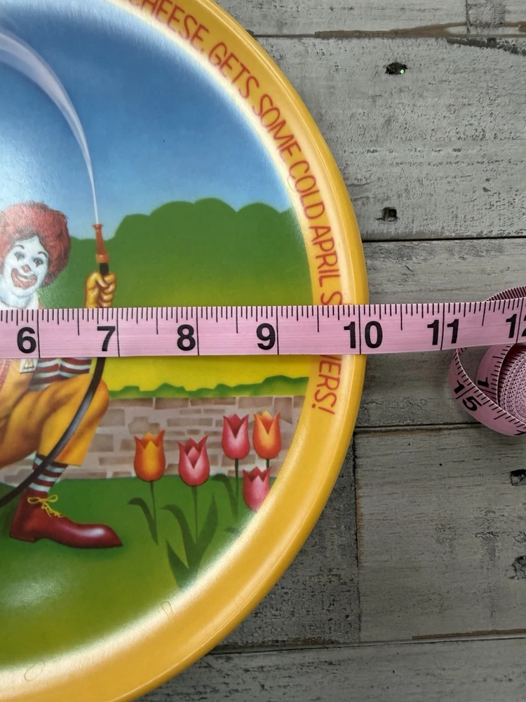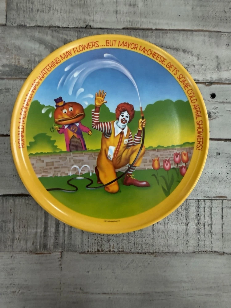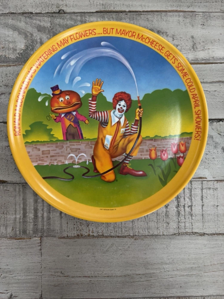 The product is a set of four 10" plastic plates featuring Ronald McDonald's character design, produced by McDonald's. The plates are multi-color and fall under the theme of restaurants & fast food collectibles. This vintage set is an original piece of advertising memorabilia from the fast-food giant, making it a unique and nostalgic addition to any collection.