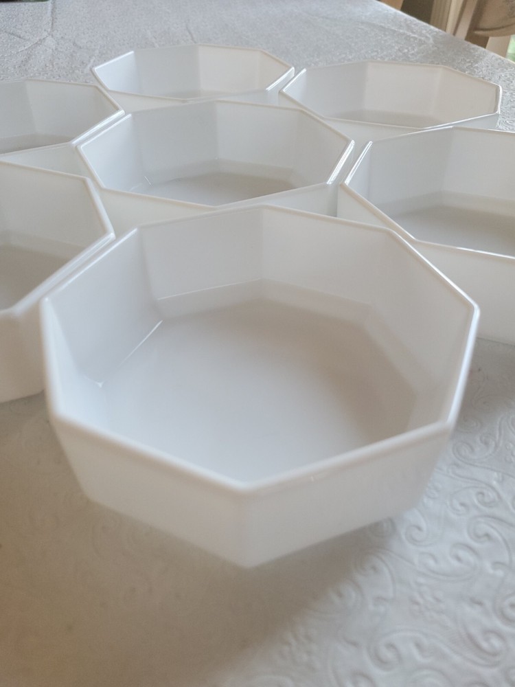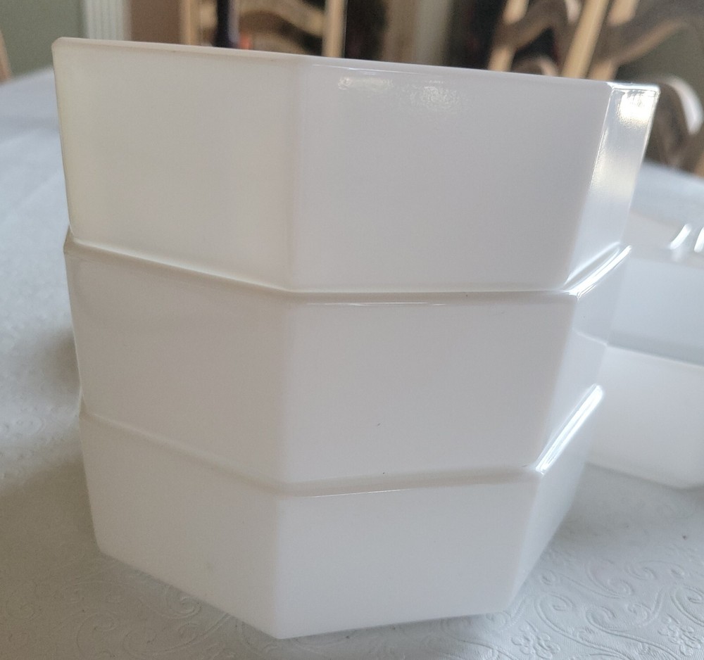 Enhance your dining experience with this vintage seven-piece bowl set from Arcoroc. The white milk glass bowls feature a geometric shape and a glossy finish that complement any table setting. Measuring six inches in diameter and one and a half inches in height, these bowls are perfect for serving salads, fruits, or desserts. The set includes six bowls and is impressed with the Arcoroc backstamp, which adds a touch of elegance to your tableware collection. Made in France during the 1980s, these bowls are a perfect addition to your decorative cookware, dinnerware, and serveware. No damage has been noted. E-mail me with questions. Thanks for checking out my auctions!