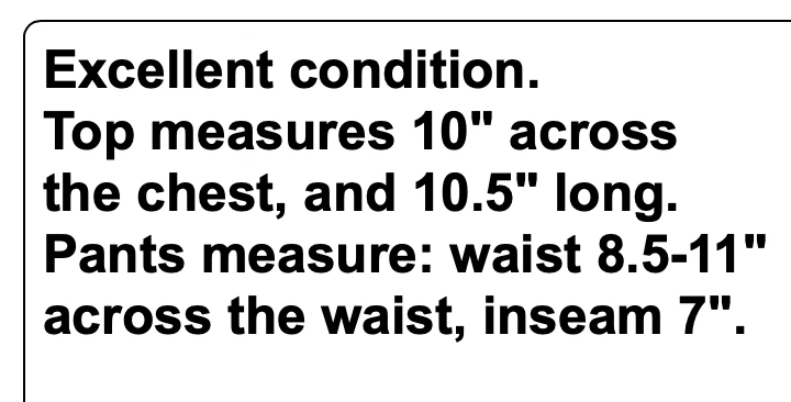 Excellent condition. Top measures 10" across the chest, and 10.5" long. Pants measure: waist 8.5-11" across the waist, inseam 7". THANK YOU EBAY!!! We are so thankful for our customers! We have thousands of listings, and therefore receive hundreds of messages, every single day. So, if you are asking about a price drop, or a shipping price drop, or asking for extra measurements, or to add additional photos, please allow me to answer you here, No thanks. If your question is not one of those questions, we will be /happy to answer you individually. YES...WE DO COMBINE DOMESTIC SHIPPING. Extra jewelry items ship for $2 each (except for large jewelry lots). We will refund the difference as we are mailing out.....we hope you enjoy shopping with us! We encourage you to read the description and check all photos.