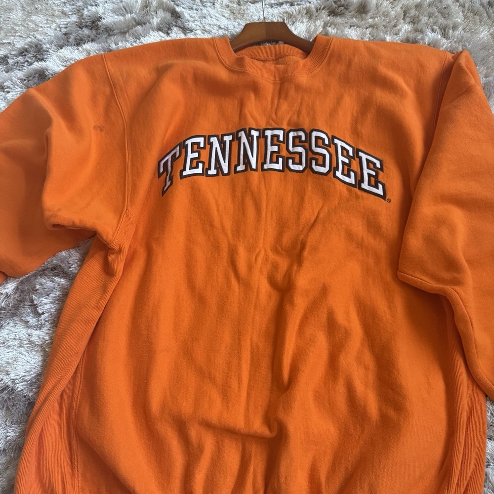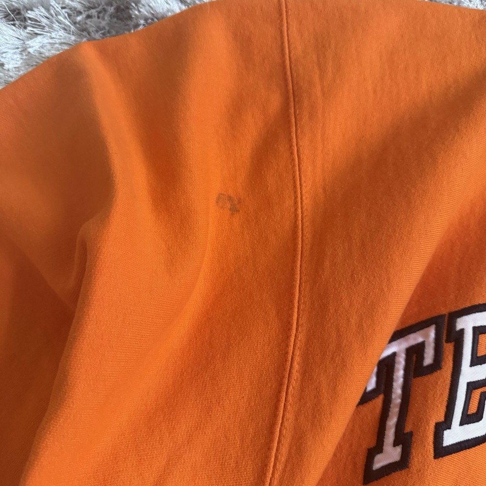 The VTG Steve & Barry's Tennessee Heavy Sweatshirt is a vintage-inspired piece featuring a crew neckline and long sleeves, making it perfect for the winter, fall, and spring seasons. This pullover sweatshirt in size L is made from a blend of polyester and cotton, providing a comfortable and warm fit. The orange color and embroidered logo accents give it a sporty and 90s-inspired look, ideal for any casual outfit. Easy to care for with machine washable instructions, this sweatshirt is a stylish and practical addition to any wardrobe. There is a small stain and it is pictured