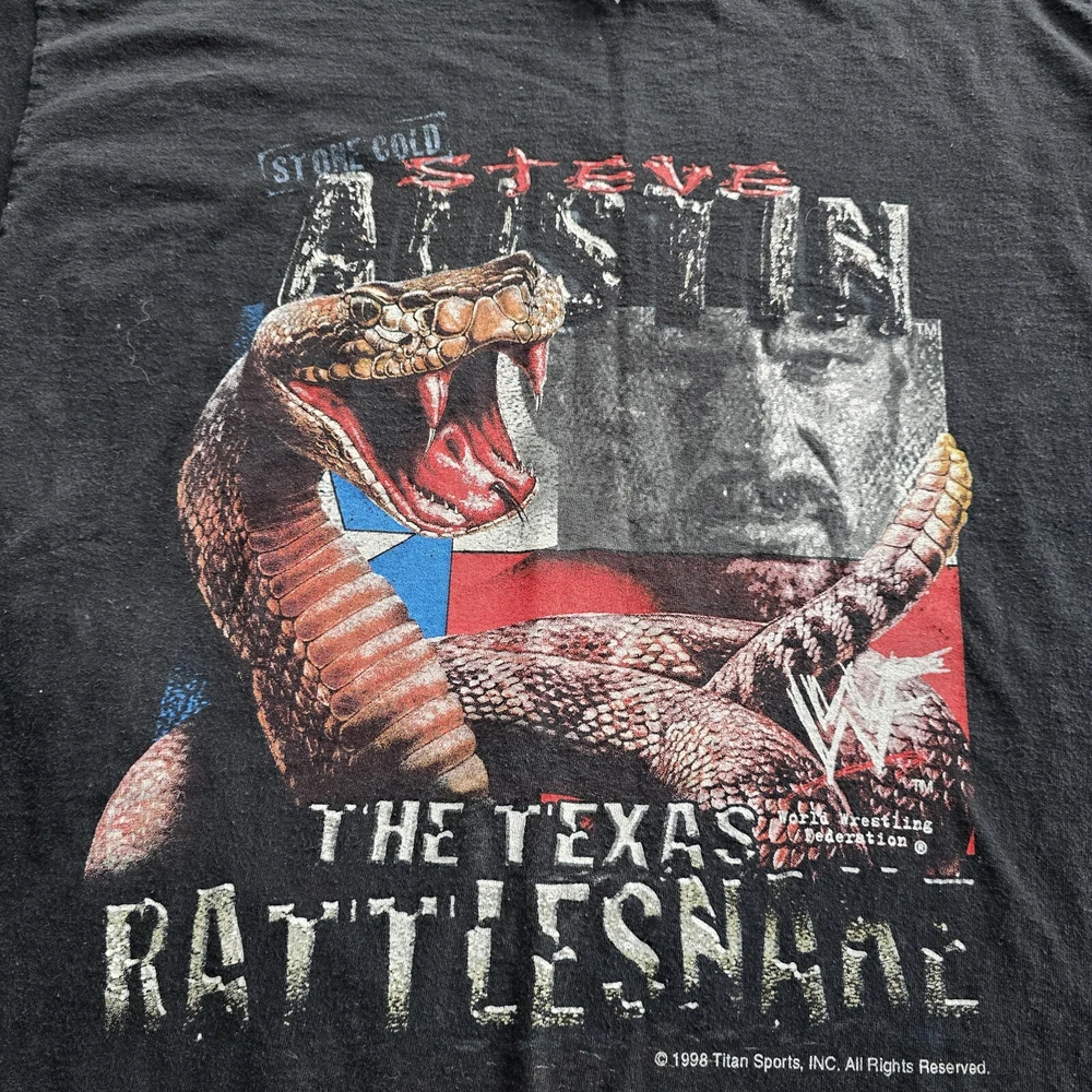 VTG Stone Cold Steve Austin Mens XL WWF Texas Rattlesnake WWE Shirt In good vintage condition Double stitched Hole under graphic 1998 Good graphic Chest: 22 Length: 29
