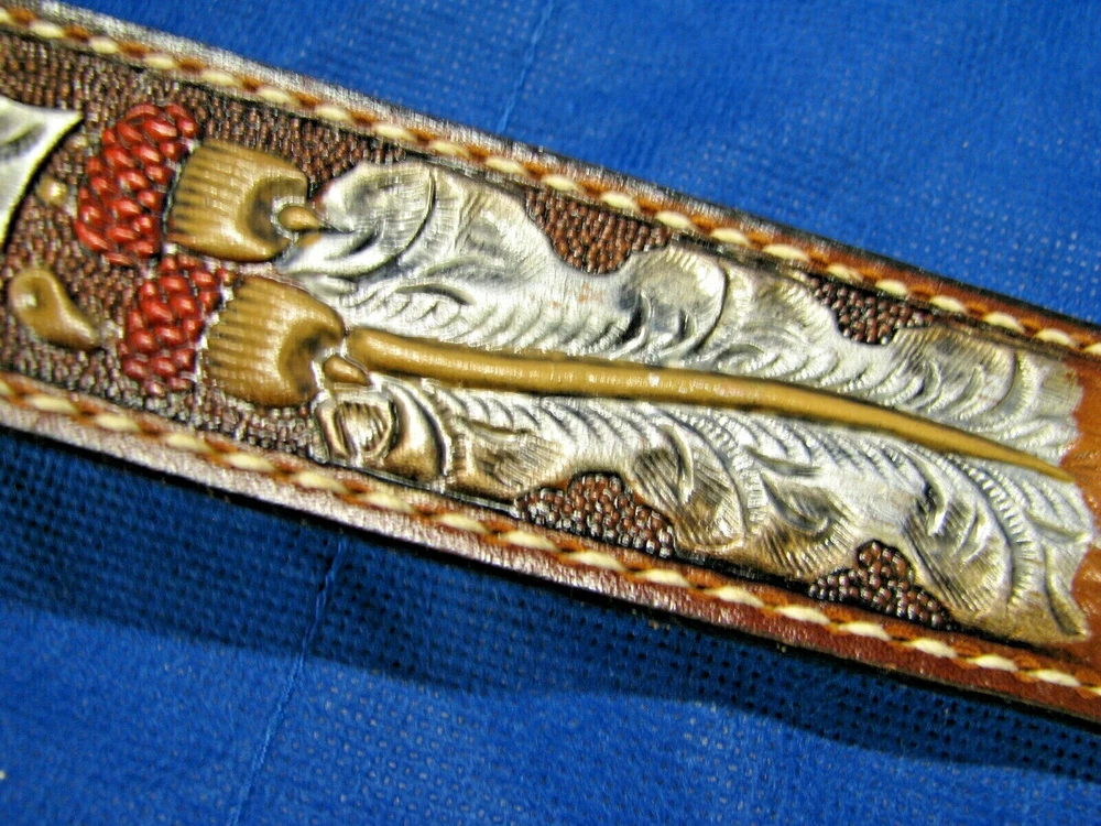 VTG TONY LAMA Belt BROWN/SILVER/RED "Susan" TOOLED LEATHER Brass Buckle 24/XXS