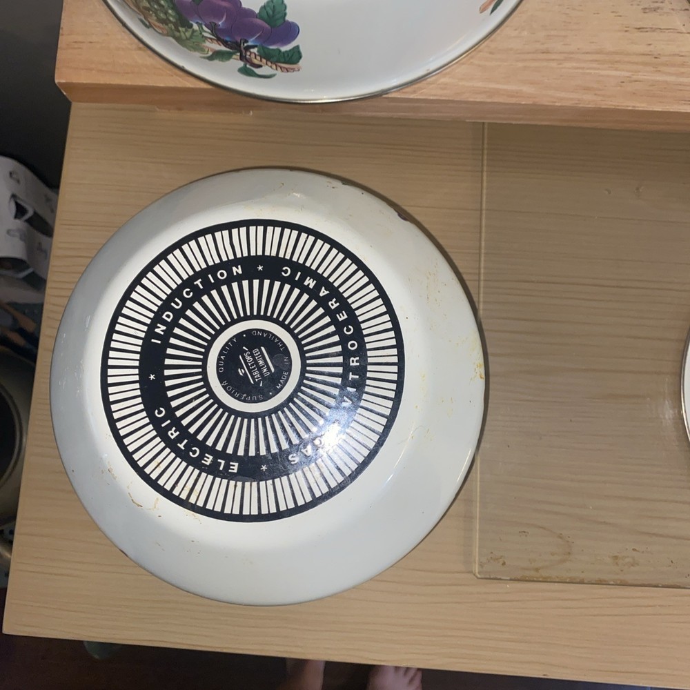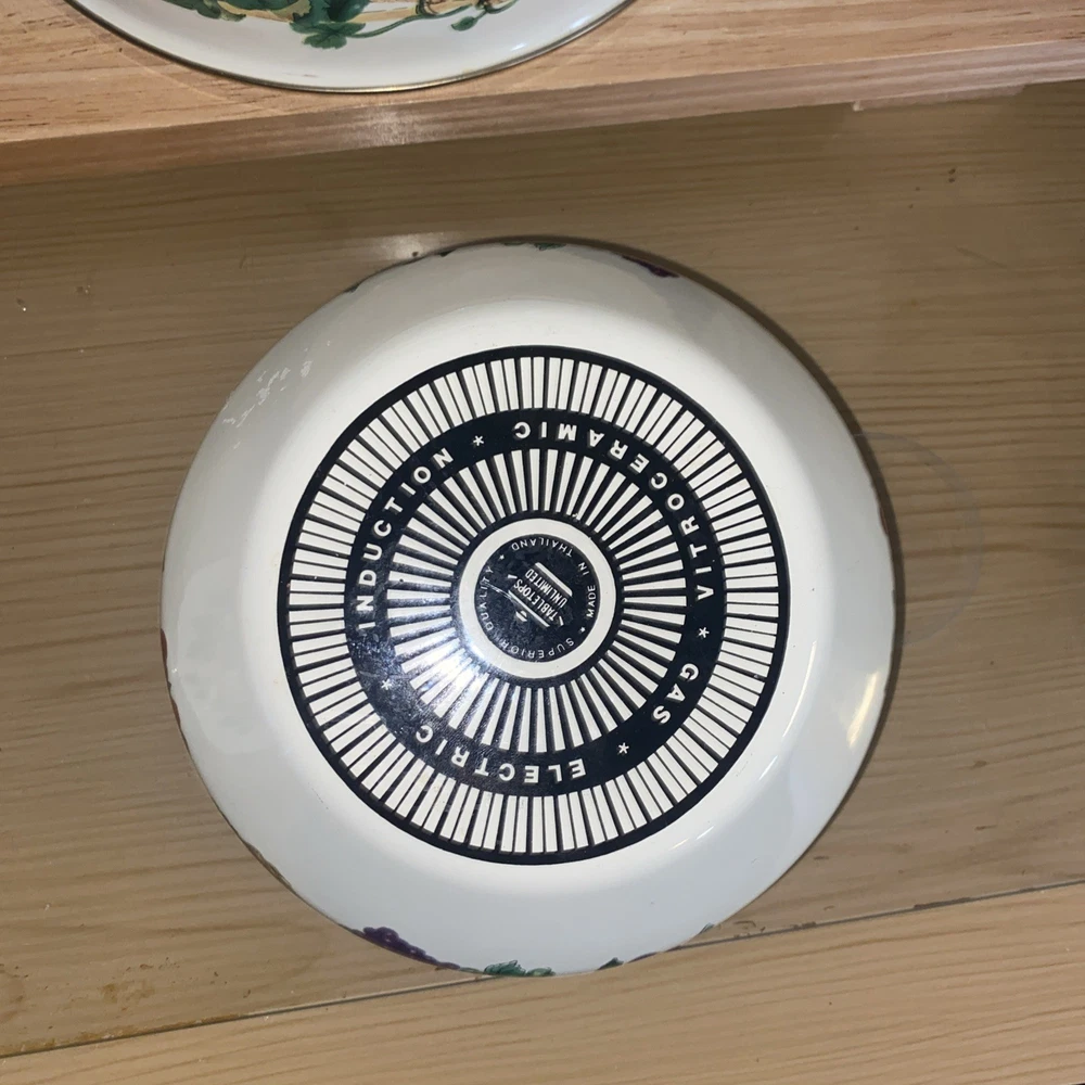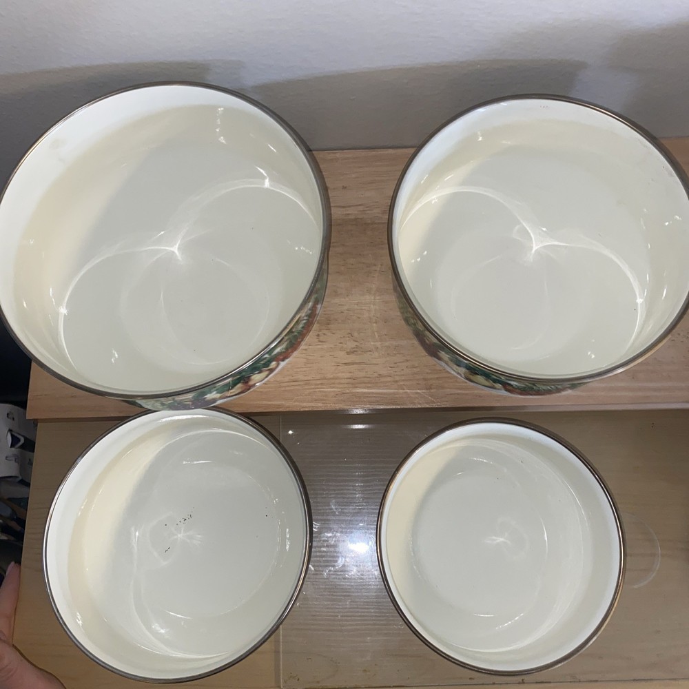 The VTG Tabletop Unlimited Vitroceramic Kensington Garden Bowls Set Of 4 is a vintage set of multicolor induction pans with a ceramic surface coating. These everyday induction pans are original and vary in capacity. Perfect for adding a touch of nostalgia to any kitchen, these bowls are designed for use on induction stoves and can add a whimsical touch to your cooking experience. Please look at photos - two of the bowls have silver rims the other two are goldish. Overall good condition see photos though for Minor imperfections