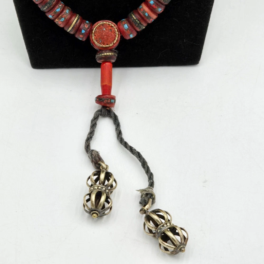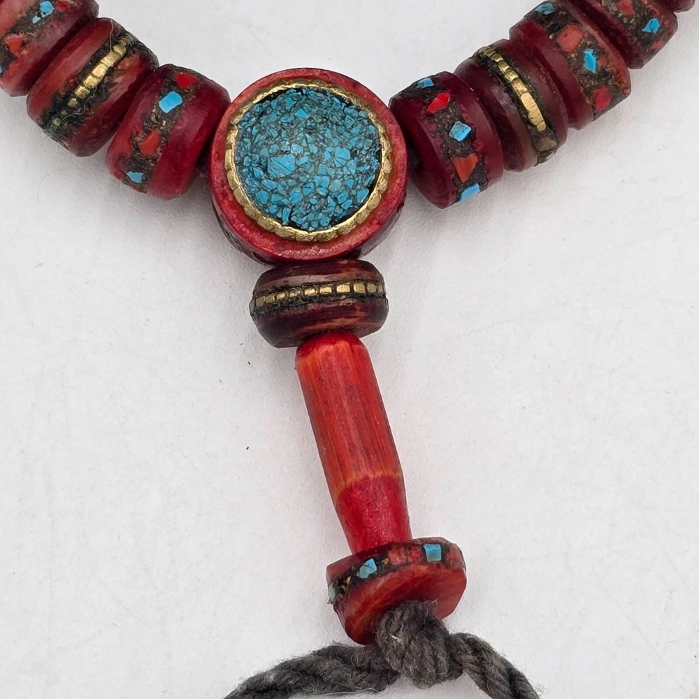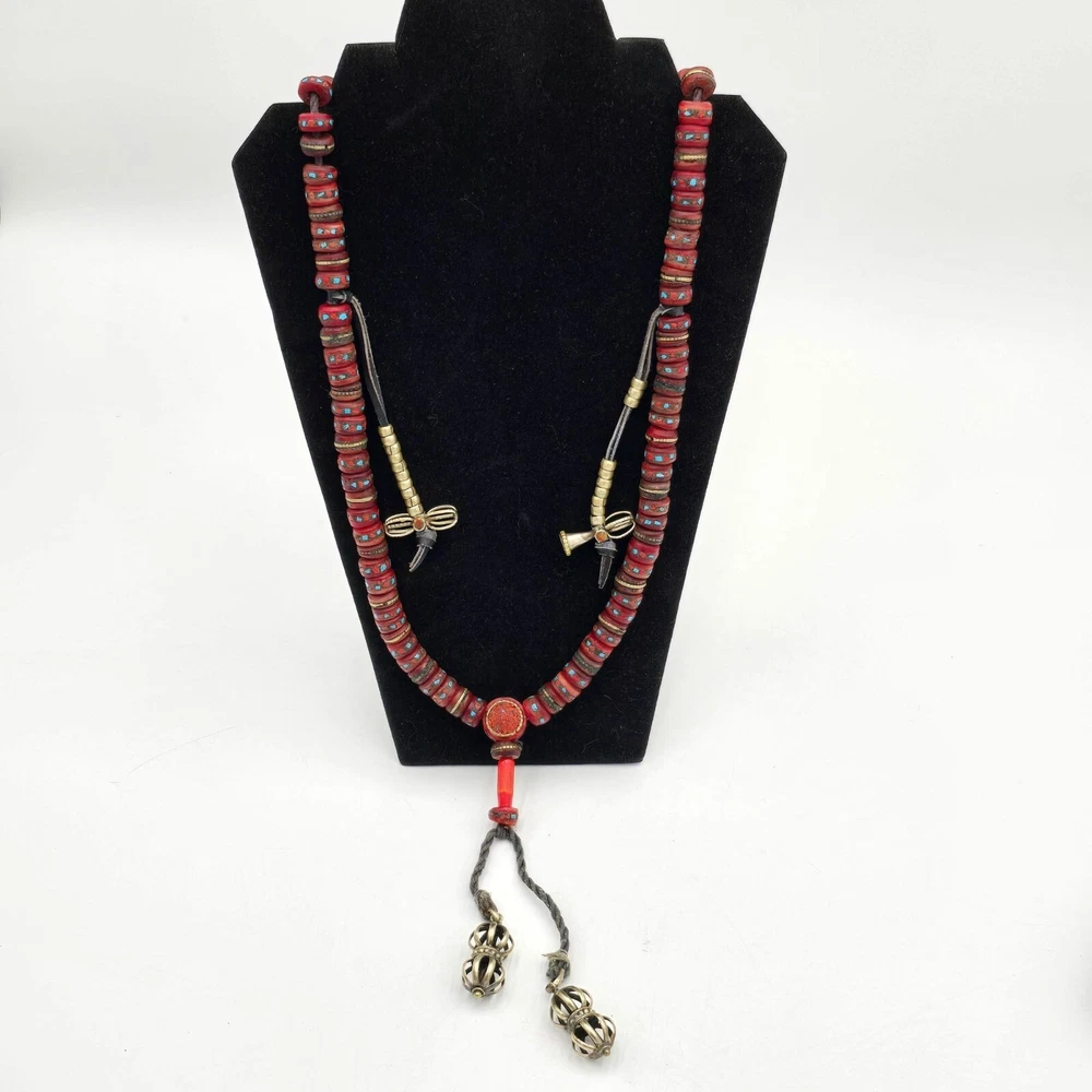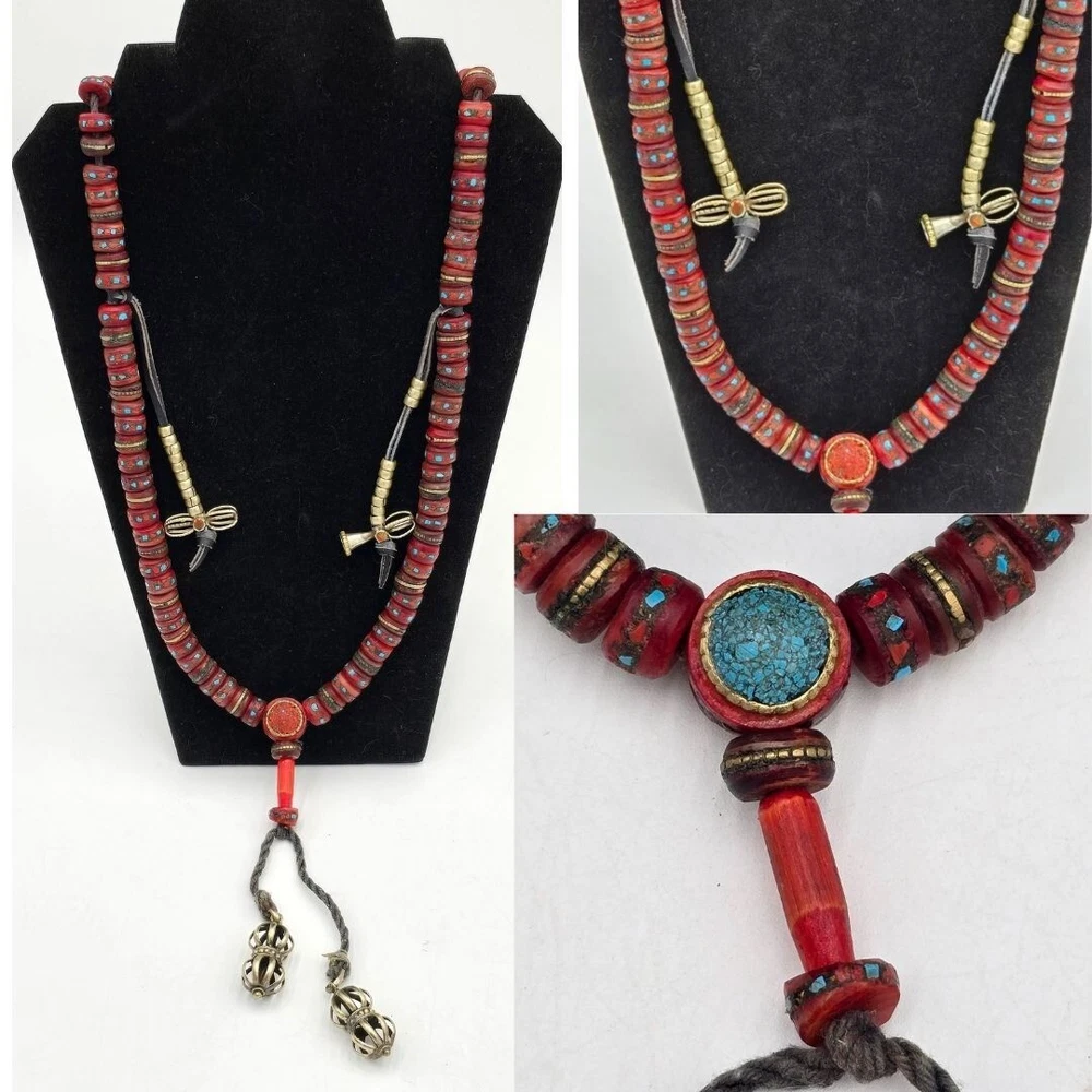 Handcrafted using traditional Tibetan techniques, this necklace features intricate beads with brass and turquoise accents. Ideal for adding an exotic touch to your ensemble. • Handmade craftsmanship • Brass and turquoise beads • Unique Tibetan design • Inlay brass and turquoise • Lightweight and comfortable Features: • Red Ones are a Rare Find! • Leather Cords • Two Brass Bell and Dorje Counters • 11-12mm Diameter Beads • Japa Mala Includes a Large, Guru Bead with Crushed Turquoise • Mala Prayer Beads, Inlay Accents • 36" Total Length Size: Unisex 30" Condition: Pre-Owned Good Good condition Gently used There's a small frayed cord attached to the bells, see pic 4 There may be some scratches due to normal use. Please read the description for further details and measurements, Thank you!