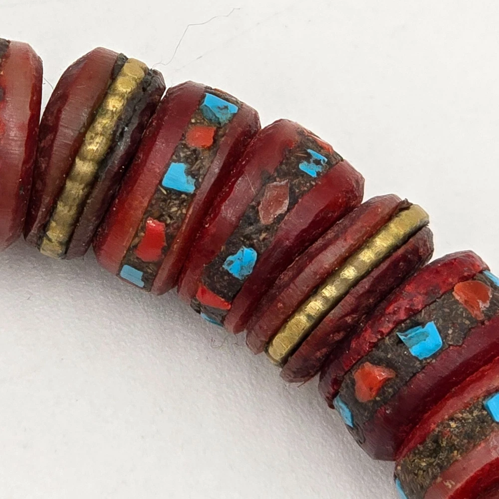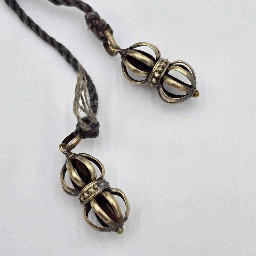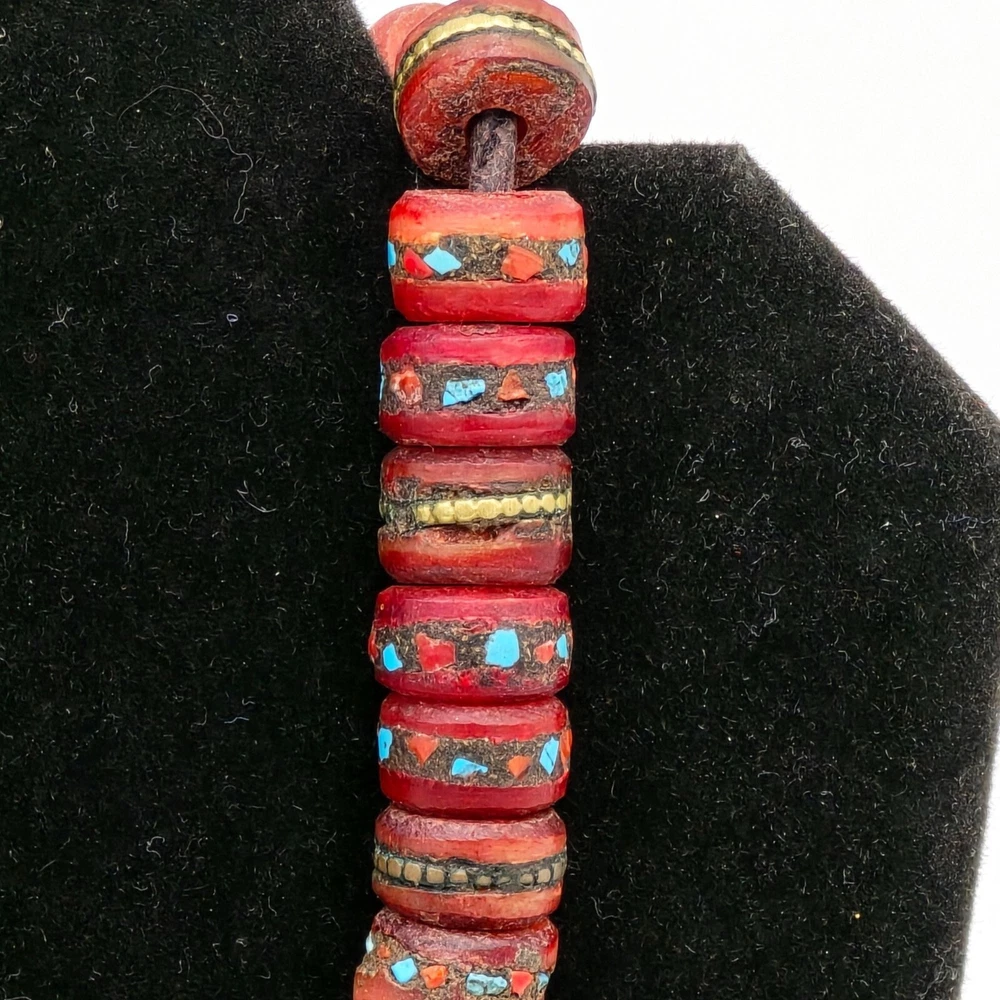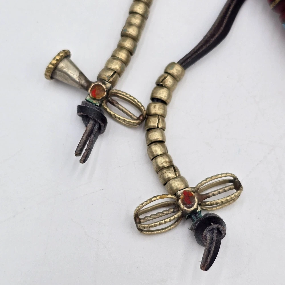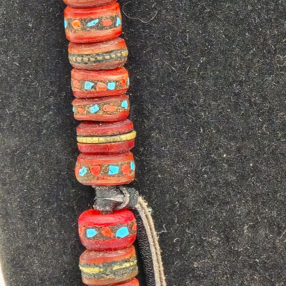 Handcrafted using traditional Tibetan techniques, this necklace features intricate beads with brass and turquoise accents. Ideal for adding an exotic touch to your ensemble. • Handmade craftsmanship • Brass and turquoise beads • Unique Tibetan design • Inlay brass and turquoise • Lightweight and comfortable Features: • Red Ones are a Rare Find! • Leather Cords • Two Brass Bell and Dorje Counters • 11-12mm Diameter Beads • Japa Mala Includes a Large, Guru Bead with Crushed Turquoise • Mala Prayer Beads, Inlay Accents • 36" Total Length Size: Unisex 30" Condition: Pre-Owned Good Good condition Gently used There's a small frayed cord attached to the bells, see pic 4 There may be some scratches due to normal use. Please read the description for further details and measurements, Thank you!
