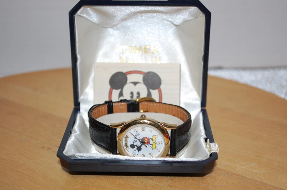 We do our very best to put quality items in our store, but if you are unhappy with your purchase we accept returns thru eBay's 30-day money back guaranty. We will ship same day, if possible, otherwise the next day Monday thru Friday. Thank you for shopping with us. Items ship Quickly. This vintage Timex Marlin watch is a must-have for any Disney fan. With its Mickey Mouse design, this watch is a unique and exclusive piece from The Disney Store. Made in Japan in 1996, it features a day and date function, making it a practical addition to any collection. The watch is sure to impress any watch collector or Disney enthusiast.