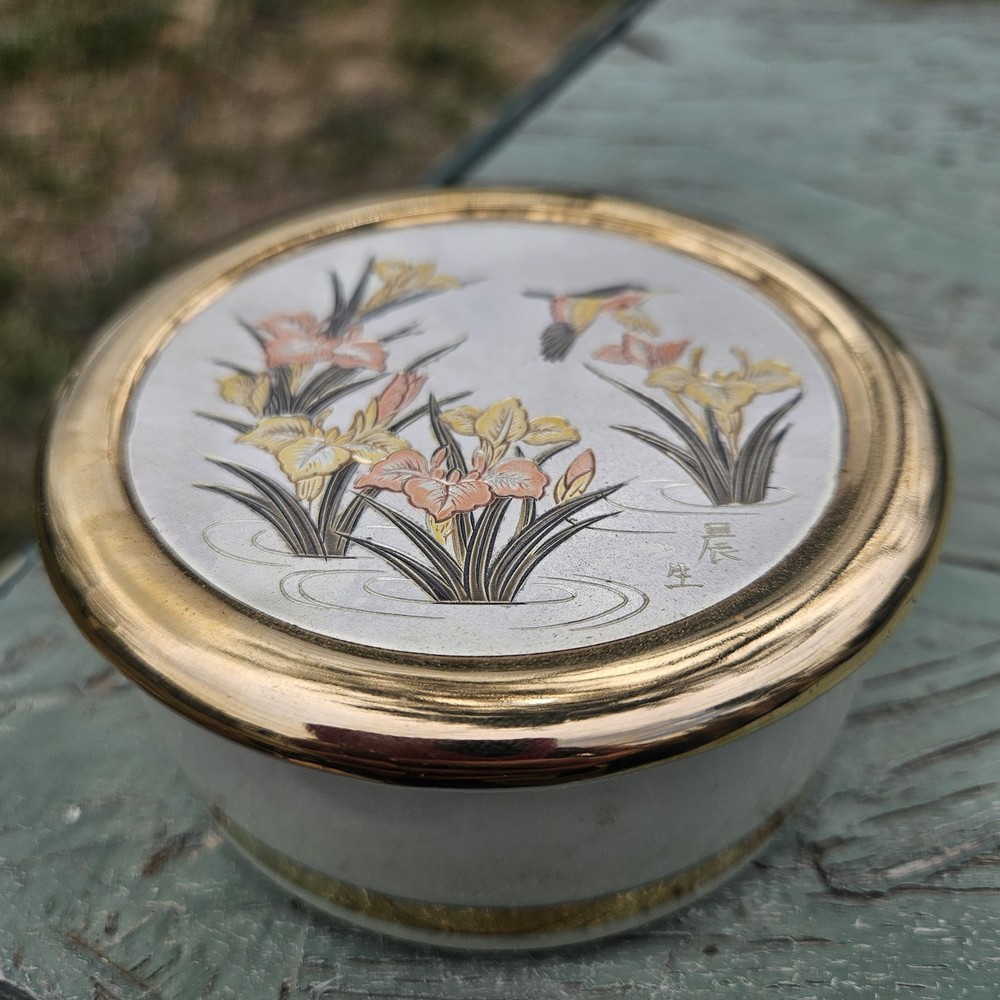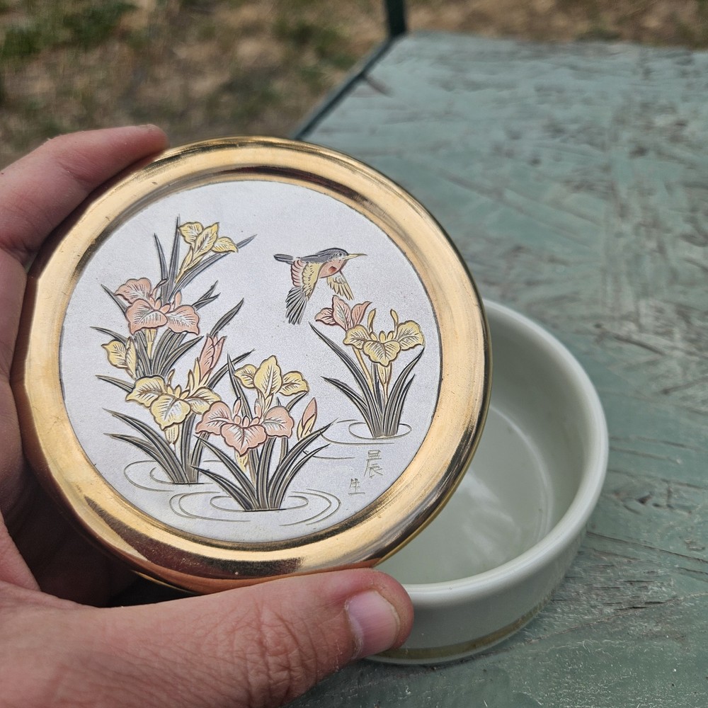 Original/Reproduction:OriginalType:Trinket BoxStyle:AsianCollection:Keepsake BoxesColor:MulticolorShape:RoundDepartment:AdultsCountry/Region of Manufacture:JapanYear Manufactured:1974Custom Bundle:NoRoom:Any RoomOccasion:All OccasionsFinish:GoldMaterial:Porcelain, Silver, GoldBrand:Art of ChokinTheme:Art, BirdsTime Period Manufactured:1970-1979Features:EtchedEra:Late 20th Century (1970-1999)Size:SmallSubject:HummingbirdCustomized:NoPattern:GildedNumber in Pack:1Additional Parts Required:NoHandmade:YesEngraved:Yes