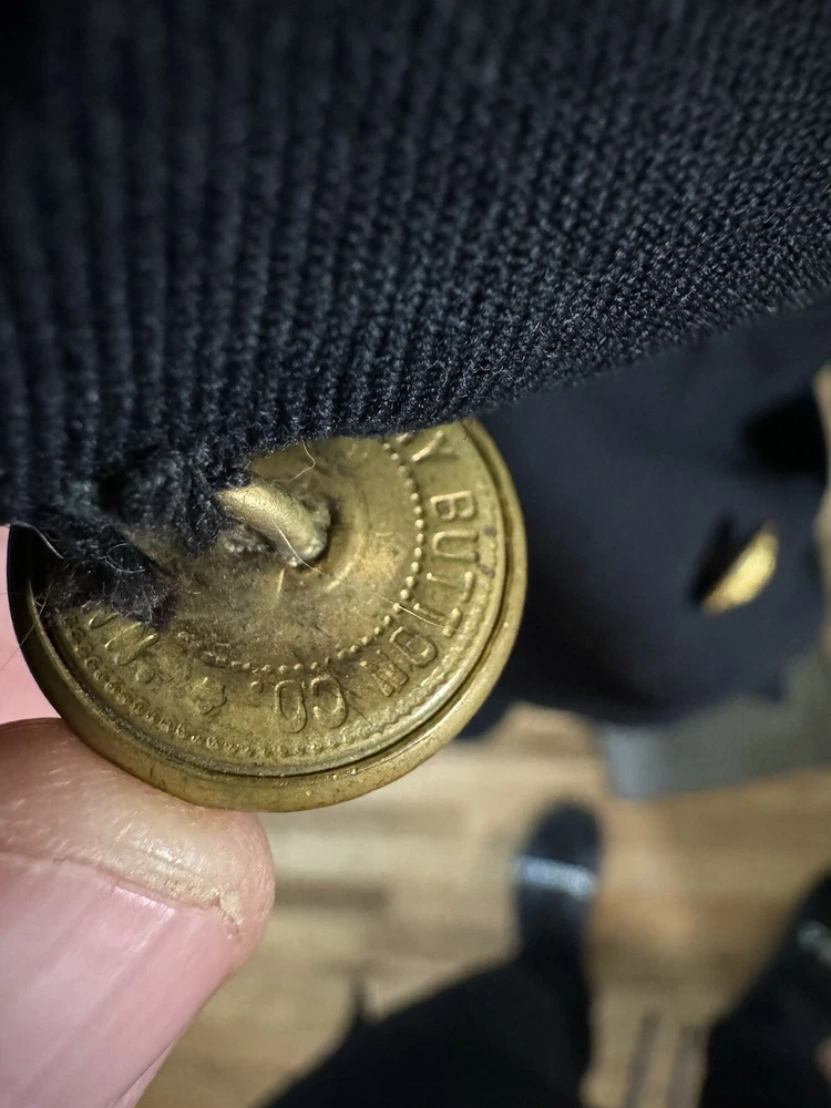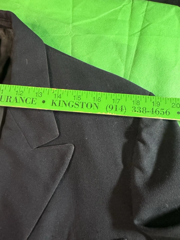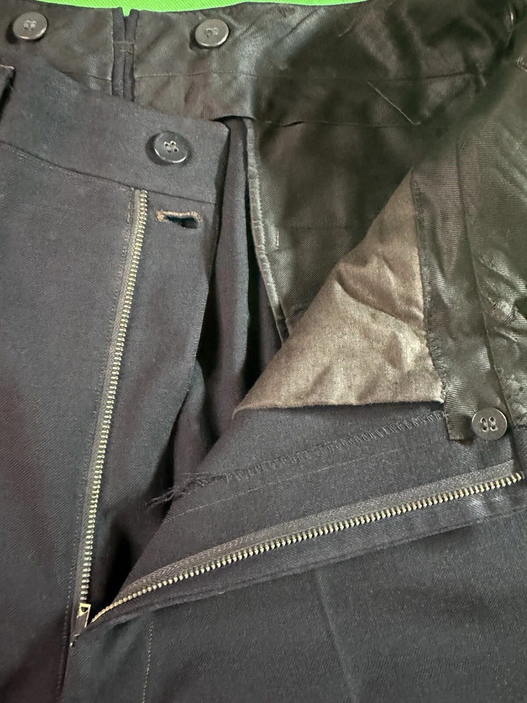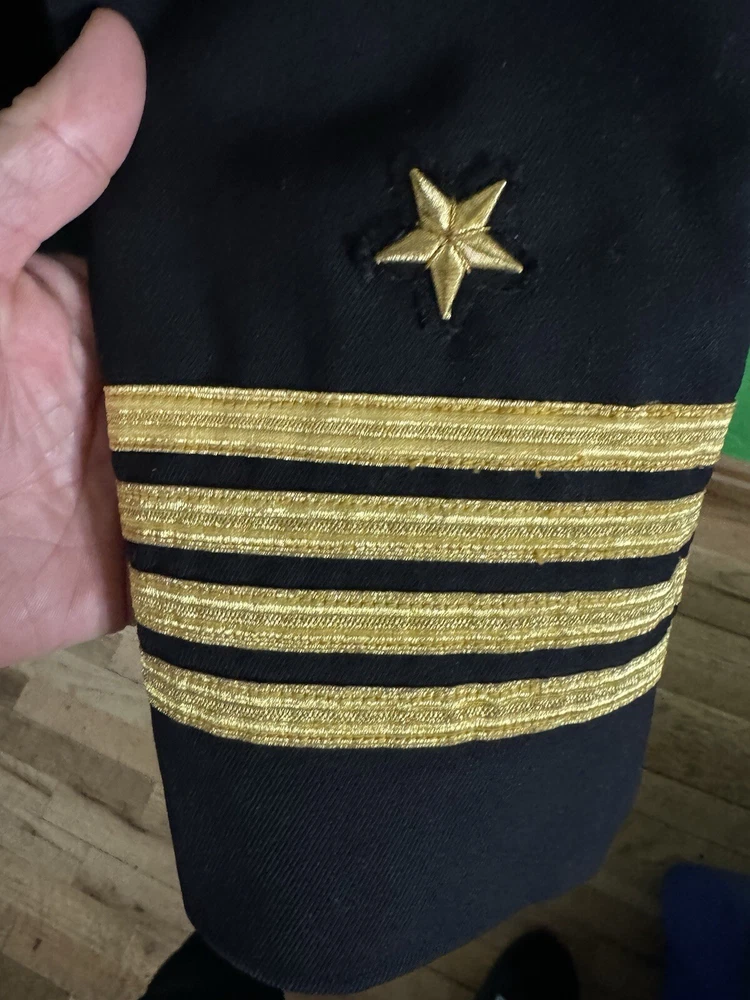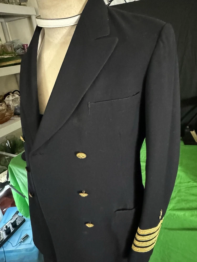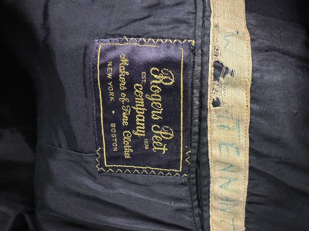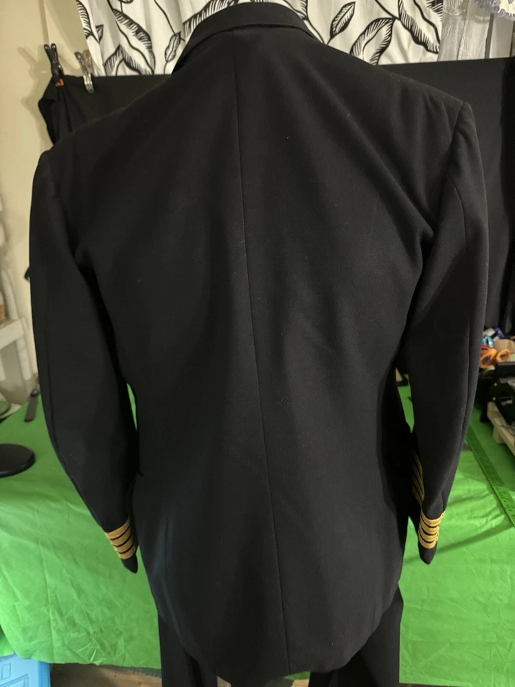 Vintage U.S. Navy Captain’s Dress Uniform – Double-Breasted Jacket & Pants – Rogers Peet Co. Description: This vintage U.S. Navy officer’s uniform includes a double-breasted dress jacket and matching pants, tailored by the esteemed Rogers Peet Company of New York and Boston. The jacket features four gold sleeve stripes and a star, indicating the rank of Captain (O-6), as well as gold eagle buttons. A rare and collectible piece, perfect for military collectors, historical reenactments, or classic menswear enthusiasts. Details: • Era: Likely mid-20th century • Brand: Rogers Peet Company • Rank: Captain (O-6) – Four gold sleeve stripes with a star • Jacket Features: • Double-breasted design • Gold U.S. Navy eagle buttons • Peak lapels • Fully lined interior • Name tag sewn inside (partially faded) • Pants: Matching navy blue trousers included Condition: • Pre-owned vintage condition with some expected wear (please review photos). • Fabric is well-preserved, but minor signs of aging may be present. Shipping & Returns: • Ships within 1-2 business days • No returns, so please review all photos and ask any questions before purchasing. ⚓ A stunning and historic U.S. Navy officer’s uniform, perfect for collectors or display! ⚓