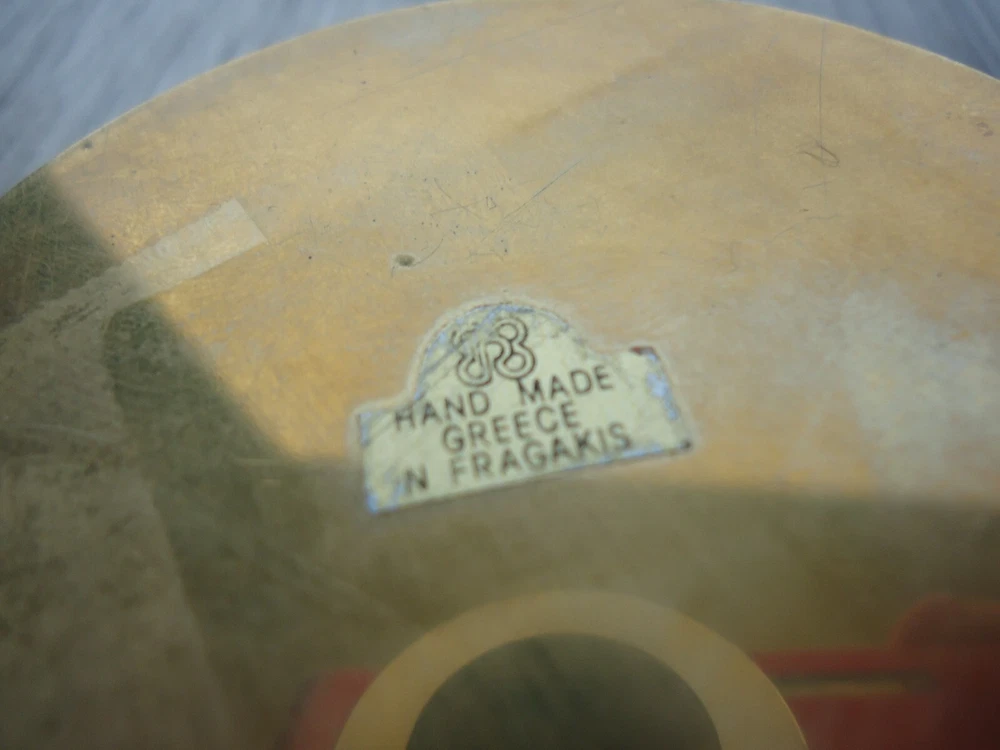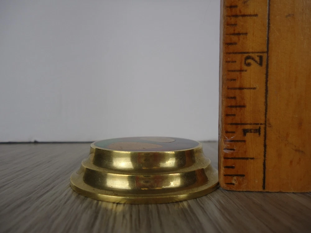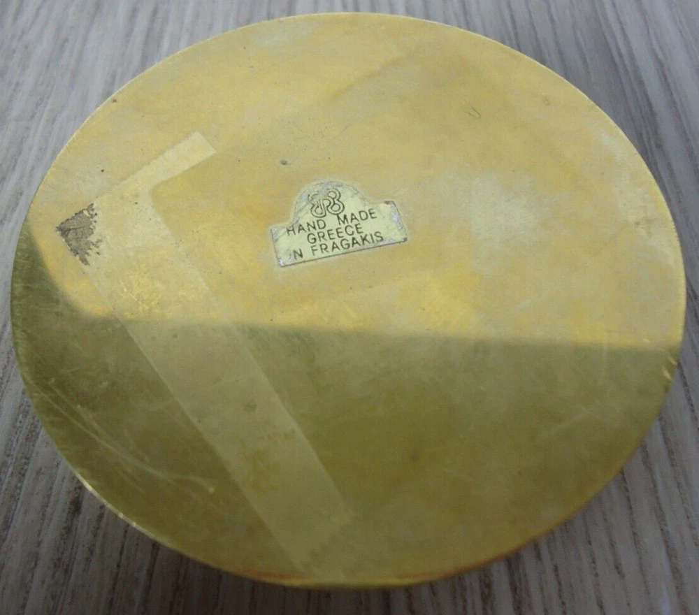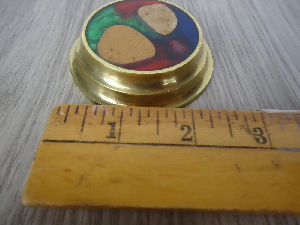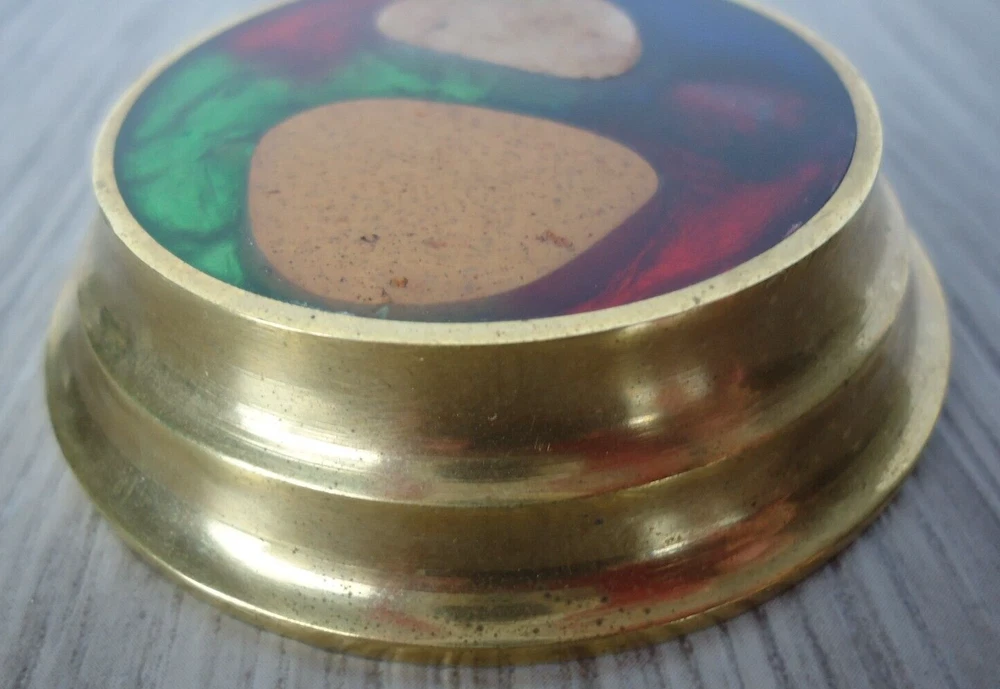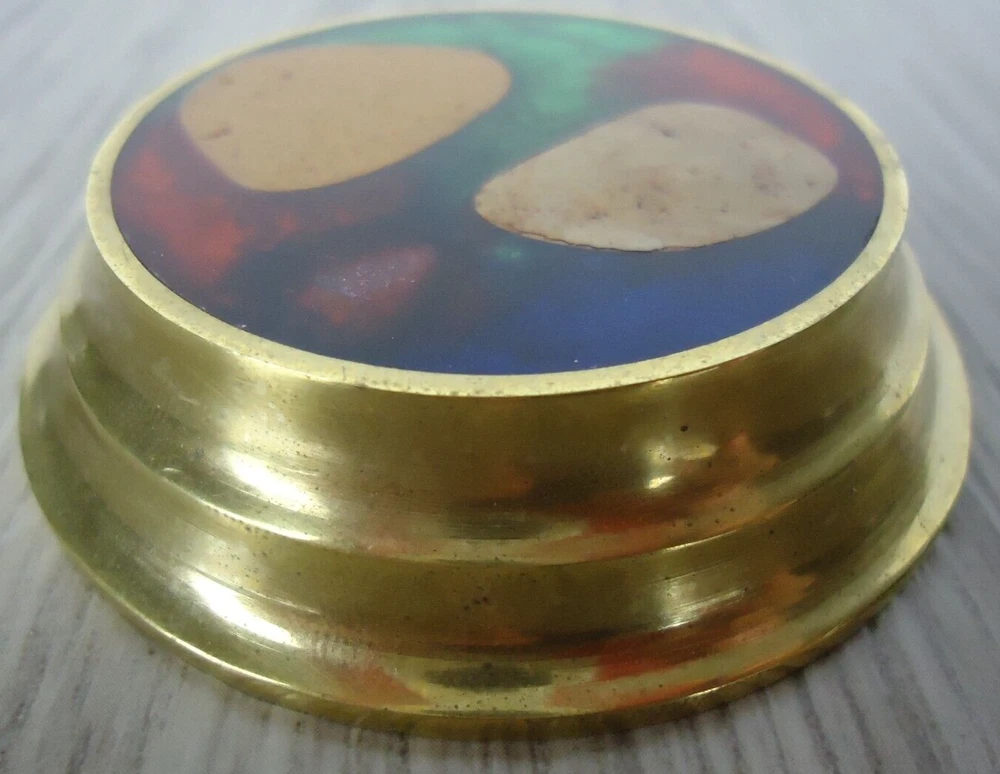 Seller Notes: “Preowned, great condition. Glows in blacklight.” Country/Region of Manufacture: Greece Material: Brass, Stone, Resin/Enamel ? MPN: NA Brand: N. Fragakis Color: Brass Red Blue Green Natural Stone Type: Brass Glow Paperweight Size: 5/8 in tall disc, 2 5/8 in diameter