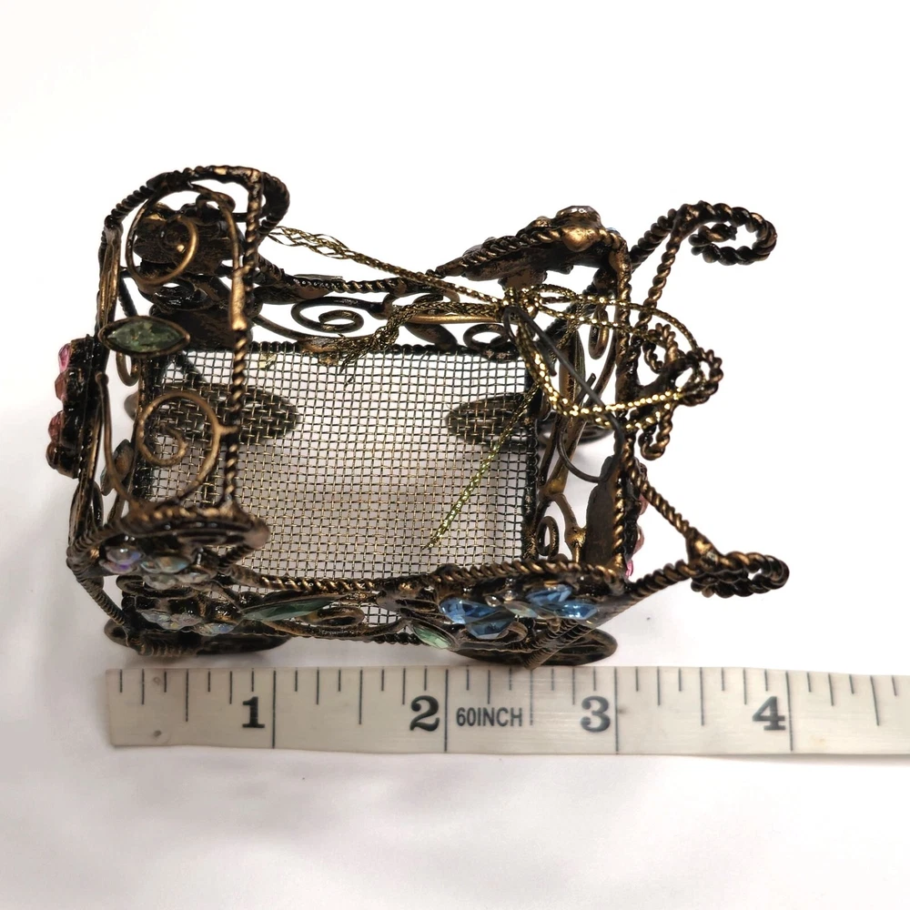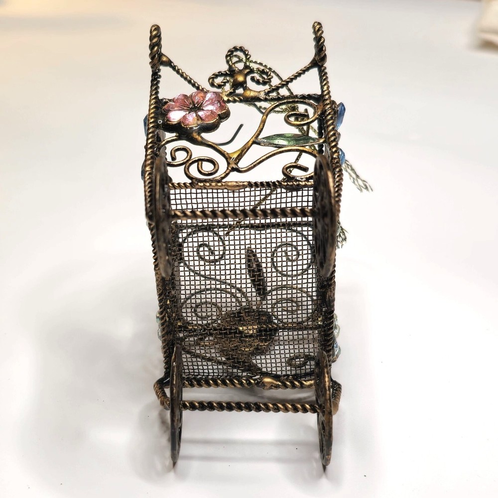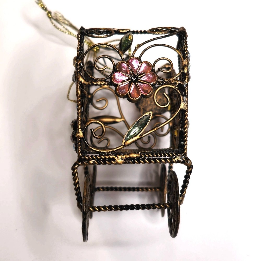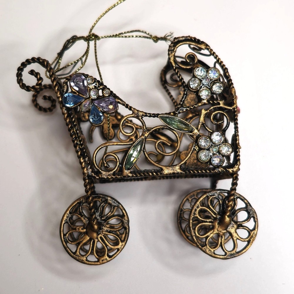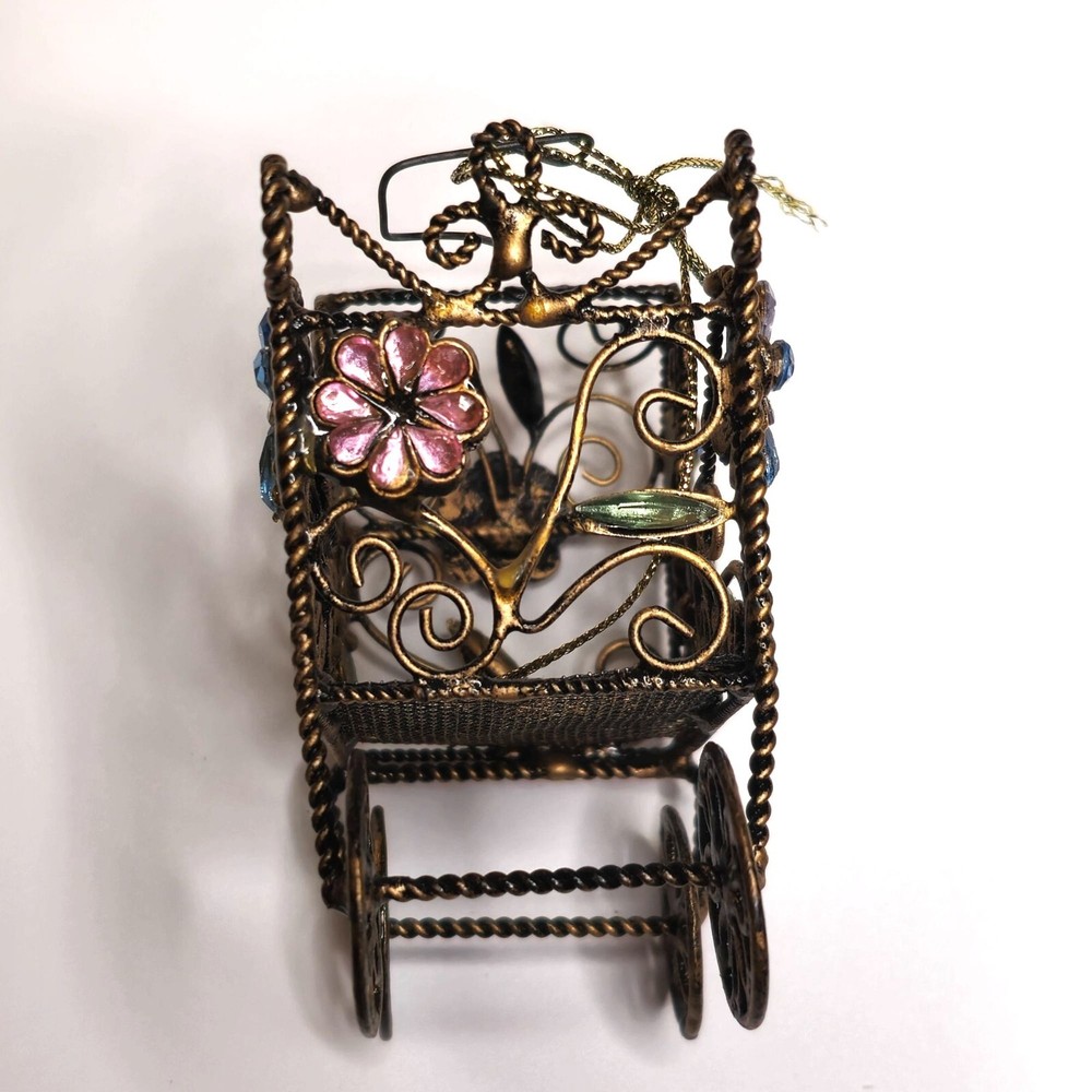 This intricately designed retro baby carriage features ornate floral and rhinestone accents, making it an exquisite decorative piece. Its unique craftsmanship and antique finish offer a touch of elegance and charm to any collection or decor setting. • Ornate metal wiring • Floral and rhinestone accents • Ornate craftsmanship • Antique style decorative piece • Unique design Features: • Hanging Ornament, Ornate Wire Details Size: 3" x 4" Condition: Pre-Owned Good Good condition Gently used Please be sure review all photos and description closely before purchasing, thank you! Smoke free work space Please read the description for further details and measurements, Thank you!