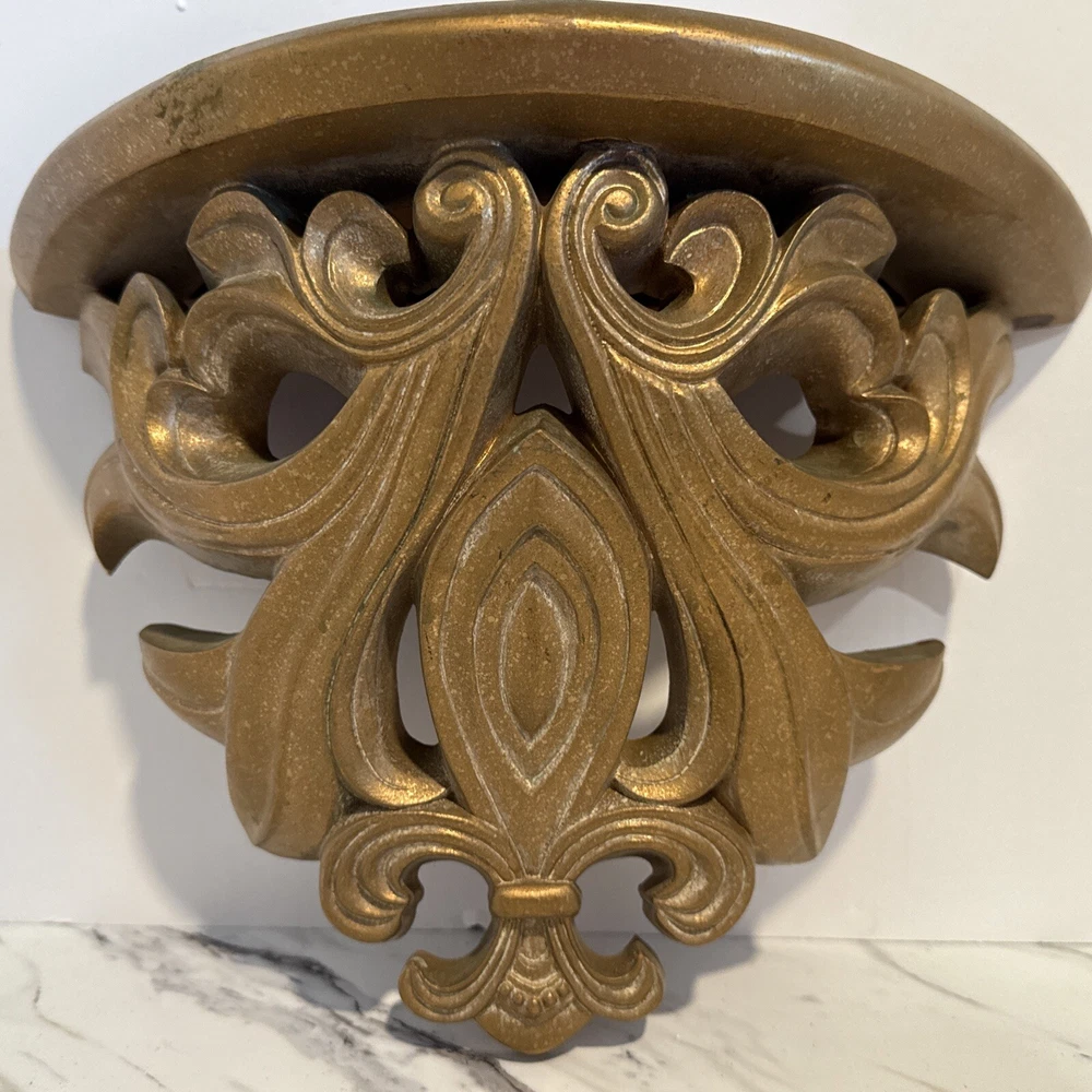 VTG Wall Shelf Gold Color Painted 12” Old World Victorian Plastic Home Interior Pre-Owned vintage 70’s. Has some minor blemishes as shown in photos. See all photos for best representation & for measurements. Thank you for looking and supporting my small business!