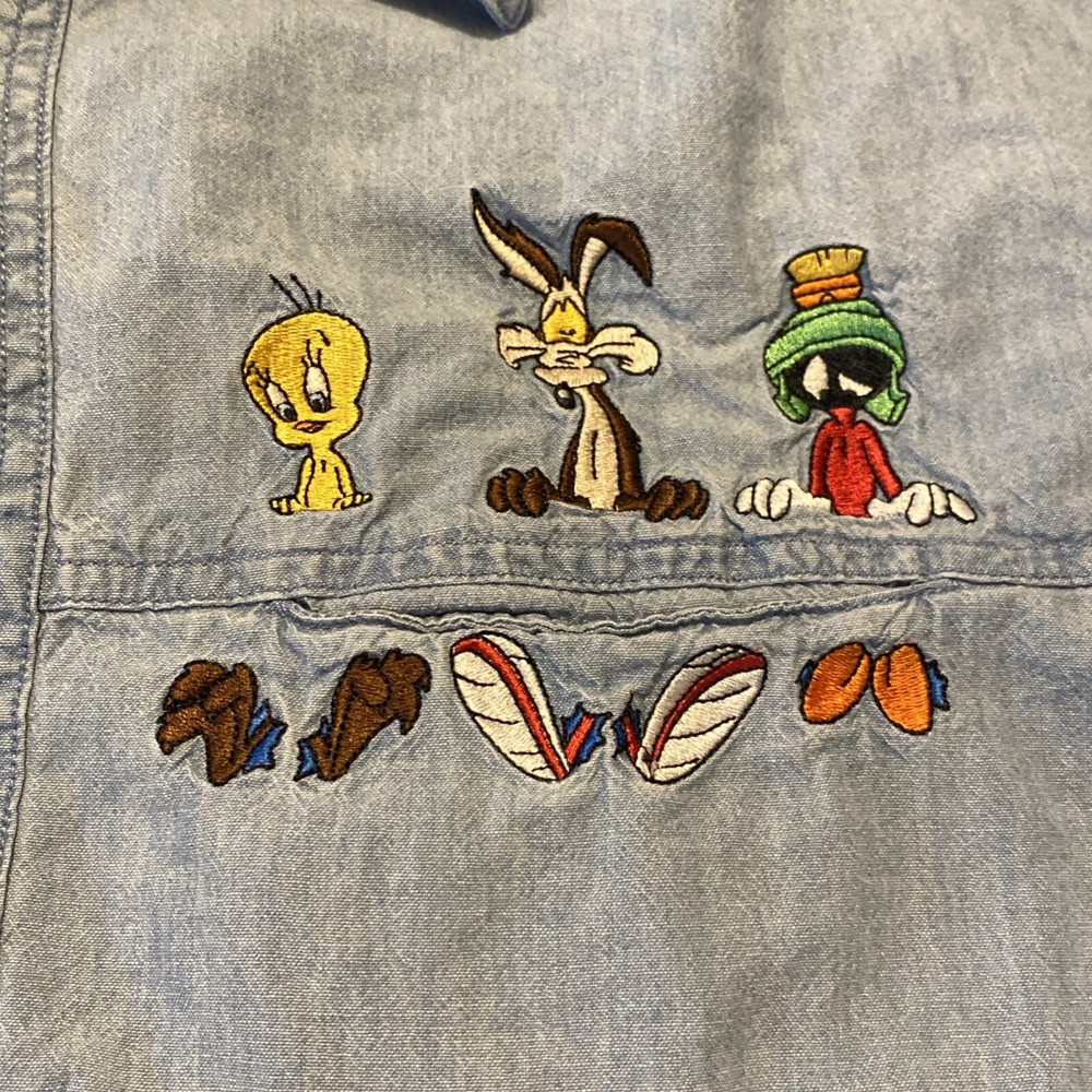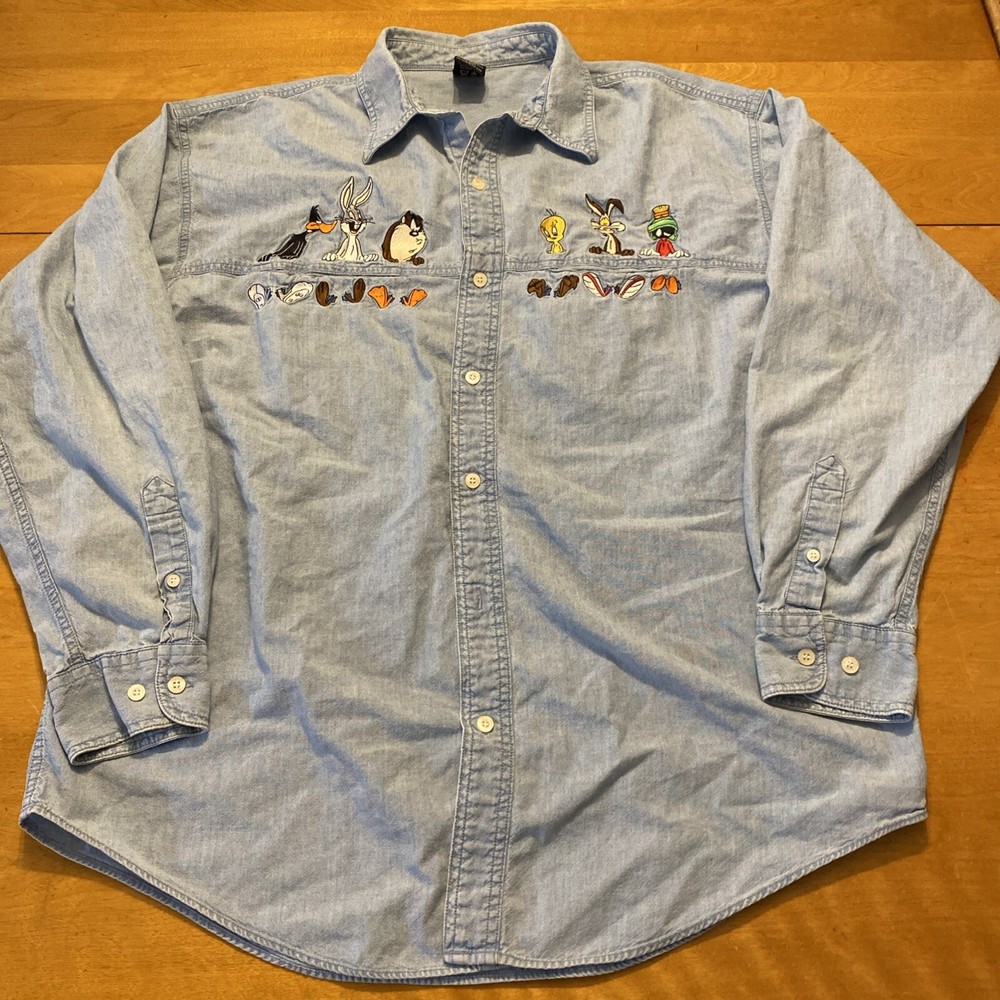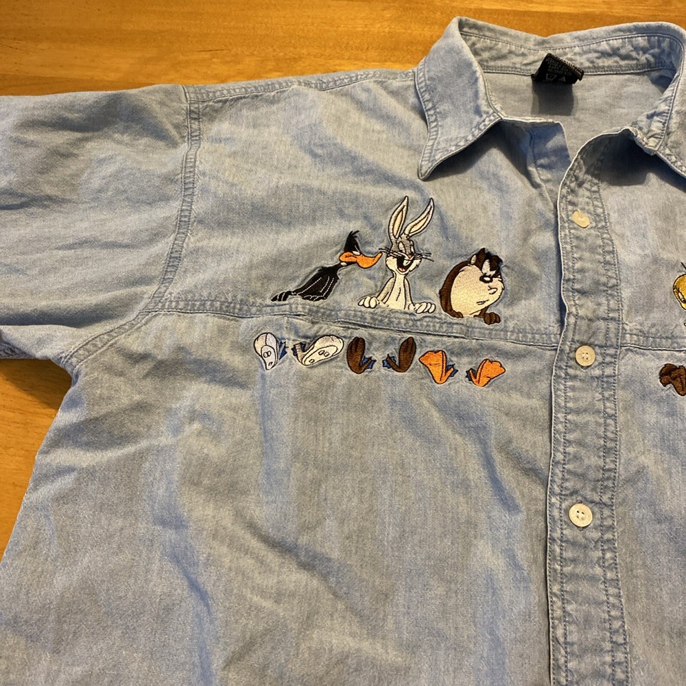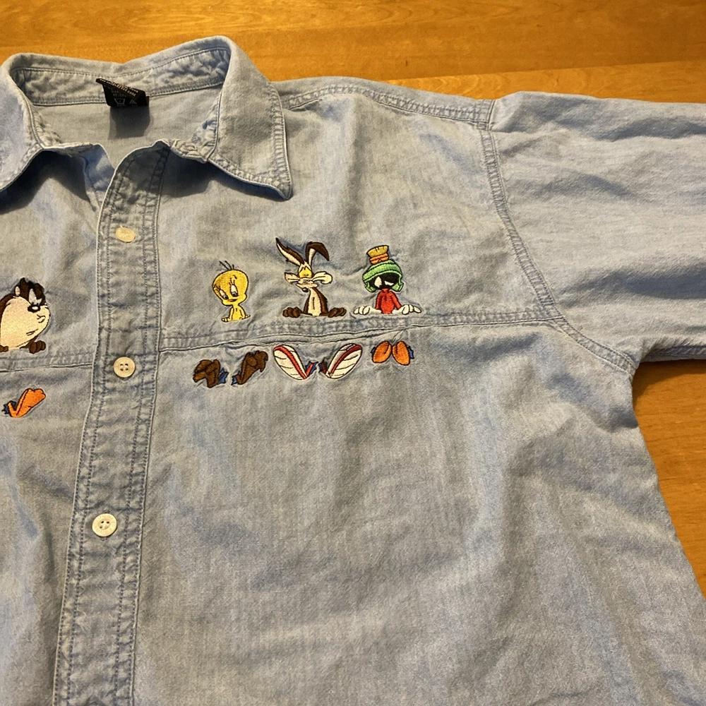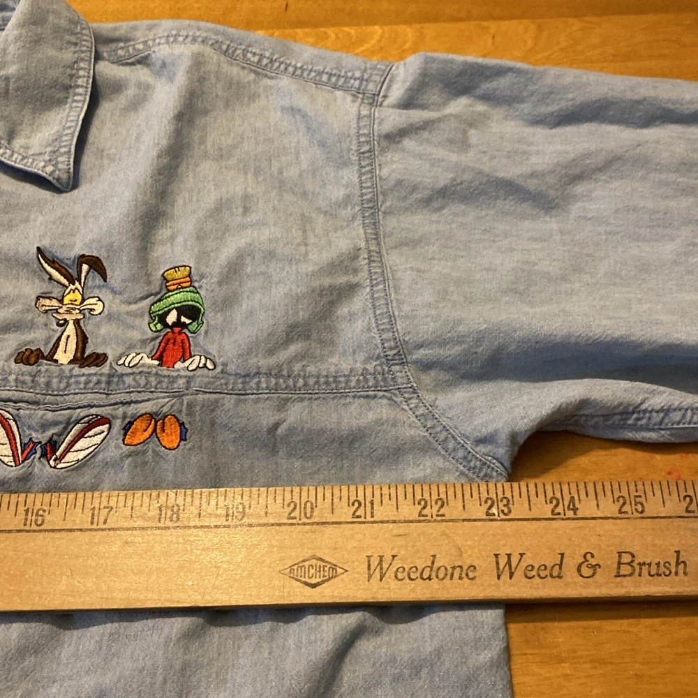 This vintage Warner Bros. Looney Tunes denim shirt is a must-have for any fan of the classic cartoon series. The shirt features beloved characters such as Bugs Bunny, Tweety Bird, Daffy Duck, Taz, and even the Martian. The blue cotton material is comfortable and durable, making it perfect for everyday wear. This shirt is pre owned please look over pictures and measurements The