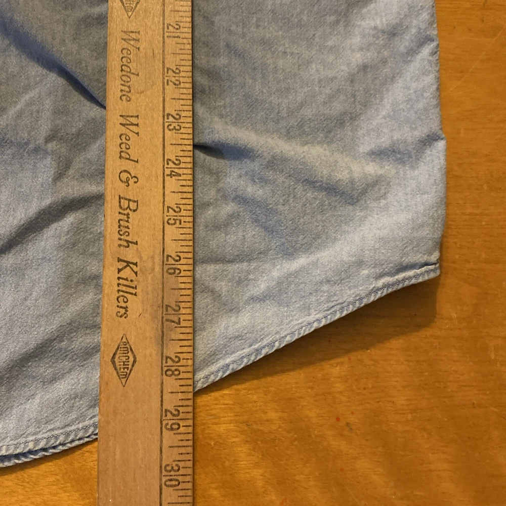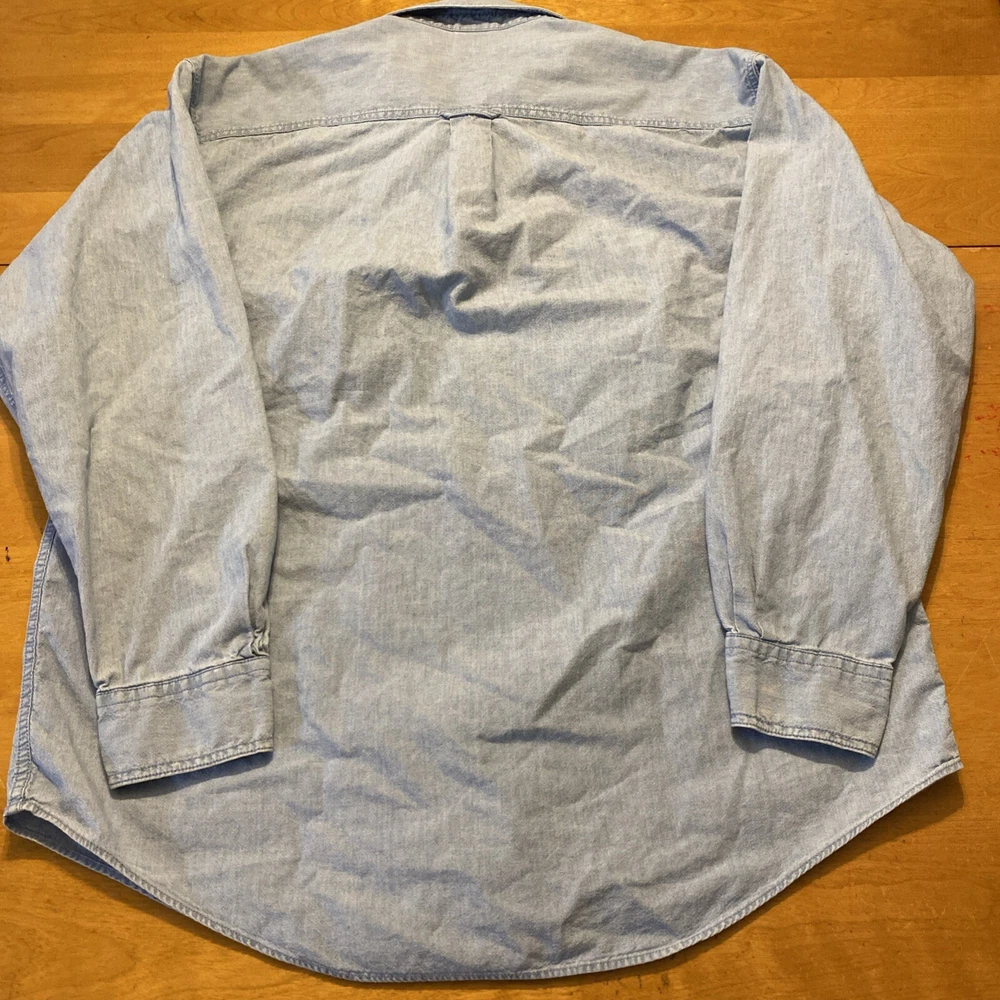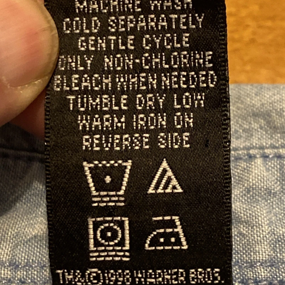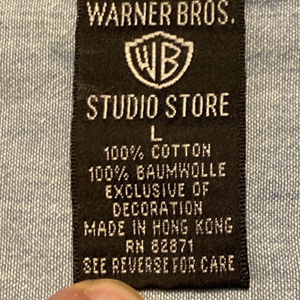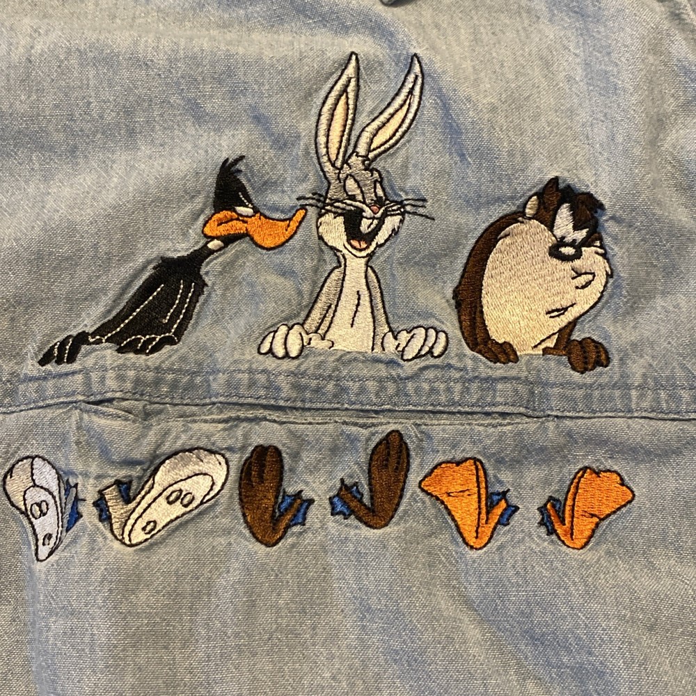 This vintage Warner Bros. Looney Tunes denim shirt is a must-have for any fan of the classic cartoon series. The shirt features beloved characters such as Bugs Bunny, Tweety Bird, Daffy Duck, Taz, and even the Martian. The blue cotton material is comfortable and durable, making it perfect for everyday wear. This shirt is pre owned please look over pictures and measurements The