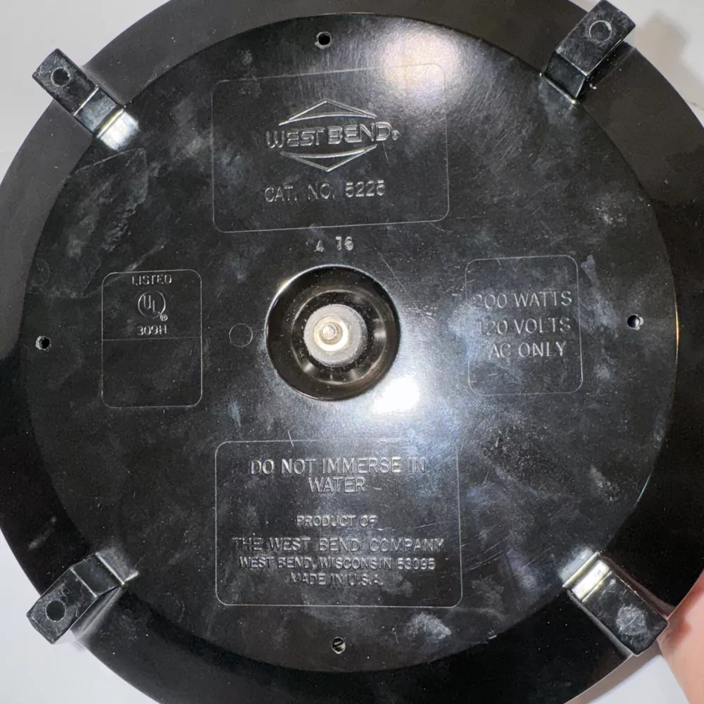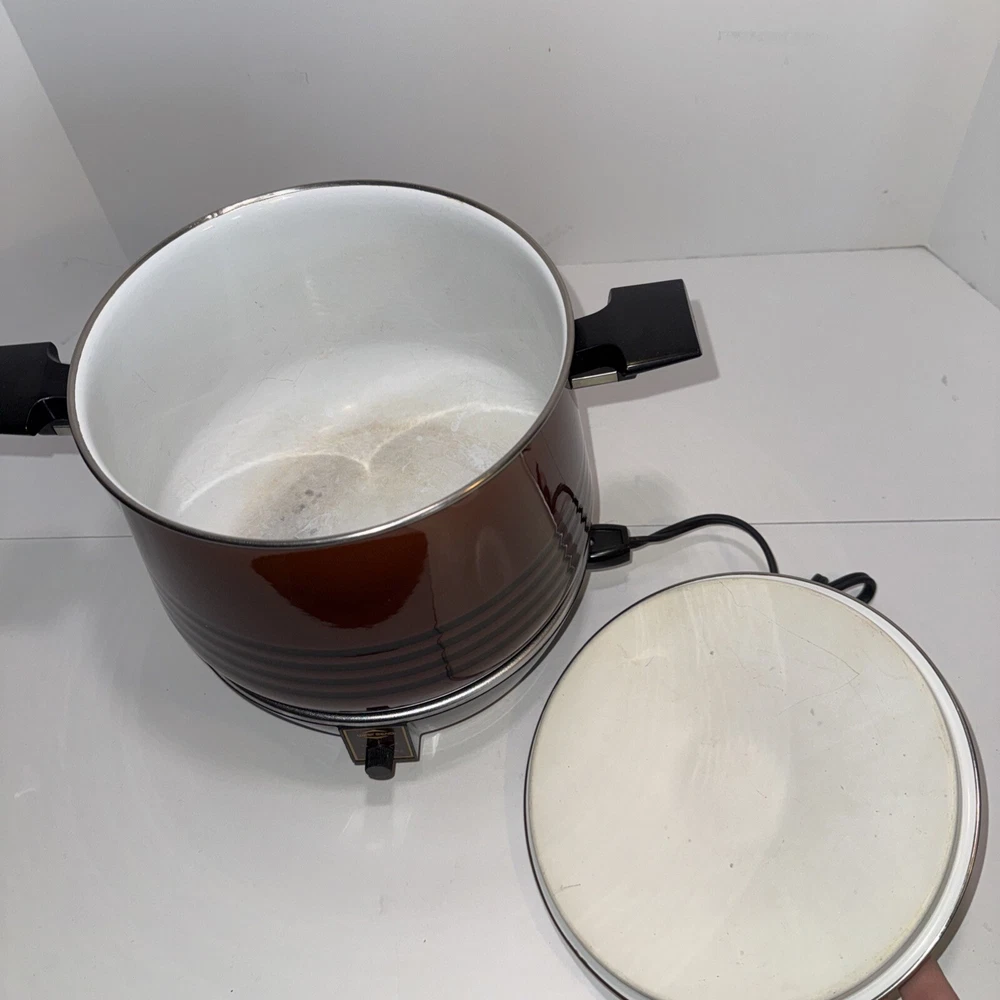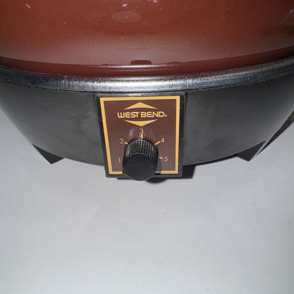 This is a vintage West Bend Slow Cooker in brown enamel finish with a 6 qt capacity. The model is Lazy Day Slo-Cooker 5225, featuring easy cleaning, 200W power, and 5 settings. Made in the United States, it includes a pot, lid, base, and cord. Works great and is a wonderful vintage find!
