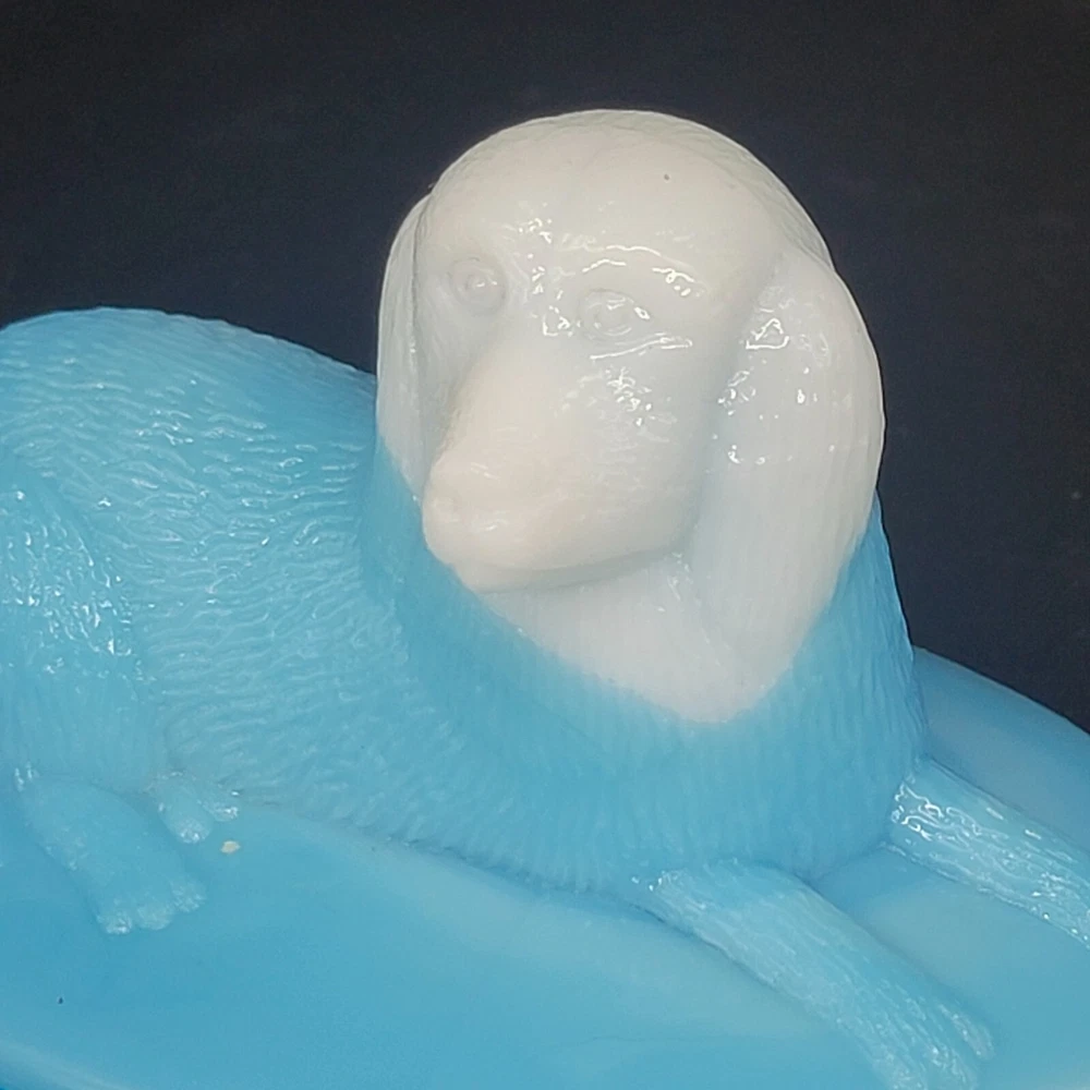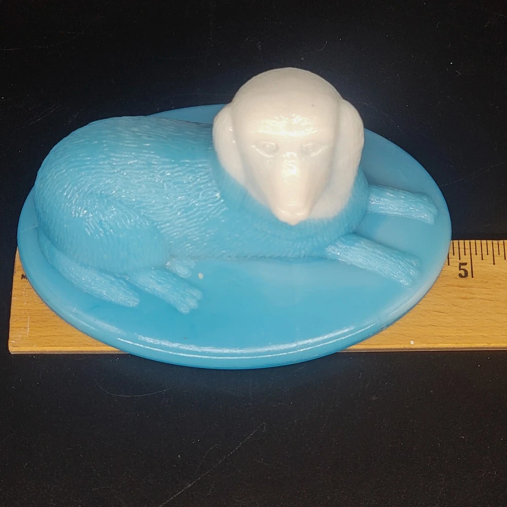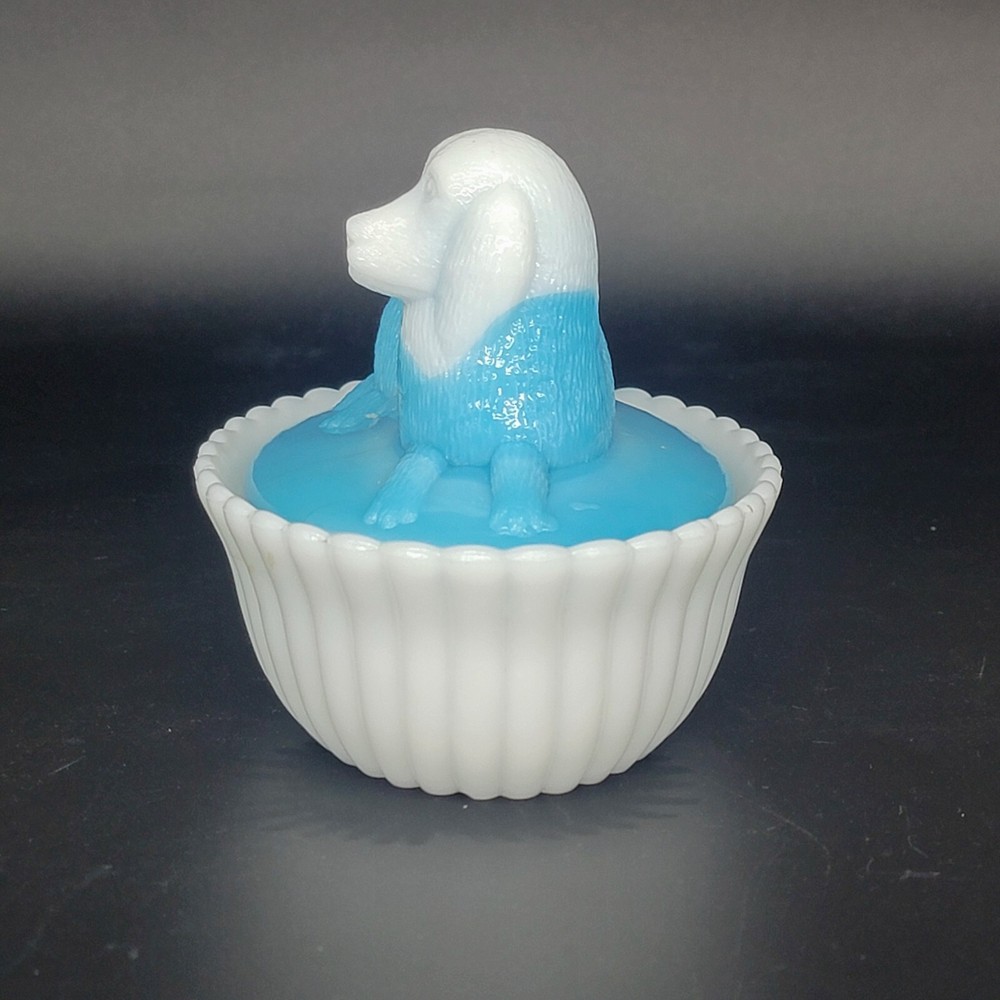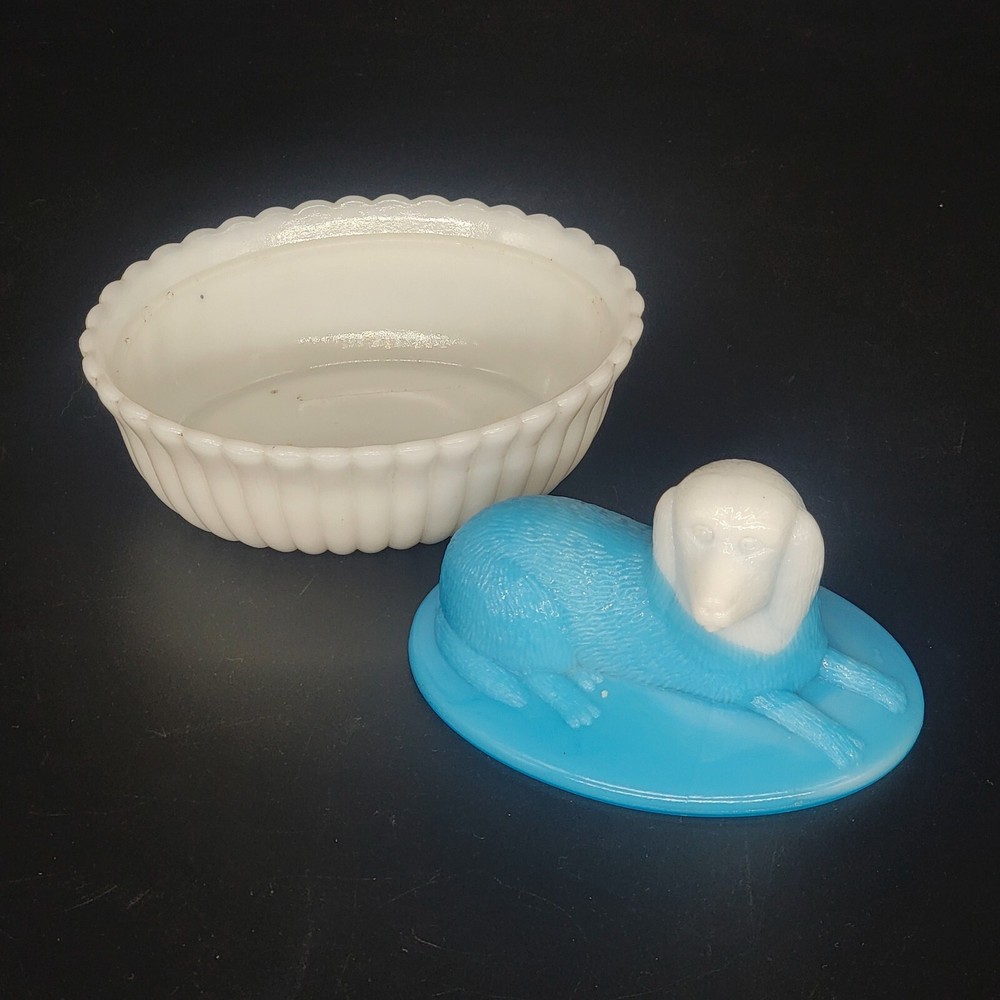 Vintage Westmoreland milk glass covered dish showcases a nicely-marked dog motif. The charming oval-shaped piece, measuring 5.25 inches in length and 4-1/8 inches in height, features a slag glass design in a serene shade of blue, complemented by a vertical rib base that adds a touch of elegance. The lid is inscribed with the number "4" and the dish with the number "5". This decorative candy dish or trinket box originated in the United States, and is a testament to the timeless craftsmanship of the Westmoreland brand.