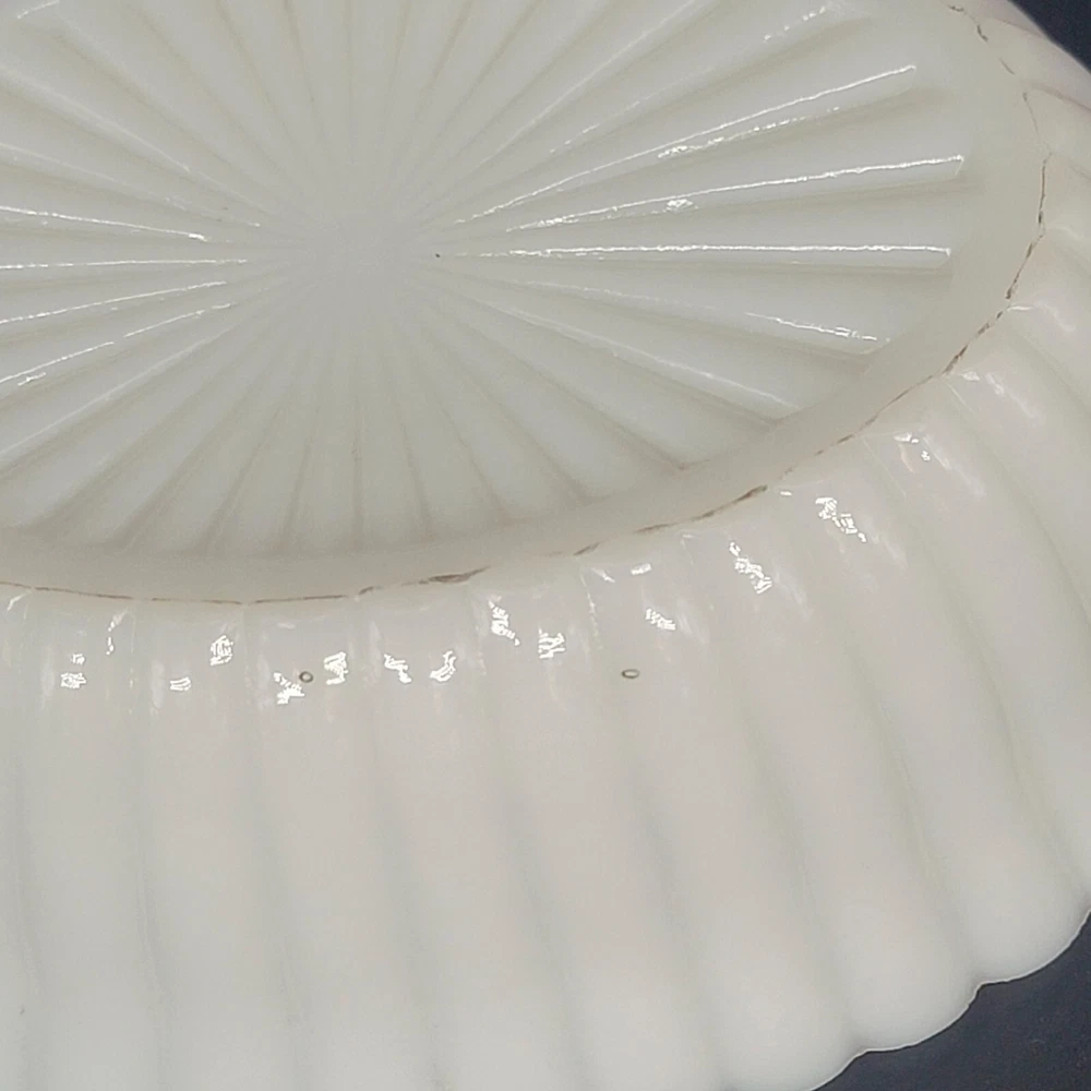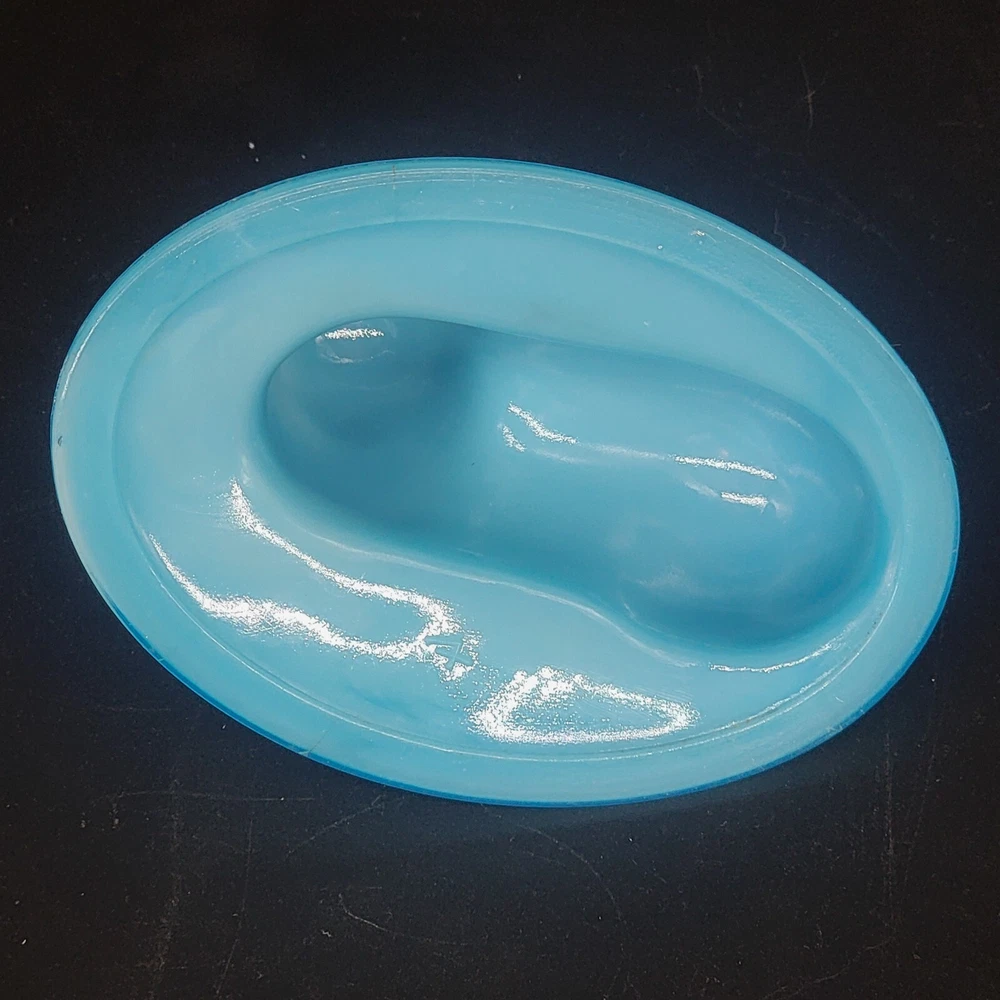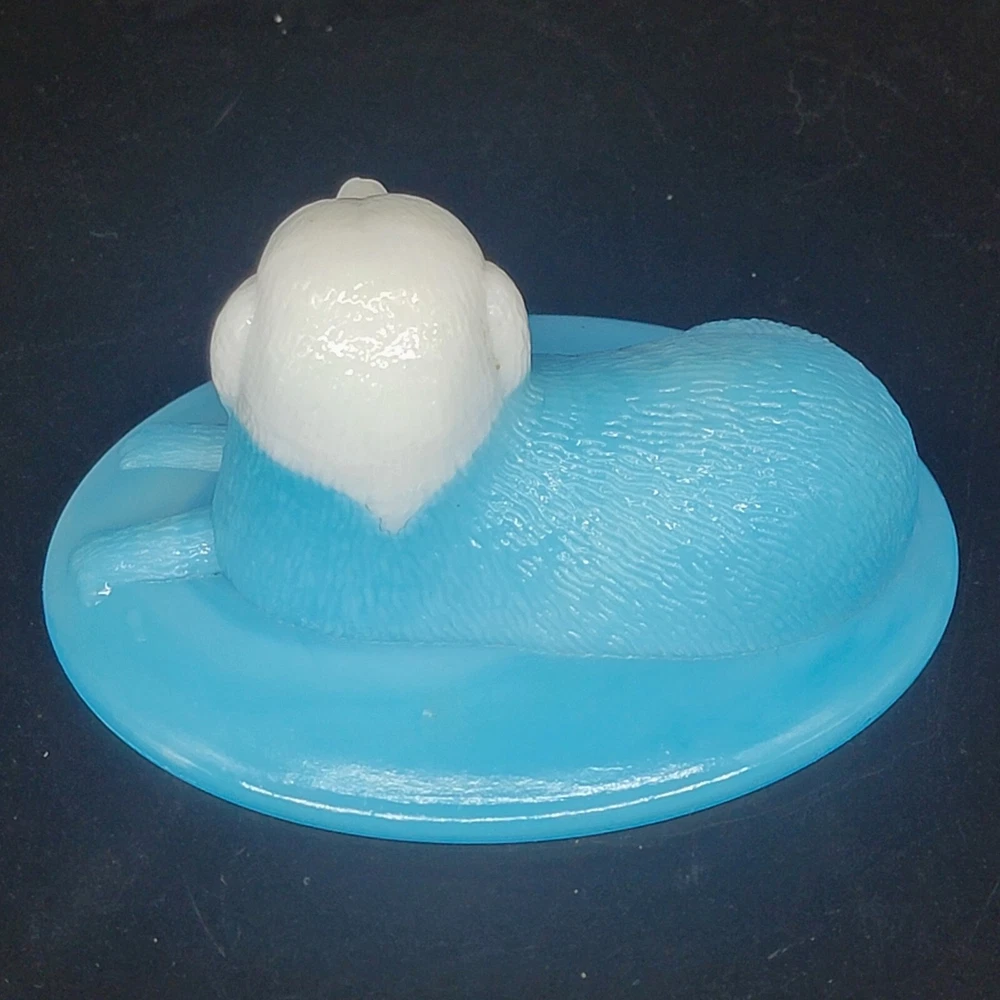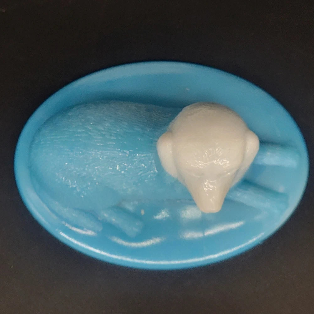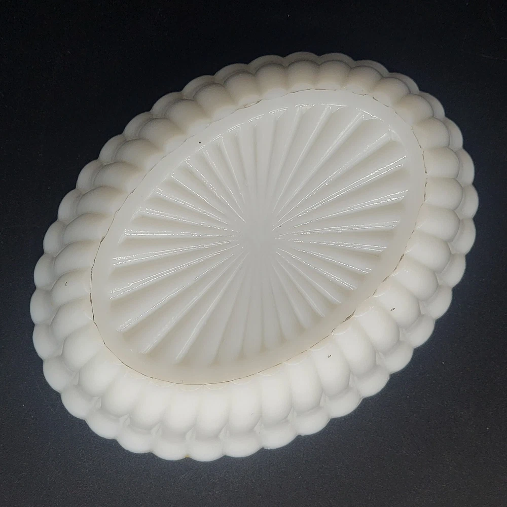 Vintage Westmoreland milk glass covered dish showcases a nicely-marked dog motif. The charming oval-shaped piece, measuring 5.25 inches in length and 4-1/8 inches in height, features a slag glass design in a serene shade of blue, complemented by a vertical rib base that adds a touch of elegance. The lid is inscribed with the number "4" and the dish with the number "5". This decorative candy dish or trinket box originated in the United States, and is a testament to the timeless craftsmanship of the Westmoreland brand.