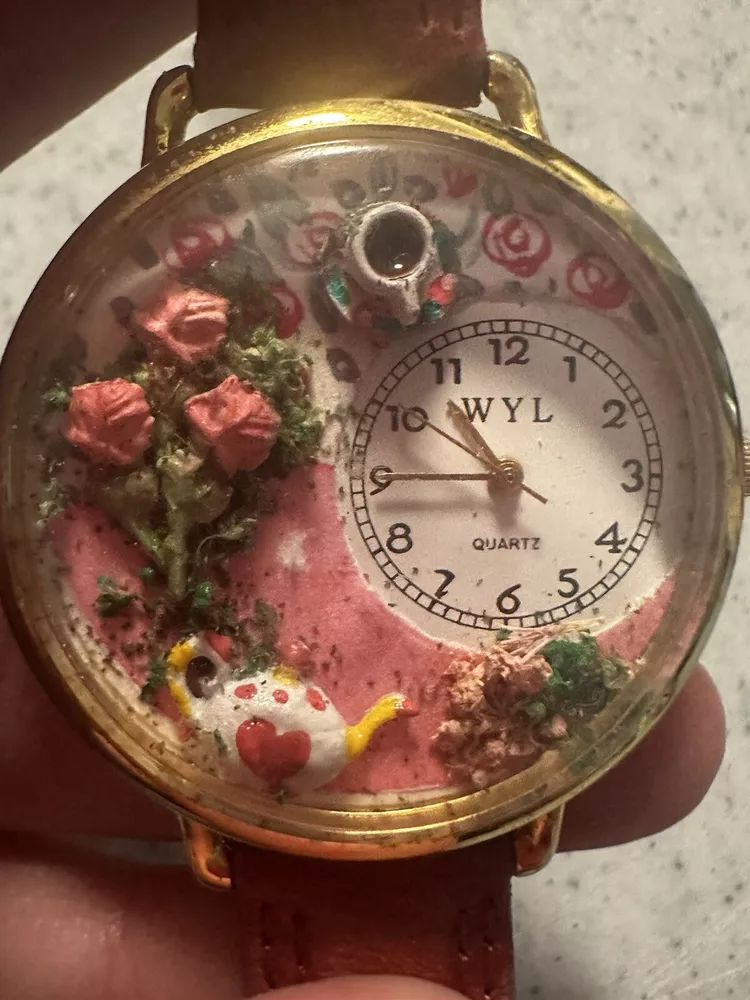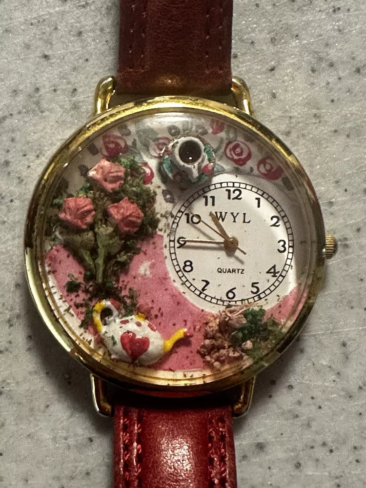 This vintage Whimsical Watches teapot and cup set is a unique addition to any watch collection. The silver case color and pink band material make it a stylish accessory for women. It features a Japanese quartz movement, buckle closure, and a round watch shape. The watch is water-resistant, has acrylic crystal, and a seconds hand, along with a 12-hour dial. The push/pull crown allows for easy adjustment, and it comes with features like a food & drink theme, handmade design, and no papers or service records. This casual wristwatch is perfect for everyday wear and is a must-have for watch enthusiasts.