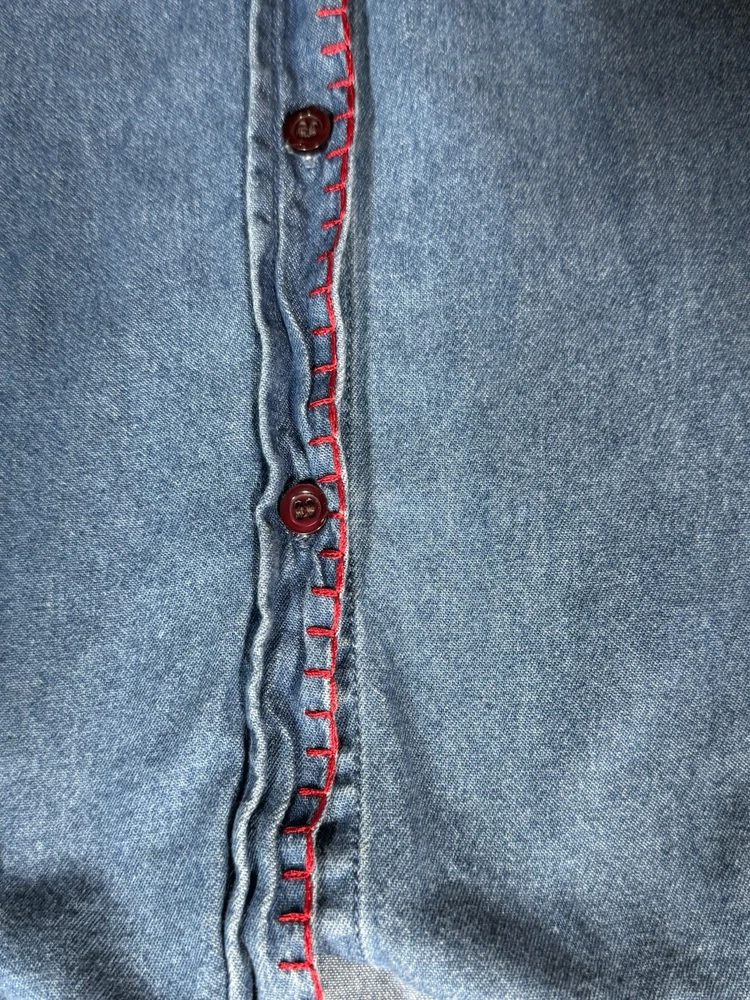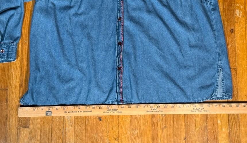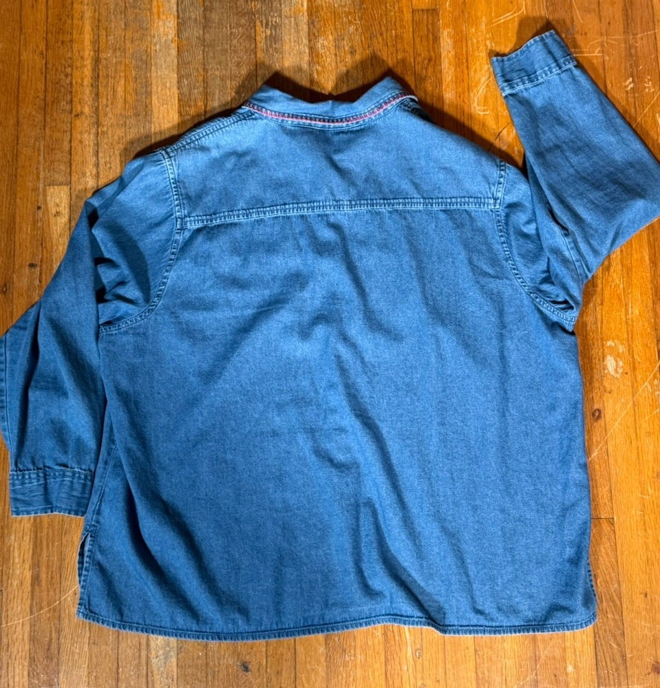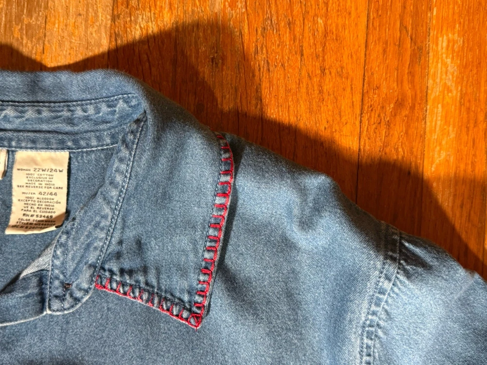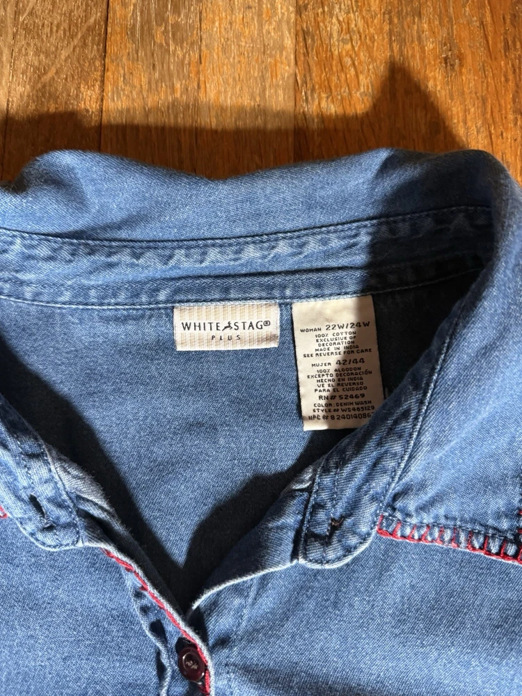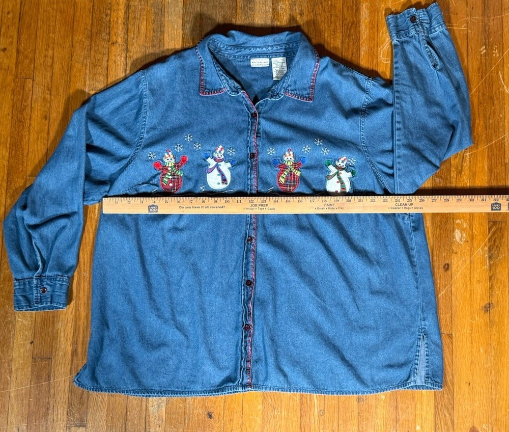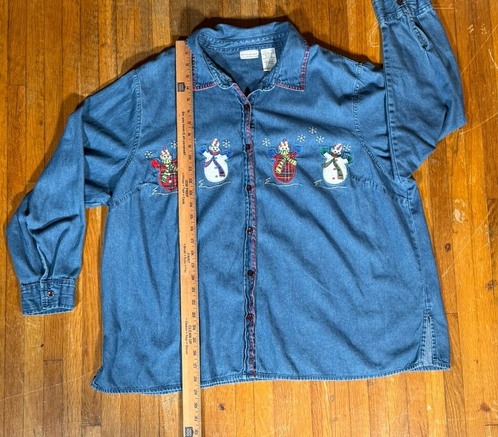 Vintage White Stag Christmas Holiday Denim Button Down Shirt. Embroidered Snowmen and Snowflakes Women's SIze 22W See photos for measurements.