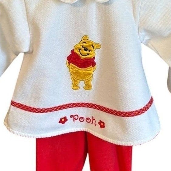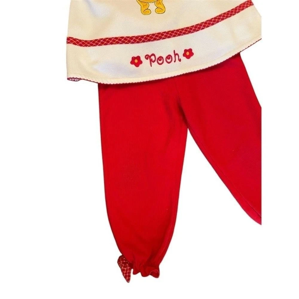 Disney Winnie the Pooh 100 Acre Collection baby and toddler outfit set. This charming ensemble features a long-sleeved white top with an embroidered Winnie the Pooh graphic and a "Pooh" detail with floral accents. The coordinating red pants have a comfortable elastic waistband and adorable ruffled cuffs. Perfect for playtime, park visits, or casual outings. Department: Unisex Baby & Toddler Character: Winnie the Pooh, Pooh Theme: Animals Style: Pants Set Set Includes: Pants, Casual Shirt Number of Pieces: 2 Piece Fabric Type: Blended Fabric Pattern: Floral Material: Polyester, Cotton Occasion: Casual Character Family: Disney Features: Cuffed Accents: Embroidered, Ruffle Keywords: Disney, Winnie the Pooh, Pooh Bear, 100 Acre Collection, baby outfit, toddler set, embroidered, character clothing, red pants, long sleeve top, playwear, casual, gift All items come from a smoke free, pet friendly home. All of items unless NWT or Dry Clean Only are washed with Tide. We try our best to disclose any flaws with items, if we miss something please reach out and let us know. We offer combined shipping on all our items. We do take measurements of our clothing listed for sale. Please compare the measurements to something you already own.