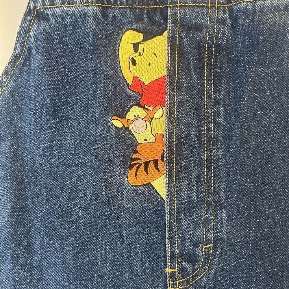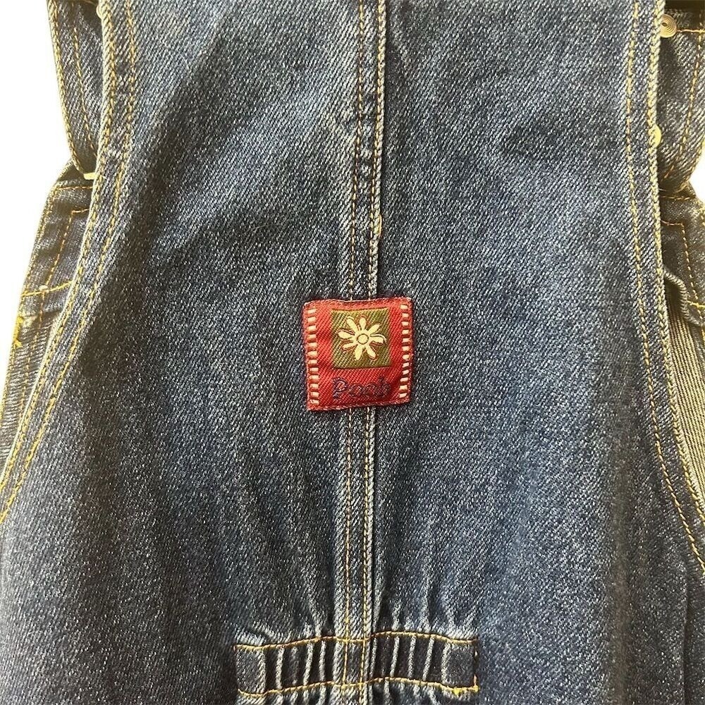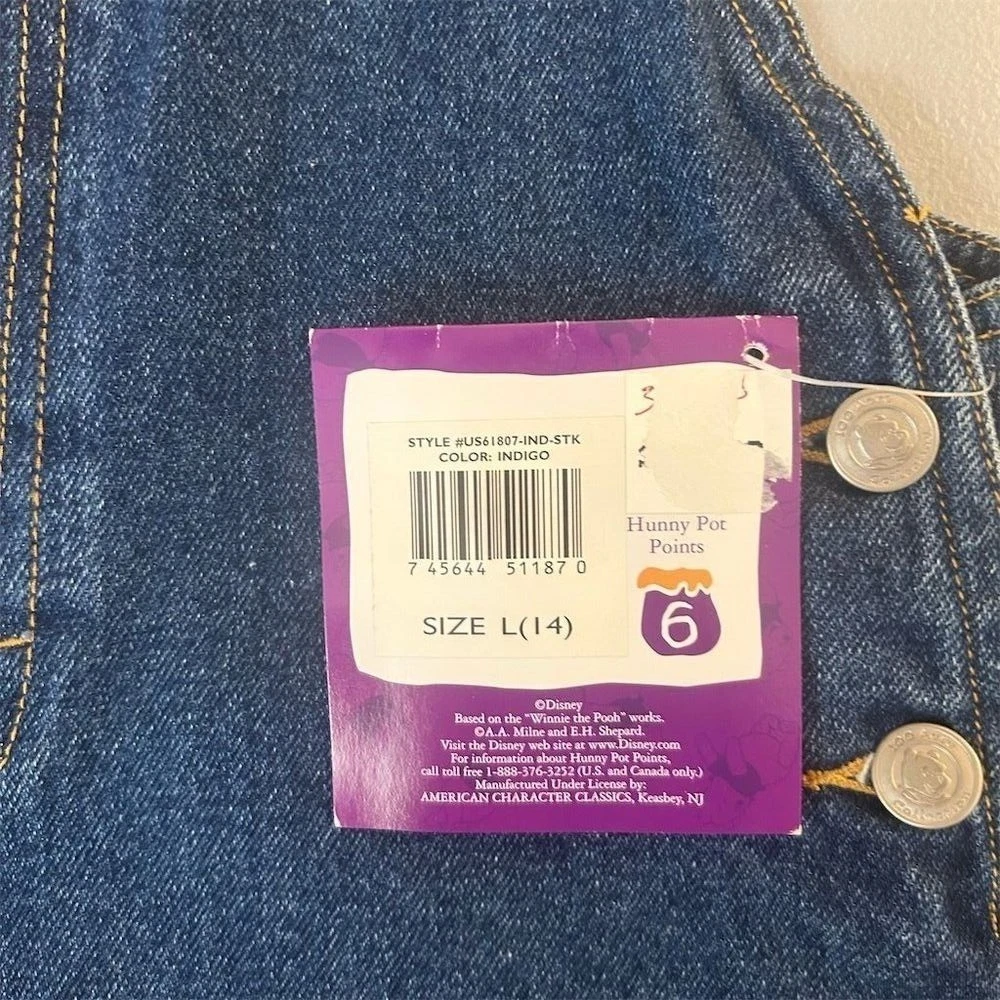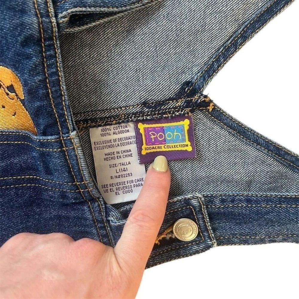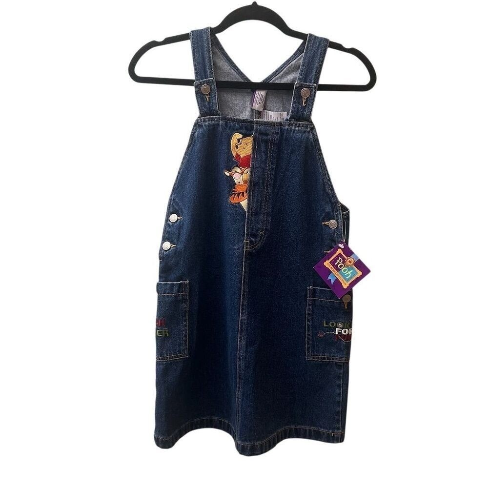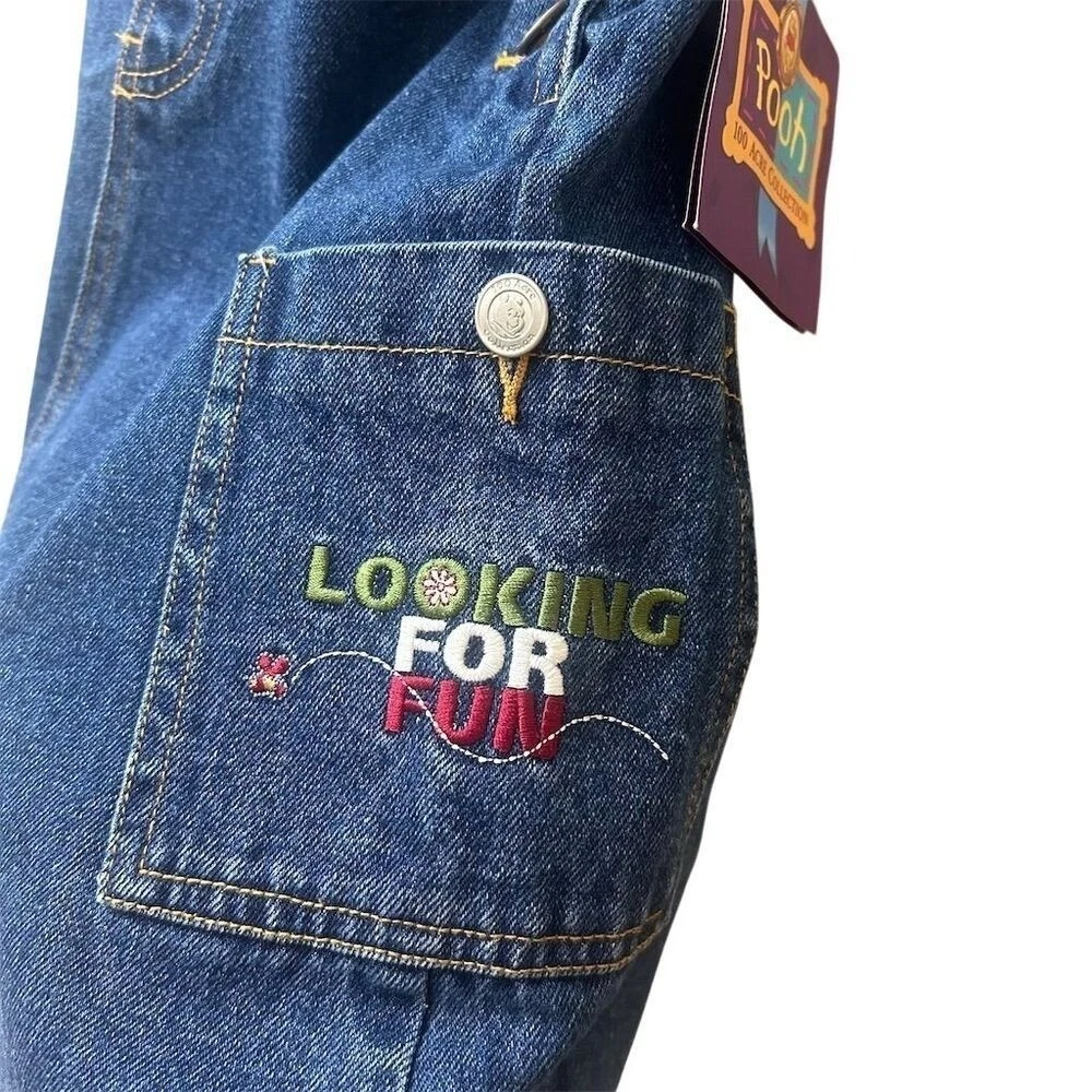 Kids denim overall dress featuring Winnie the Pooh and "Looking for Fun" embroidery. Adjustable straps and side buttons for a comfortable fit. Perfect for casual outings or playtime. Measurements: • Waist: 28 in • Length: 23 in Style: Overall Dress Dress Length: Knee Length Department: Girls Theme: Fairytale & Fantasy Character: Winnie the Pooh Sleeve Length: Sleeveless Occasion: Casual Fabric Type: Denim Season: Spring, Summer Material: 100% Cotton, Fabric Closure: Button Character Family: Disney Accents: Embroidered, Button, Logo Keywords: Winnie the Pooh, denim, overalls, dress, toddler, childrens, embroidered, cartoon, character, playtime, casual, summer, spring All items come from a smoke free, pet friendly home. All of items unless NWT or Dry Clean Only are washed with Tide. We try our best to disclose any flaws with items, if we miss something please reach out and let us know. We offer combined shipping on all our items. We do take measurements of our clothing listed for sale. Please compare the measurements to something you already own.