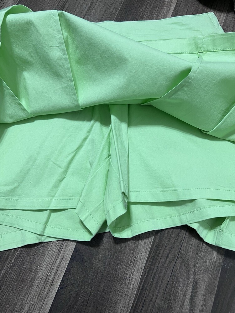This vintage Y2K mini skirt skort in a light green color is a stylish and versatile piece for women size 6. The skirt features a pleated design with a preppy style, perfect for various occasions like golf, tennis, parties, or casual outings. Made from a stretchy knit fabric blend of spandex and cotton, this mini skirt has a mid-rise and button closure. It also has a touch of 2000s and school girl aesthetic, making it a fun addition to any wardrobe. New without tags!