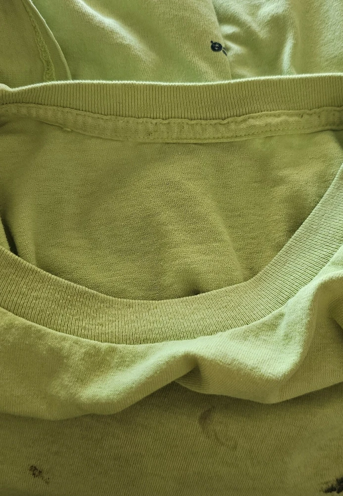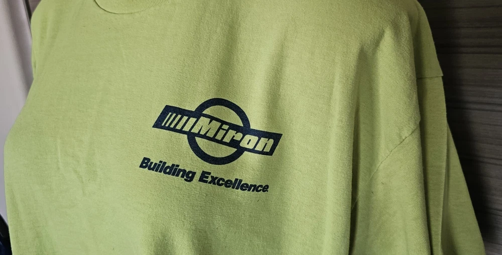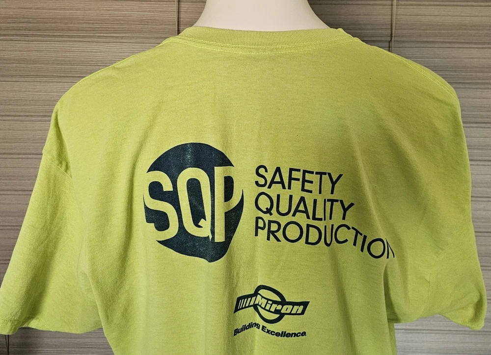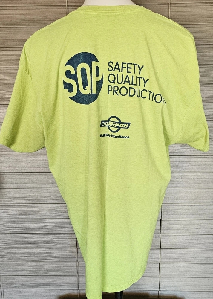 VINTAGE DISTRESSED BRIGHT FLUORESCENT/NEON GREEN PAINT SPLATTER THRASHED MIRON S.Q.P., SAFETY QUALITY PRODUCTION CONSTRUCTION CREW NECK T-SHIRT IN SIZE MEN'S XL. (No size tags) IT HAS AN AWESOME LOOK TO IT! VERY, VERY COOL AND UNIQUE SHIRT! NO HOLES, RIPS, ETC. JUST PAINT SPLATTER AND NORMAL STAINING FROM WEAR AND CONSTRUCTION USE. IT HAS COOL CONTRASTING COLOR THREAD. (See photos forcondition) IT JUST LOOKS AWESOME! COMES FROM A SMOKE AND PET-FREE HOME. Approximate measurements are as follows: Length (laying flat): 29" Rear neckline to bottom hem. Underarm to underarm/pit to pit (laying flat): 23" Please review the measurements and photos very carefully. This is a well-used shirt, and wear should be expected unless otherwise noted. Please ask any and all questions prior to purchasing. This is being sold as-is, and no returns are accepted. Fully secure and insured shipping via USPS Mail. I ship fast! Please check out my other items for more awesome vintage clothing and unique merchandise!!! I usually add more every week! Thanks for looking !