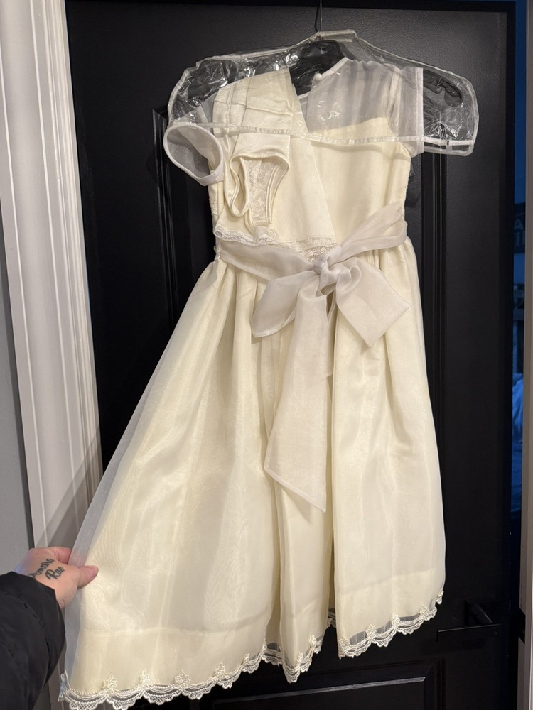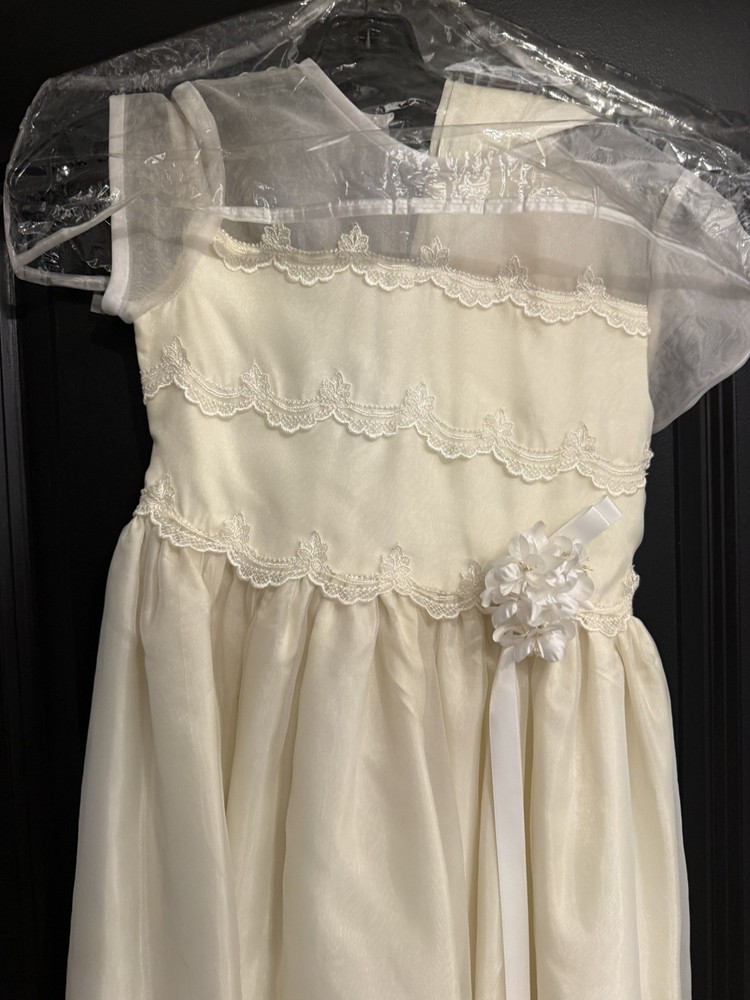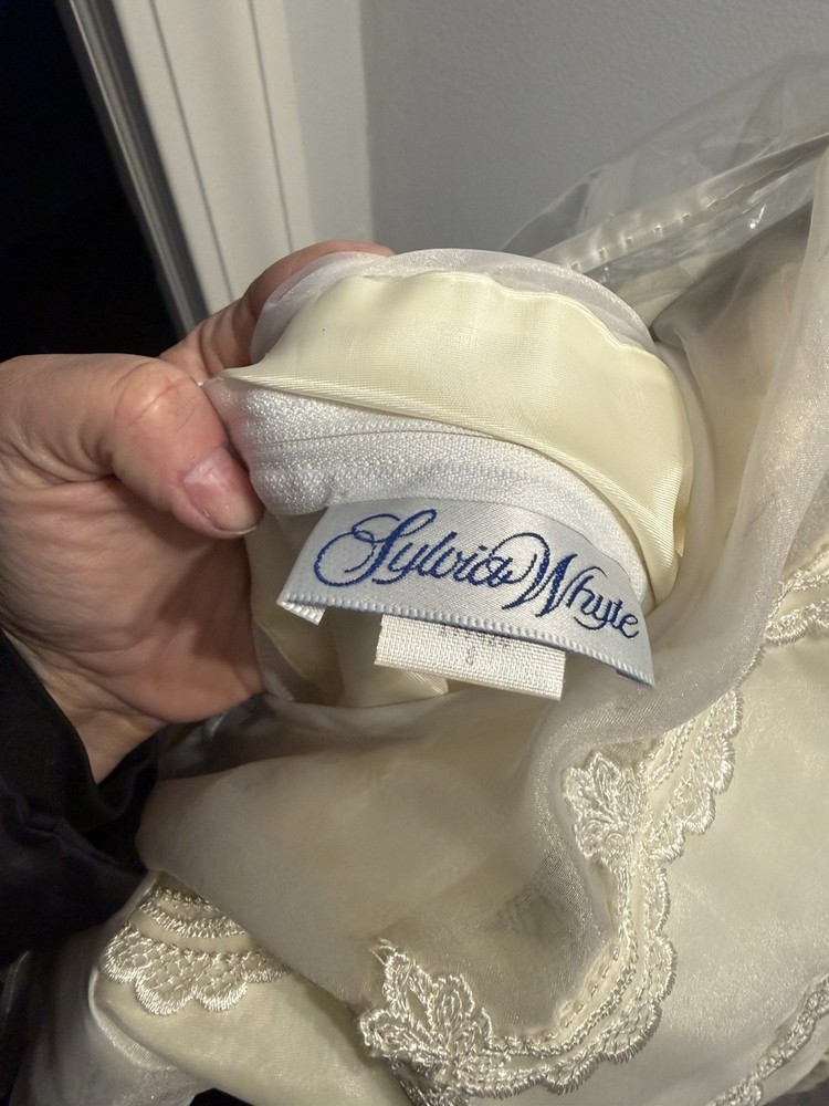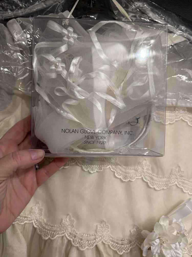 Comes with veil as well as slip dress. Vintage late 90s. Was stored properly, may need dry cleaning as dress has yellowed slightly. Beautiful detail no known imperfections.