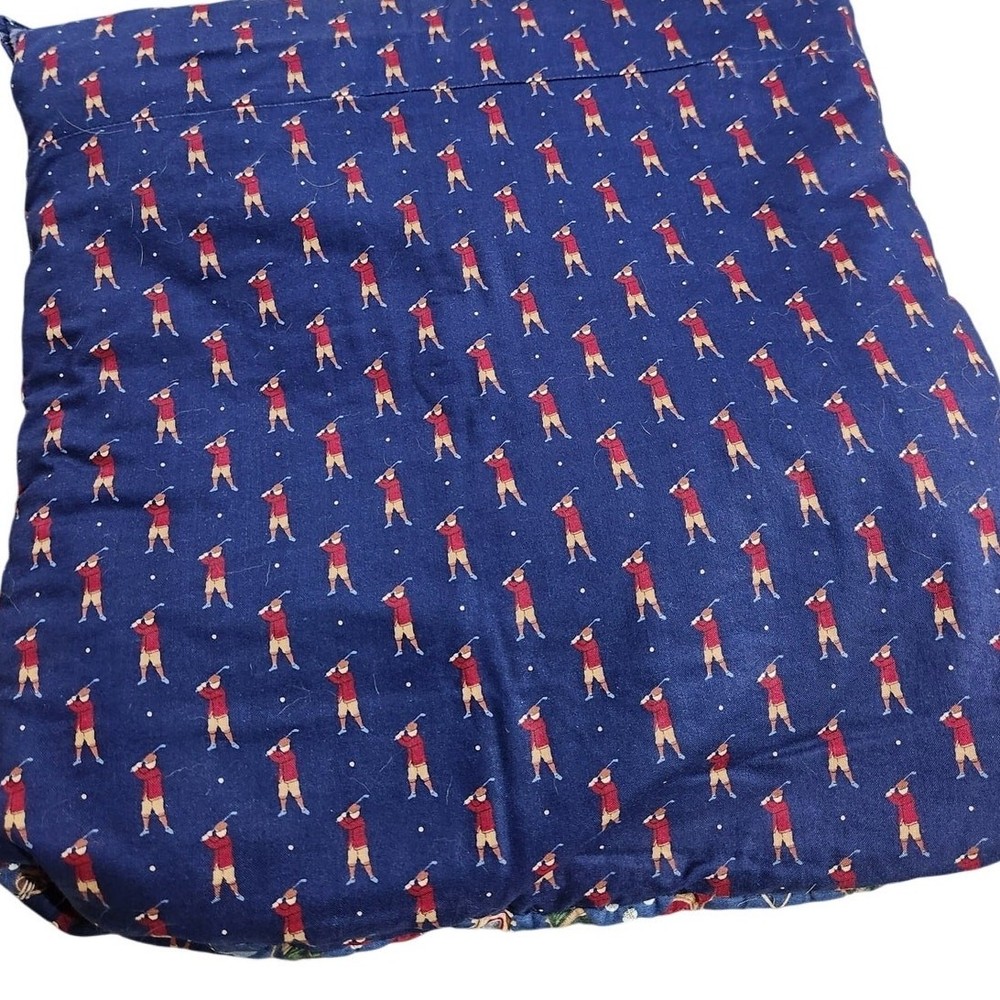 Golf quilt that folds up into a "storage pocket" making it easy to fold up and put away or display. The main side features scenes of vintage golfers and the back panel has tiny golfers with a navy blue background. The fold up design makes it perfect for storage when not in use or for bringing as a picnic blanket! The quilt is in great condition with a minor flaw on one of the seams near the pocket. Please see last photo. The interior batting has been moved around, probably from being washed, but overall this quilt is still in great vintage condition. Approximately 48" x 53"