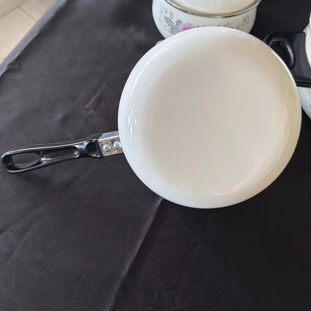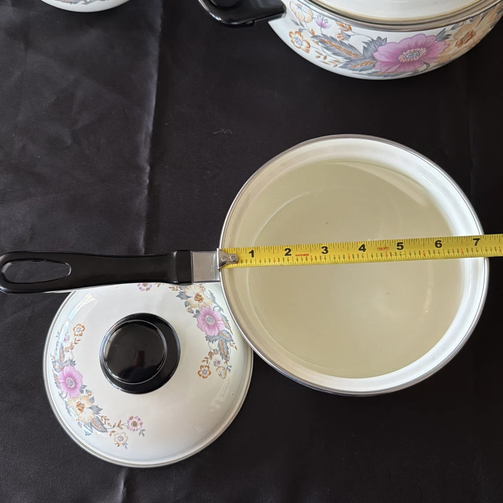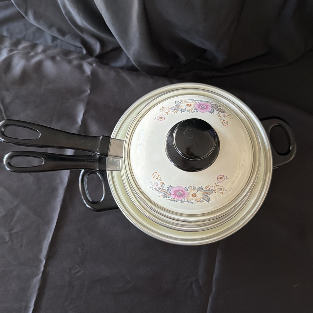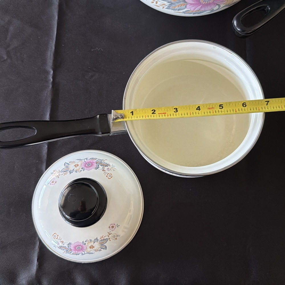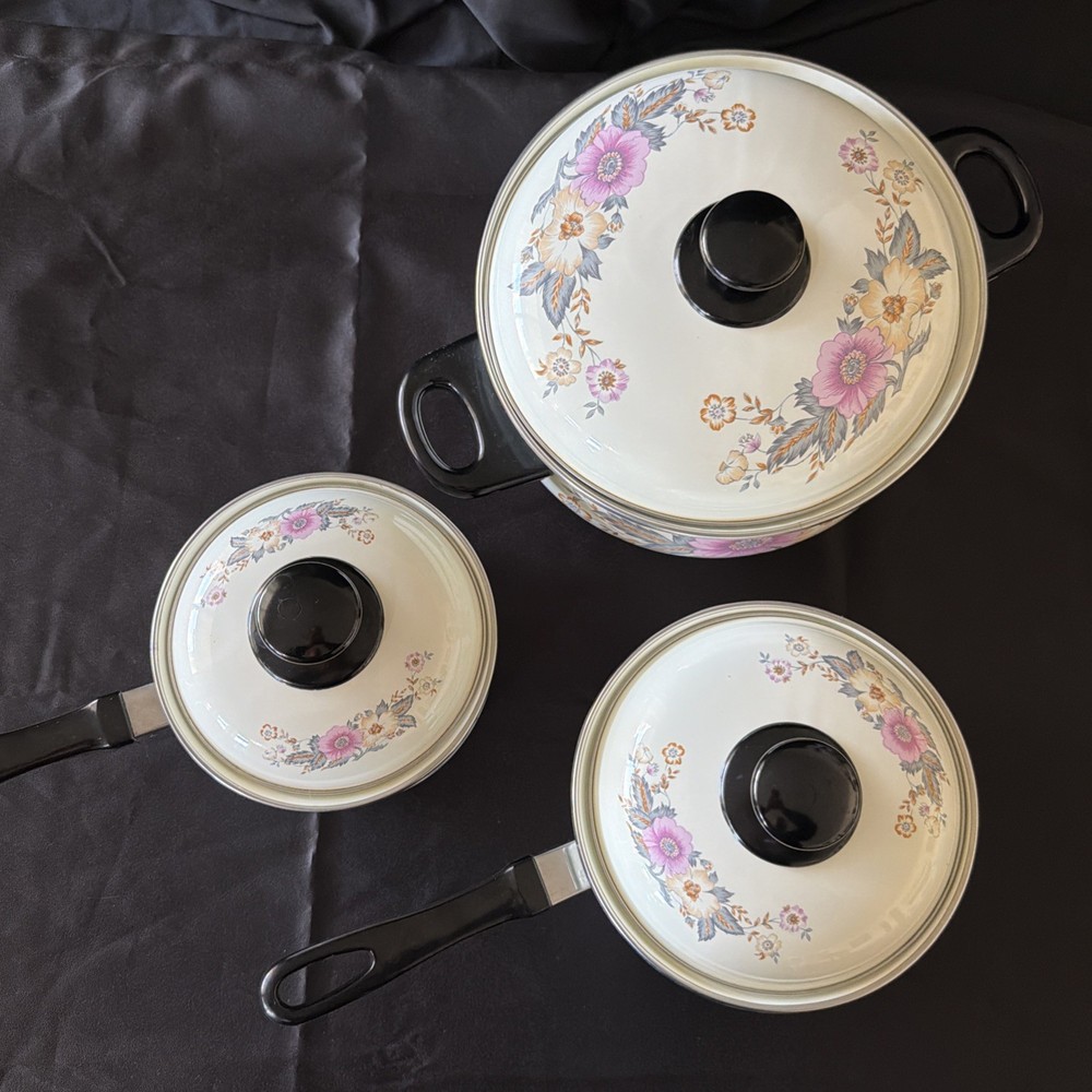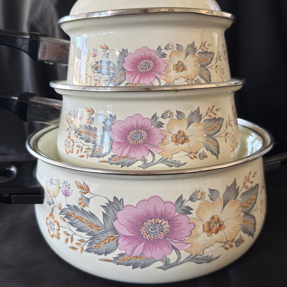 The product is a set of six vintage 1970's enamel saucepans with floral patterns and plastic handles. The round saucepans are designed for use on both electric and gas stoves, making them versatile for various cooking needs. Each saucepan comes with a lid, adding to their functionality and collectibility. These original saucepans are a unique addition to any kitchen, especially for those interested in vintage cookware from the 1970s.
