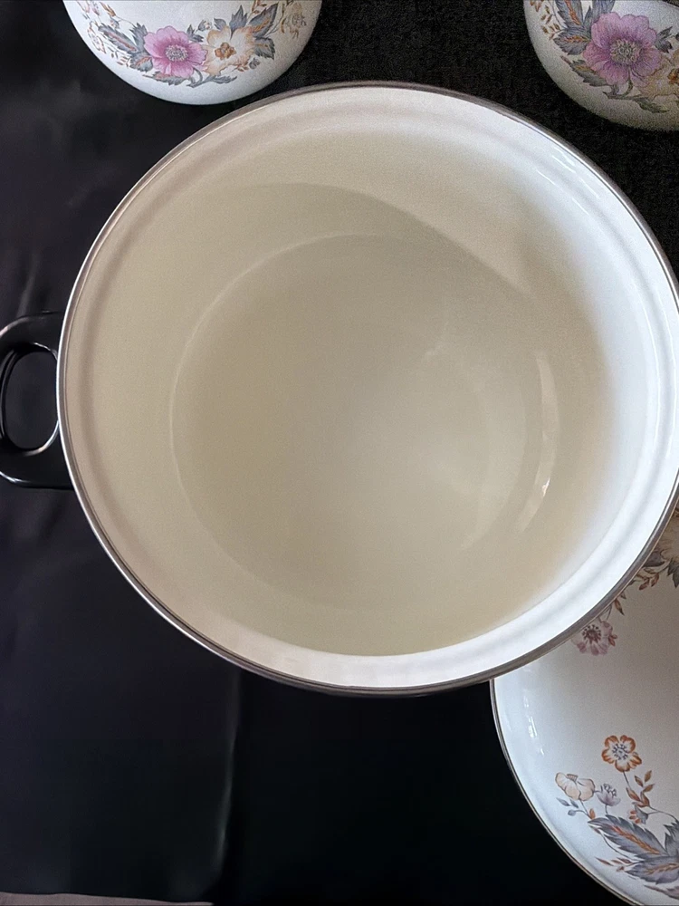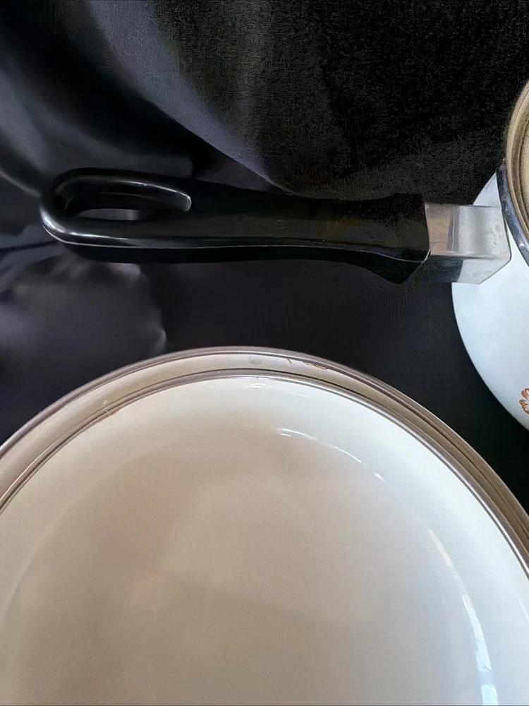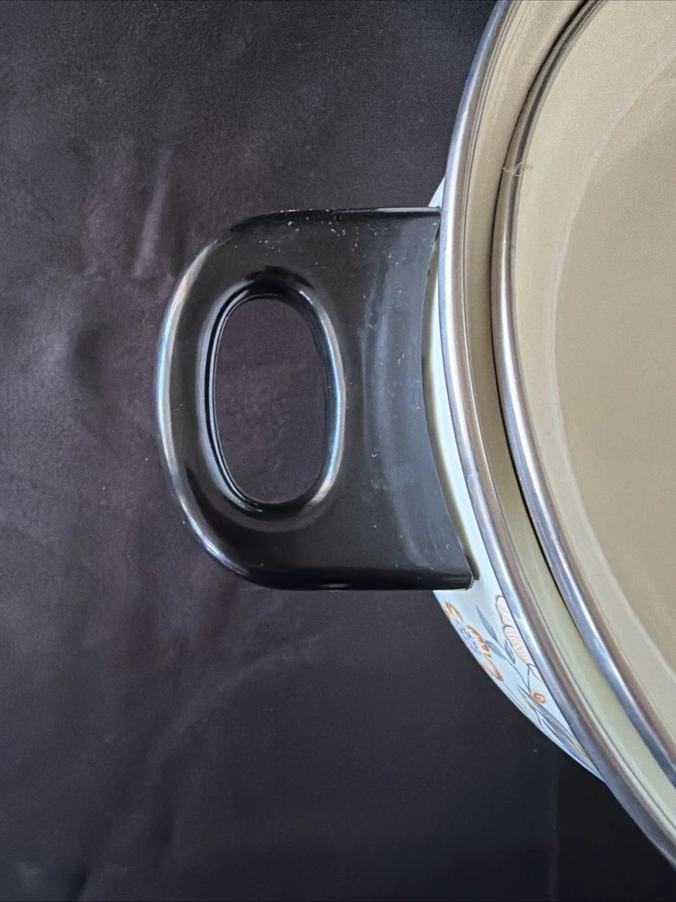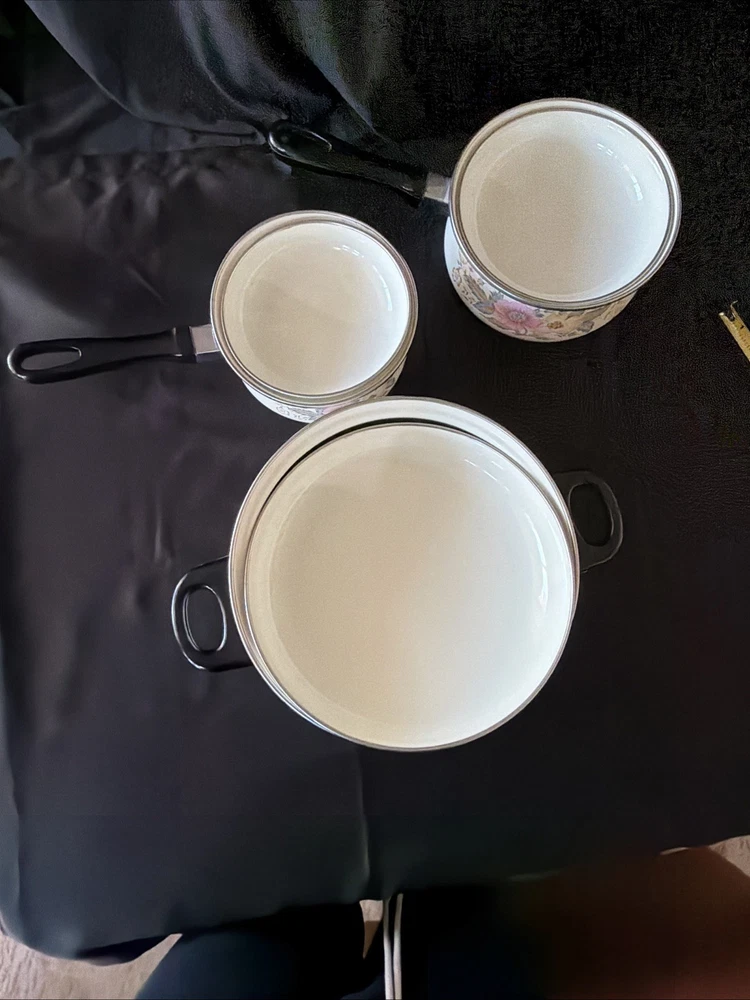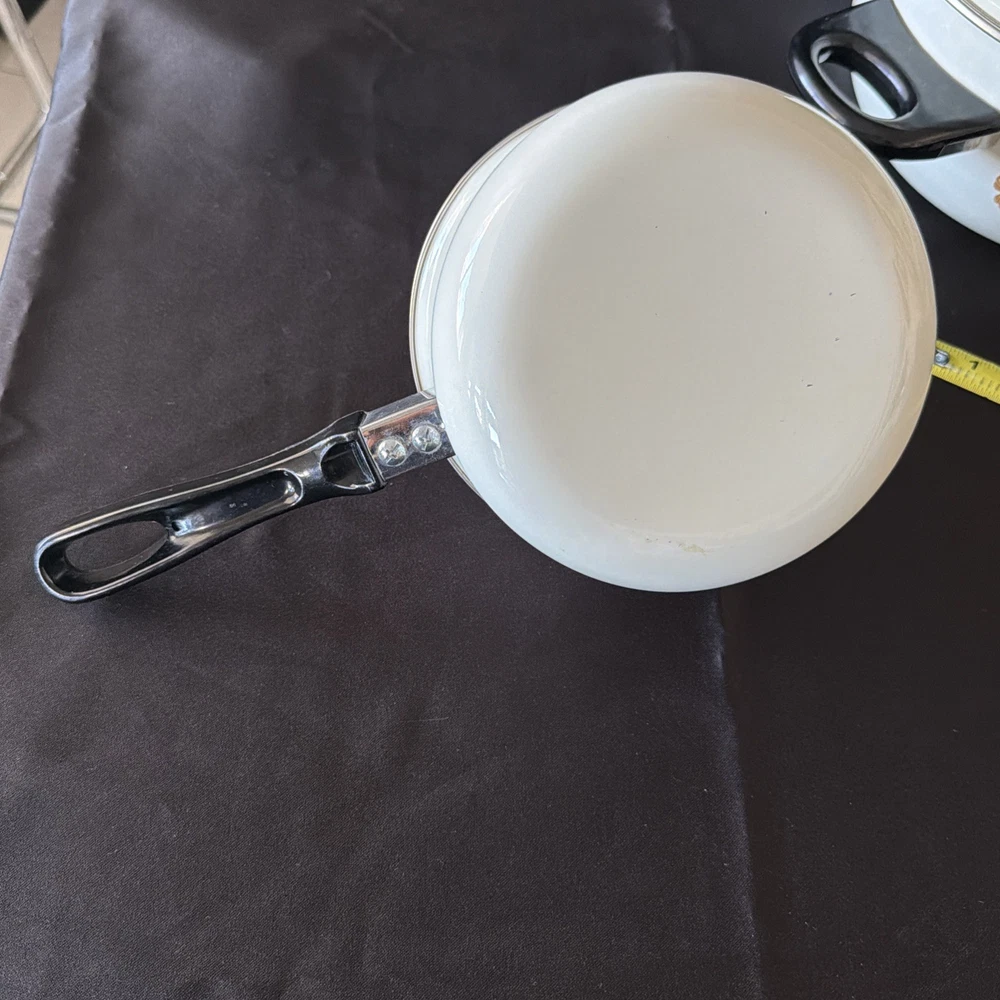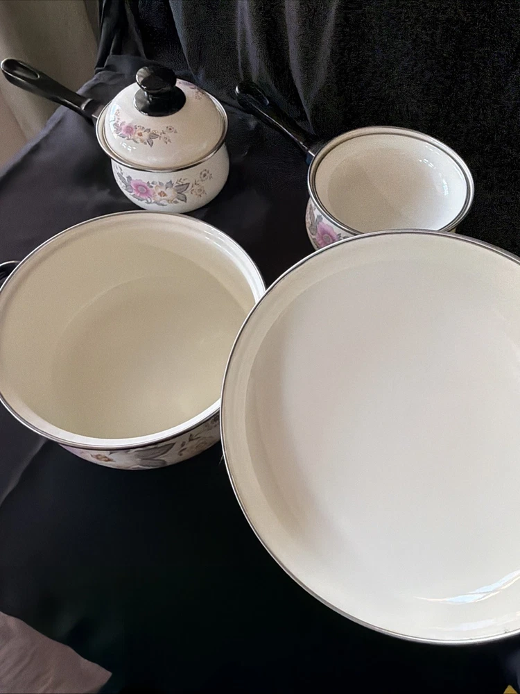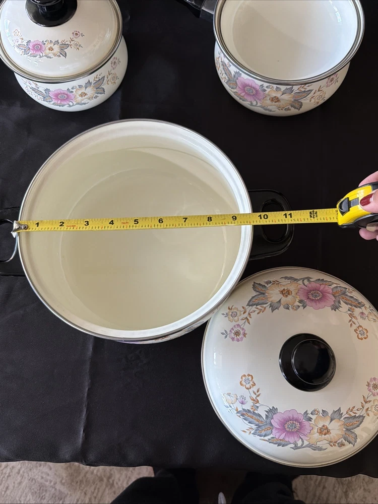 The product is a set of six vintage 1970's enamel saucepans with floral patterns and plastic handles. The round saucepans are designed for use on both electric and gas stoves, making them versatile for various cooking needs. Each saucepan comes with a lid, adding to their functionality and collectibility. These original saucepans are a unique addition to any kitchen, especially for those interested in vintage cookware from the 1970s.