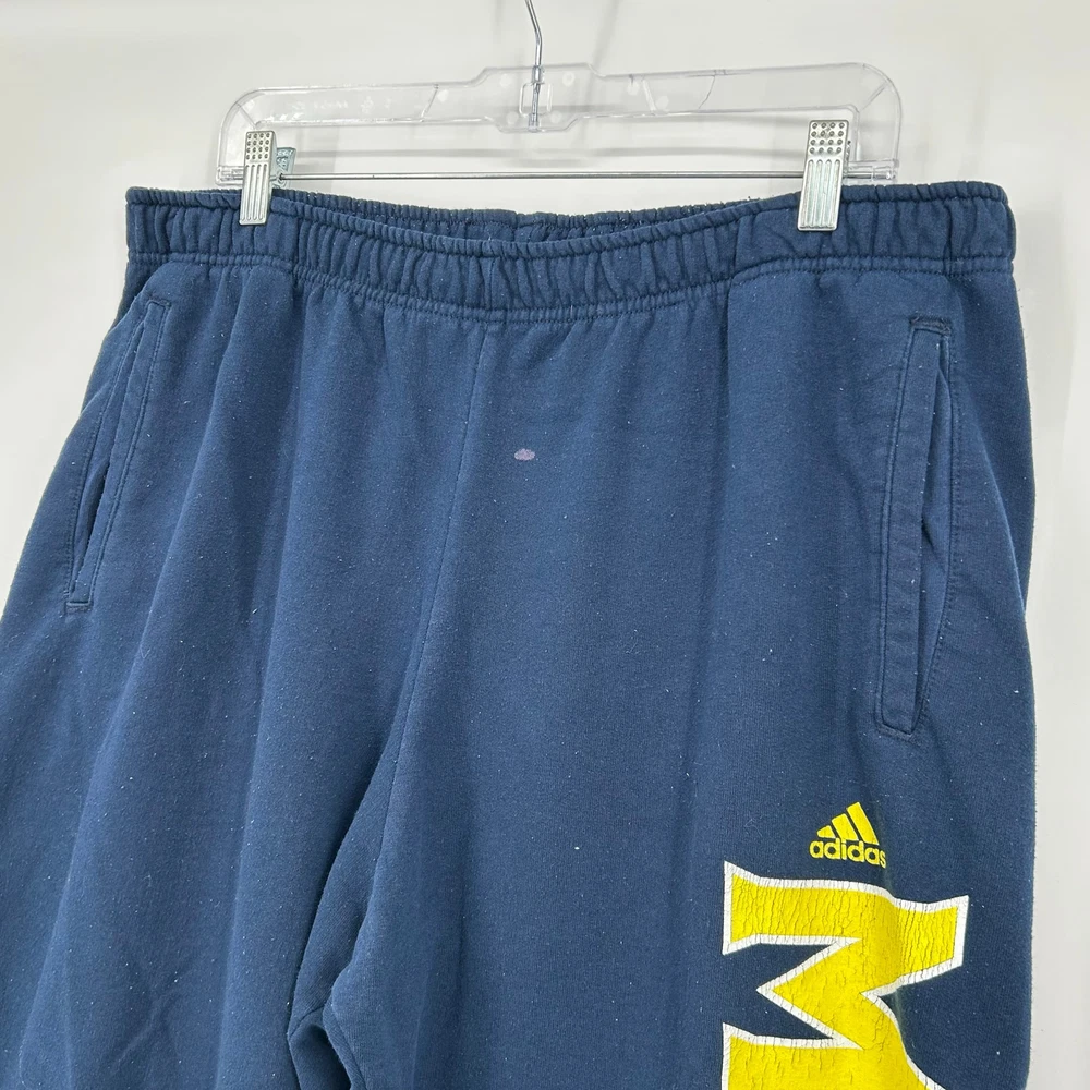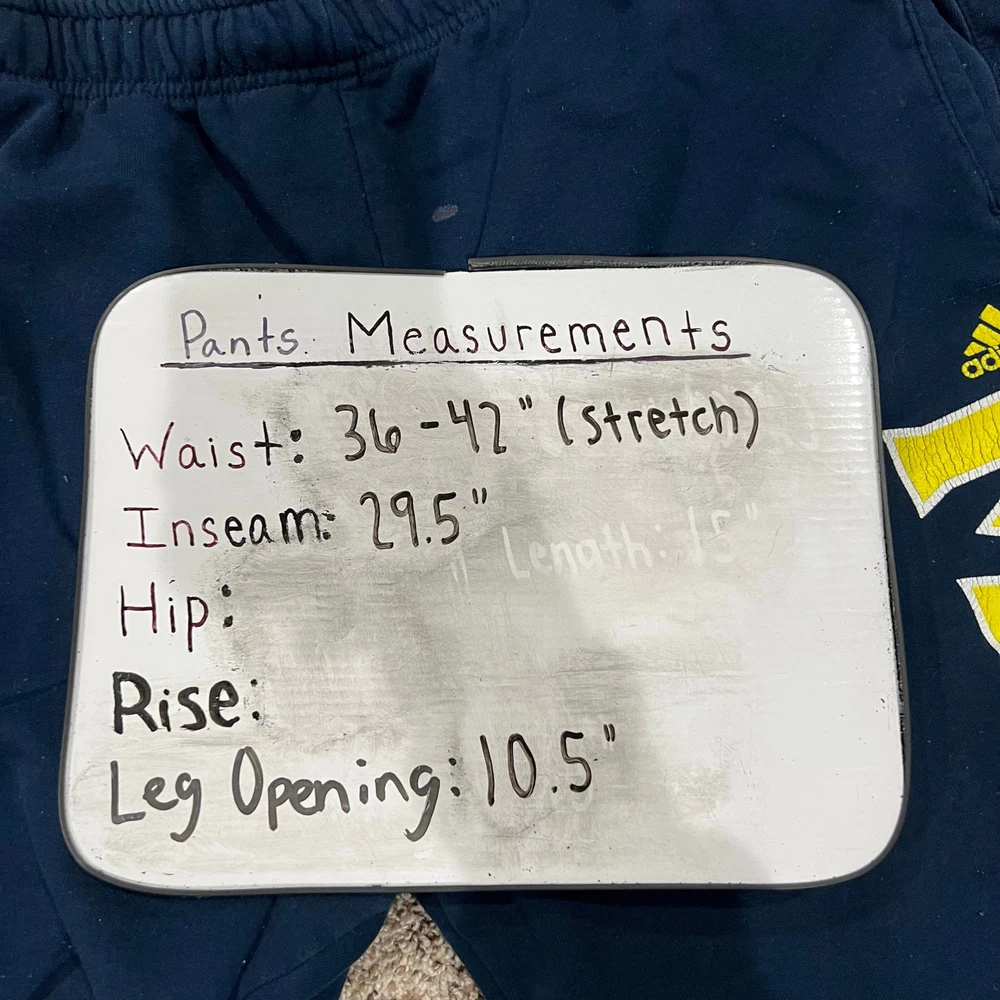 Vintage y2k men's navy blue yellow Adidas University of Michigan Wolverines wide leg baggy track sweatpants Tag Size: XL Waist: 36-42" (stretch) Inseam: 29.5" Leg Opening: 10.5" Item is in good used condition. Look at photos to see the condition. All, if any, flaws have been pictured. See the last photo for measurements. The waist measurements are measured flat and then multiplied by 2 to get the full measurement around. Please know which measurements fit you prior to purchasing, and don’t just rely on the size tag. Feel free to ask any questions! ***Item is cross posted on several platforms***