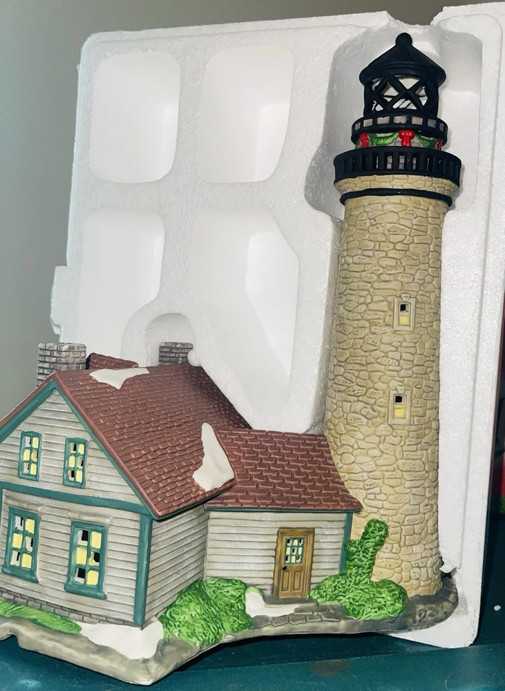 Elevate your festive display with the Santa's Workbench Collection Victorian Series' Cape Christiana Lighthouse. A charming addition to any Christmas village setup, this medium-sized porcelain piece boasts intricate detailing and a cozy nautical theme, complete with a lighthouse design that captures the spirit of the season. Measuring at 11.5 inches in height, 8.25 inches in length, and 4 inches in width, this asymmetrical ornament fits seamlessly in any room, creating a warm and inviting atmosphere. Crafted in 2000, this retired collectible comes packaged in a box and foam for safekeeping, making it a timeless treasure for holiday enthusiasts and collectors alike.