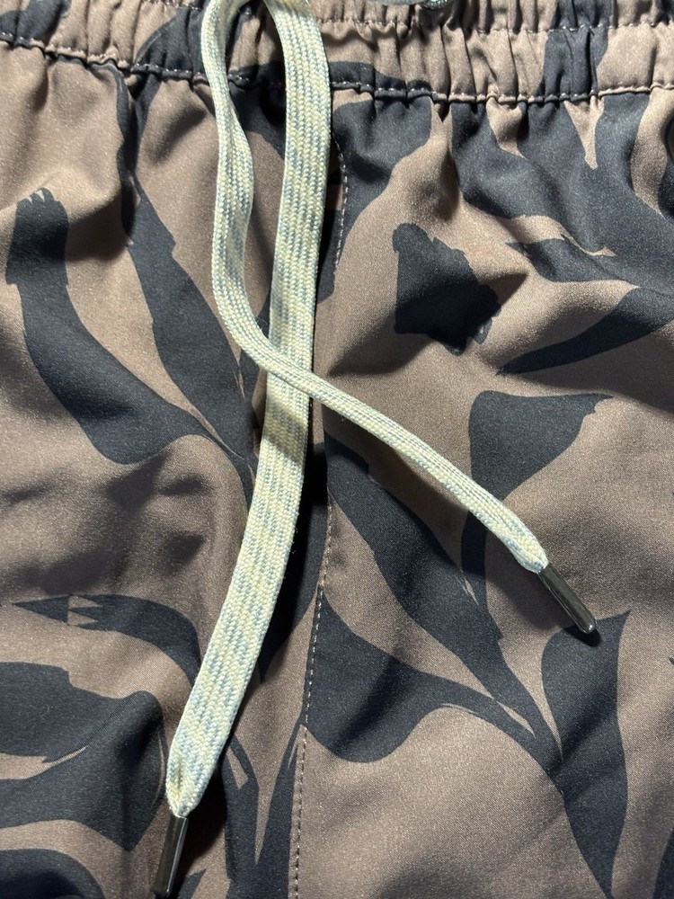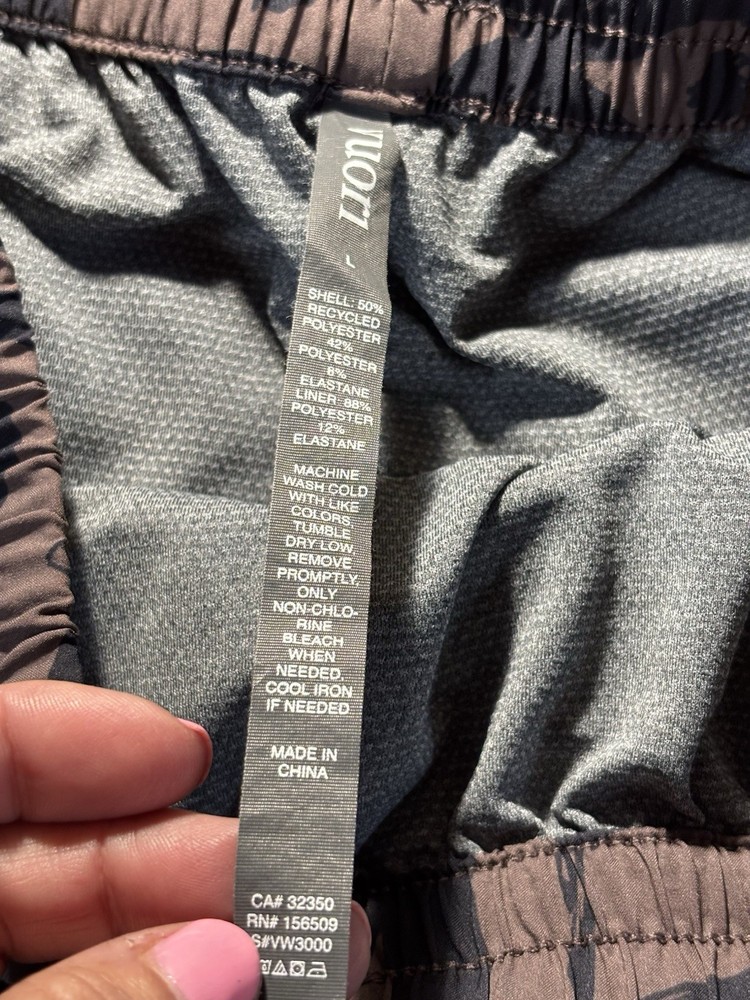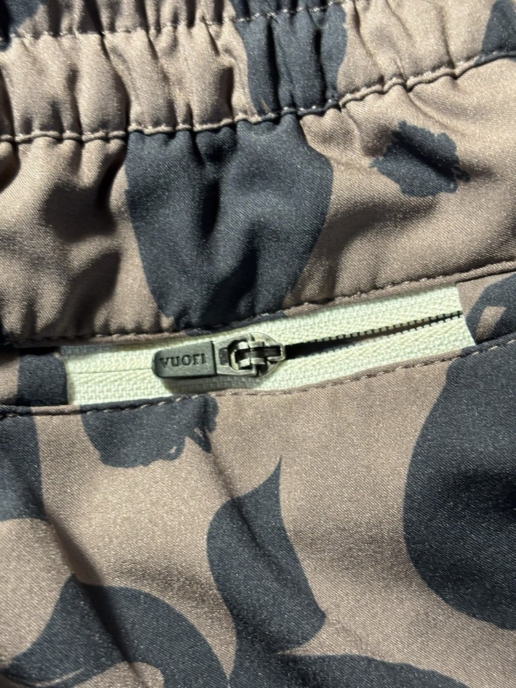 The VUORI Clementine 2.0 Shorts in Women's size L are stylish brown camo athletic shorts with a regular fit and 2.5" inseam. Made from a polyester blend fabric with a lined interior, these shorts feature a drawstring closure, elastic waist, and pockets for added convenience. Perfect for various outdoor sports activities and casual wear, these machine washable shorts are a versatile addition to any woman's wardrobe, reflecting the brand's focus on performance and comfort in athletic clothing.