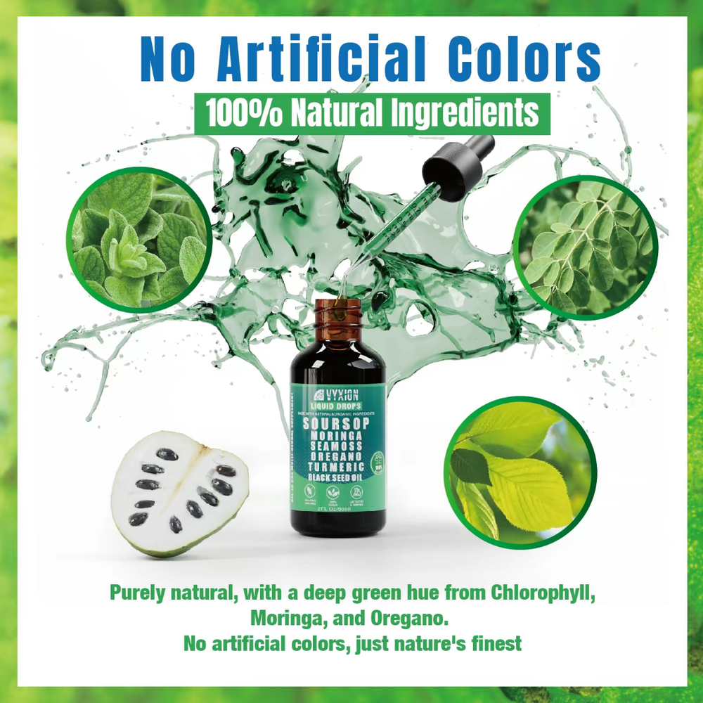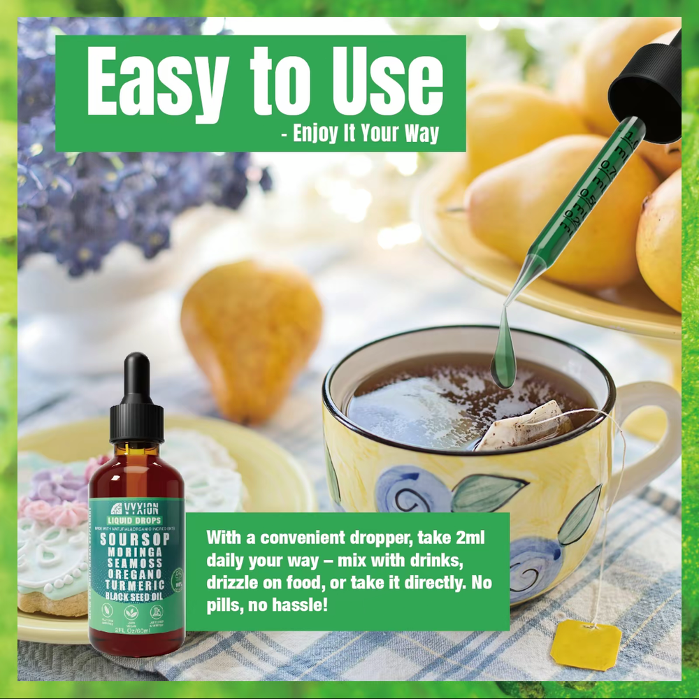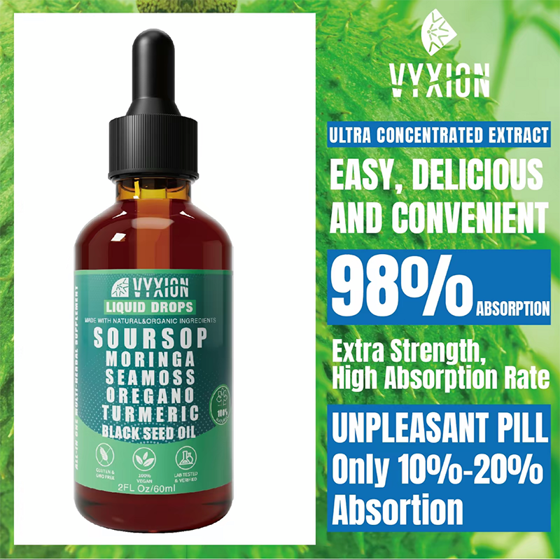 The VYXION Pure Soursop 10 in 1 Liquid DropsExtract combines a variety of natural ingredients such as Seamoss, Moringa, and Black Seed Oil to provide a nutrient-rich supplement. With the convenience of liquid drops, this product allows for easy consumption of these powerful extracts. The brand VYXION ensures quality and purity in their products, making this a reliable option for those looking to incorporate these beneficial ingredients into their daily routine.