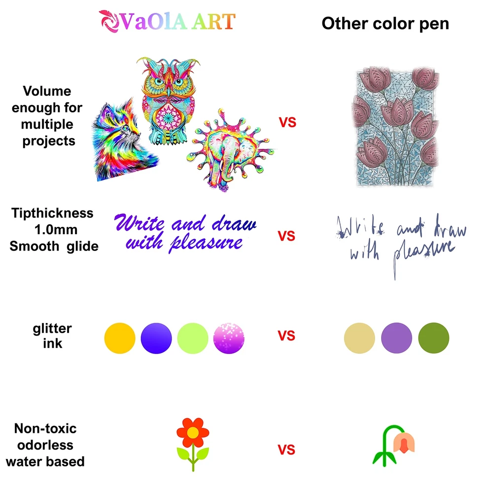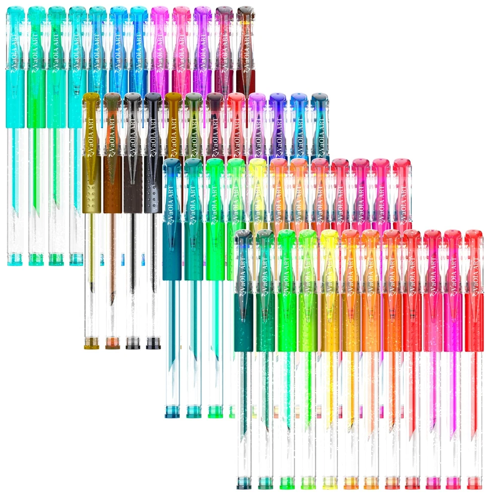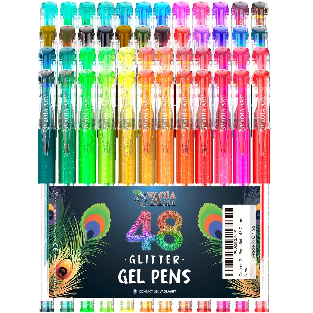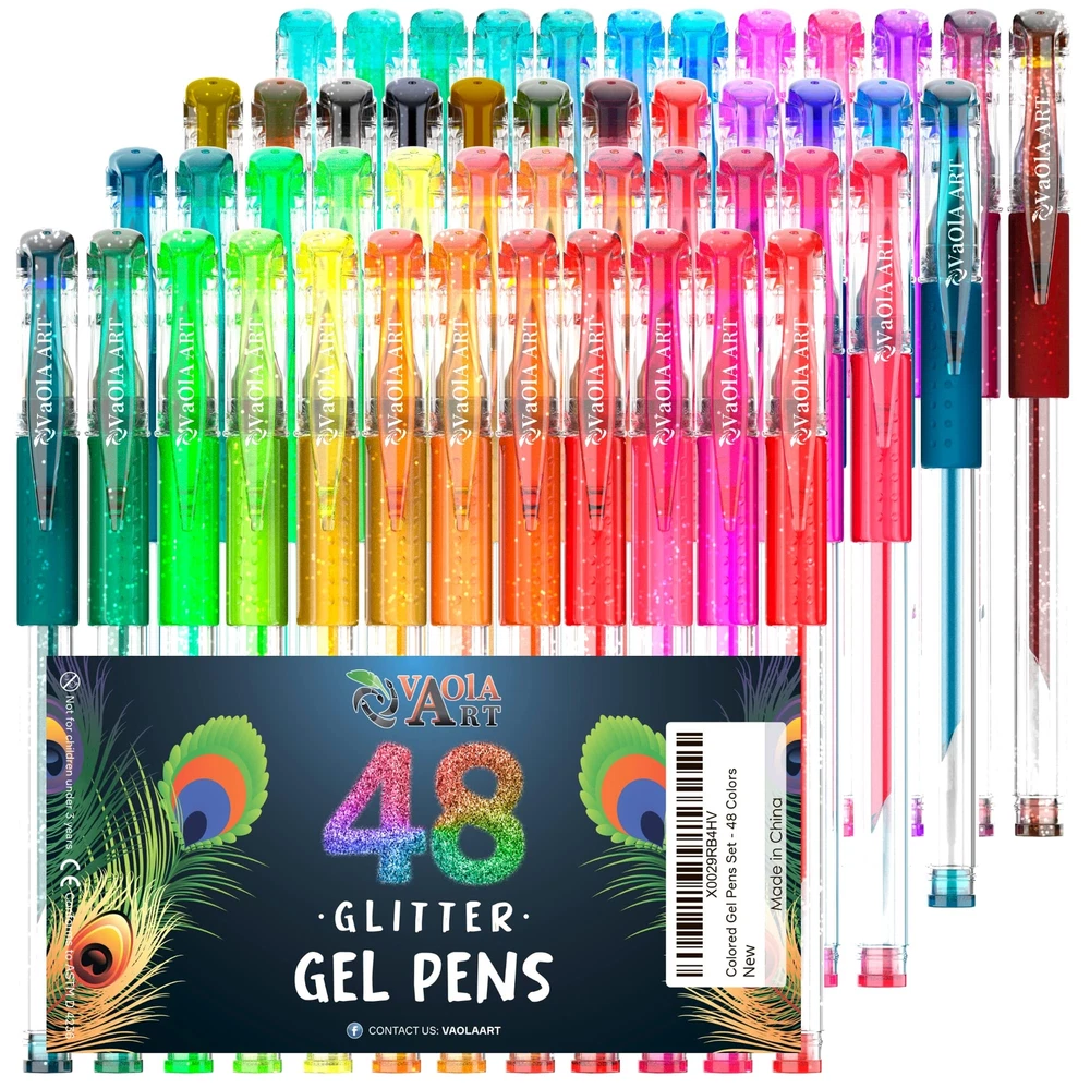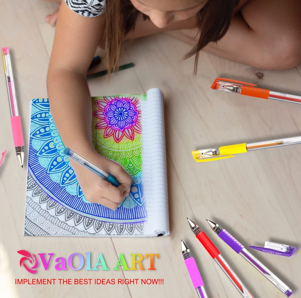 Glitter gel pens and’ spirograph pens - will make your dream come reality! Got these bright colors, you'll appreciate’ 24 glitter gel pen, you also get 24 additional refills with glitter ink. ●gel pens for kids have a comfortable construction, and each bright colored metal art supplies kit has a latex’ arts pens holder, which prevents plastic’ coloring pens from sliding out of your fingers while drawing; ●more colorful ink in each liquid’ glitter pens, which guarantees colored set to last up 2 times longer than other sets; ●these artist gel pens include erasable pens with non-toxic ink, that's why these gel pens set with fine tips can be used to create drawings on the skin and they're absolutely safe for children. Who benefits from the’ coloring pens? ●Drawing pens for kids should only be used by children over the age of 3. Gel pens set are designed for paint at home, day care facilities, to create school projects and tasks, develop creative thinking and personal drawing style; ●Pen sets for girls are ideal adult coloring kit for those who enjoy graphics, drawing and would like to try something new and creative for relaxation; ●Glitter Gel Pens are perfect’ coloring pens. Pen art set are indispensable for office workers to highlight necessary information and to create projects and notes. This is not an entire list of those who can benefit from such clear gel pens 24 pack! You don’t know what to present to a child, friend or relative for a special occasion? Our drawing gel pens - best gift ideas! Press “Add to Cart” as you won’t find the more advantageous offer! Enjoy your 48 colors: multicolor glitter gel pens for adult coloring, office supplies, bible pens no bleed for journaling. Be ready to get tones of fun with VaOlA ART aesthetic pens set. Feel the comfort: all our colored pens come with soft silicone grips. It's easy to use art gel pens for drawing, painting, writing, scrapbooking, journaling. Try paint pens as cool gel highlighters Love cute pens' smooth: 48 coloring gel pens are fancy pens for adult coloring or paint pens for journaling. No bleed technology makes this cute art coloring set super cool for taking notes Get longer usage: VaOlA ART glitter pens set has thicker ink rods in comparison with other gel pens. As a result, our pens contain more ink than other similar art supplies for glitter paint. Art pens set as a cute gift: adult coloring bookmarkers are super useful in the everyday life and purposes. Present VaOlA ART colored pens to your close women or kids to release their creativity.