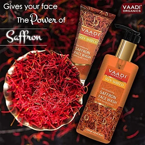 Product description An innovative aftersuncare herbal formulation, this facewash fights and reverses the UV damage to the skin, while leaving it feeling cool and refreshed. Antioxidants, saffron and sandal, further soothe the exposed skin, as well as miraculously fade away suntan and pigmentation, granting you a fairer and smoother complexion.What is sun tan and how does Saffron-Sandal combo help in fighting it off? The human body has its own mechanism of protecting itself from external factors that harm it. When the UVA and UVB rays from the sun attack, the skin produces Melanin in the epidermal layer of the skin. Melanin acts as a protective shield against the sun's harmful effects. The skin, as a result, darkens in color. This is called sun tan. Sun tanning over period of time leads to a dull, lack-luster skin with blemishes and black spots on the tanned areas. A sun block helps in keeping a tab on the tanning process, saving the skin from damage.What is the role of Saffron in providing a perfect sun protection and aid healing?Mainly found Iran and also cultivated in Kashmir, Spain and Greece, Crocus sativus or simply Saffron is known for it's soothing and medicinal properties. Saffron facilitates deep pore exfoliation which yields a clearer, fresh and flawless skin with regular use. Scars, sun spots, dark patches and blemishes fade quickly as saffron acts under the skin's epidermal layer, healing and rejuvenating the skin from within and imparting a healthy glow on the outside. Toning the skin, curing burns, rashes and allergies, Saffron safeguards the skin from further damage by acting as a shield. When combined with Sandal, Saffron moistens the skin to prevent dryness and itching thereby enhancing the texture. How is Sandal beneficial for the skin?Sandal extracts are taken from Santalum trees which are found in the Indian Sub-continent, Indonesia, Australia and Pacific Islands. Sandal is a skin toner, which heals sun-burnt skin in no time. It even tones the skin in a subtle way and imparts a glow, fading away pigmentation, scars and patches. A natural astringent, Sandal is germicidal in nature. It prevents the action of bacteria which may further harm the sun-damaged skin. Being an excellent antiseptic, Sandal has a cooling effect which cures rashes, burns, reduces tan and eruptions.Far above any naturally occurring moisturizer, Sandal seeps down the layers of the skin, soothing and moisturizing the skin in a way that it makes the skin soft, supple & improves the skin texture. From the manufacturer Benefits of using Saffron Face Wash 1. Fights and reverse the UV damage to the skin. 2. Fades away dark spots and pigmentation. 3. Grants fairer and smoother skin. VAADI HERBALS SAFFRON FACE WASH An innovative after-sun-care herbal formulation, this face wash grants you a fairer and smoother complexion. An innovative after-sun-care herbal formulation, this face-wash fights and reverses the UV damage to the skin, while leaving it feeling cool and refreshed. Anti-oxidants, Saffron and Sandal, further soothe the exposed skin, as well as miraculously fade away sun-tan and pigmentation, granting you a fairer and smoother complexion. Premium saffron and sandal rich facial cleanser. Suitable for all skin types, be it oily, normal or dry. 100% herbal with no added preservatives and chemicals. Formulated to help skin look beautiful and healthy. KEY INGREDIENTS Saffron Extract Saffron is also popular as a complexion lightening and smoothening agent due to its ability to lighten acne scars and tanned, pigmented or blemished skin, and even out and moisturize dry skin. Sandalwood Known since ages as a natural complexion enhancer, Sandal is also a great anti microbial which not only treats acne breakouts and blackheads, but also works as an antiseptic. Additionally, it helps lighten and largely remove blemishes, acne marks and dark spots. Turmeric Turmeric has been used as an antiseptic for centuries and it is regarded as one of nature's most powerful healers. The herb helps to even out your skin tone and colour, making it an excellent ingredient in a face wash. HOW TO USE Before You Apply Sun Block Cream/Lotion, Wash Face With This Anti-Tan Gel. Squeeze Out A Small Quantity. Apply On The Face And Workout Lather. Rinse Off, Pat Dry.