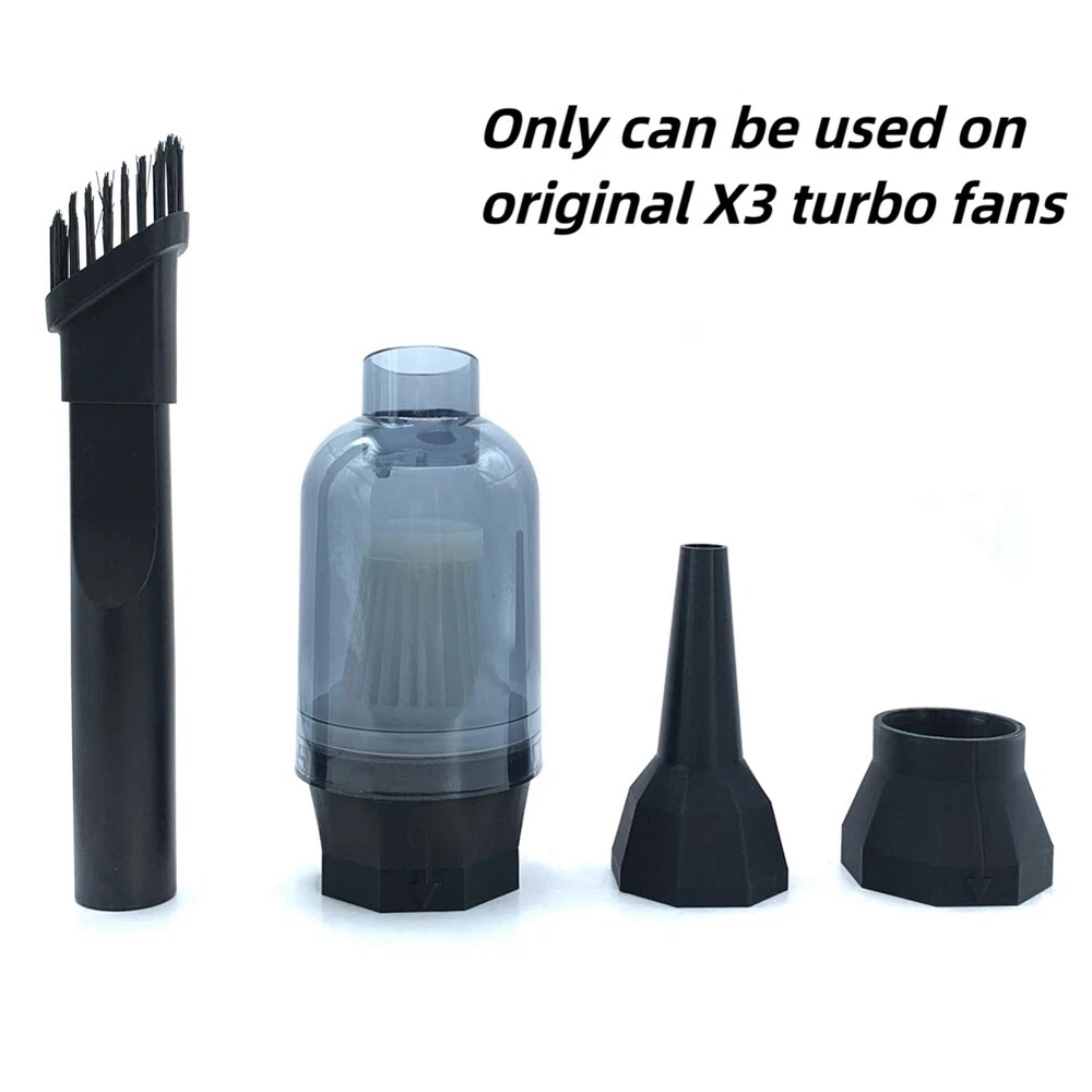 Vacumm Cleaner Nozzle Kit for X3 Violent Turbo Fan Cleaning Dust Home Car3153 Features: 1. This kit can only be used for X3 turbo fans 2. It can be installed on the front/back of the X3 turbo fan to achieve vacuuming, dust removal and other functions, making your X3 more versatile. 3. Can be used for desktop cleaning, keyboard cleaning, computer case cleaning, etc. Parameters: Function: suction, blowing Note: When using the vacuuming and vacuum cleaner functions, please install the accessories at the tail of the machine, not the . Only available for X3 fans. And it cannot be used continuously for a long time, otherwise it easily cause debris to get caught in the motor and cause damage to the fan. Material: PETG carbon fiber+plastic colour: As shown Package Contents: 1 x Vacuum cleaning brush 1 x dust cover 1 x Extended nozzle 1 x Vacuum attachment