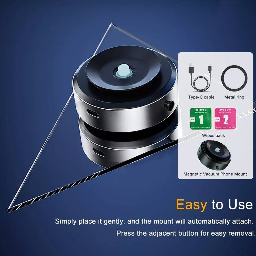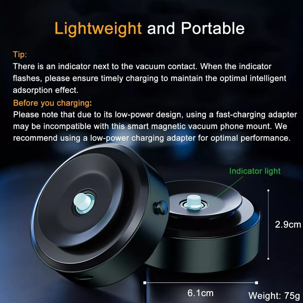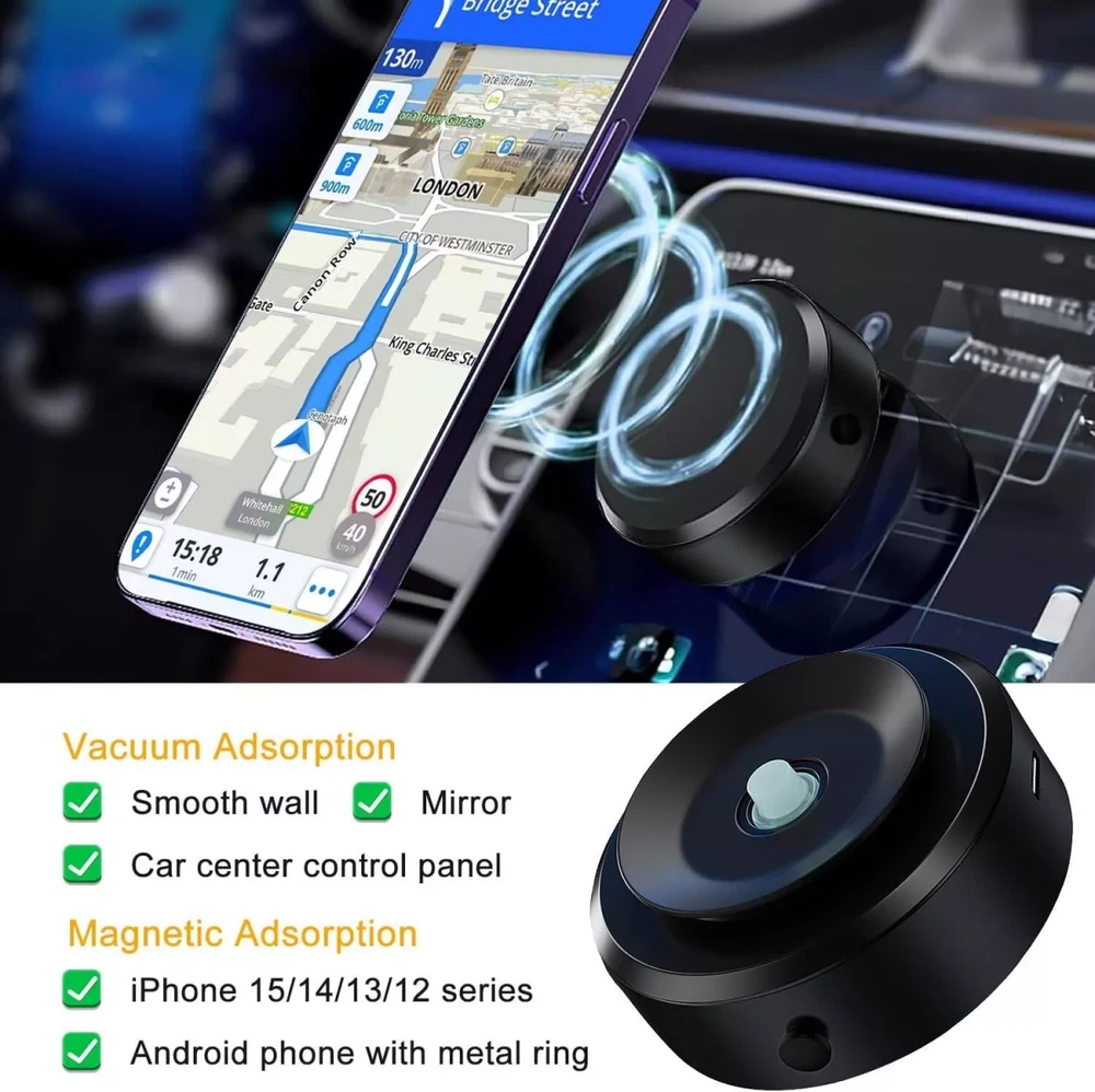 Car Phone Holder MountGlass Mirror Adsorption Magnetic Suction Cup Car Phone Holder 💥【Upgraded Magnetic Suction Phone Mount】Unlike traditional dual magnetic phone holders, the Jkoailiwi 2024 innovative magnetic suction phone holder combines intelligent vacuum and magnetic attraction. This allows for versatile use on metal surfaces, smooth walls, glass, mirrors, and car screens, simplifying your daily life 💥【Strong Adsorption】 Our magnetic holder features intelligent vacuum sensing technology paired with the latest N52 permanent magnets. Ideal for car use, it handles sudden brakes, speed bumps, and diverse road conditions effortlessly, making it an excellent gift choice for parents and friends. 💥【Multi-scenario Usage】This versatile vacuum magnetic suction cup phone mount adheres to various smooth surfaces like mirrors, steel, and screens, making it perfect for driving, fitness, cooking, and makeup scenarios. Simply place it gently, and the mount will automatically attach. Press the adjacent button for easy removal. 💥【Universal Compatibility】Our vacuum magnetic suction cup holder adheres to a variety of smooth surfaces. It's specially designed for the iPhone 15/14/13/12 series with its magnetic attraction feature. Additionally, we provide a metal ring for non-magnetic phones and cases. Simply affix the magsafe ring to the back of your phone or case, and allow it to set for 24 hours to maximize adhesion. 💥【Compact and Lightweight】At only 75g, this magnetic suction cup phone holder effortlessly fits into pockets or backpacks. Note: There is an indicator next to the vacuum contact. When the indicator flashes, please ensure timely charging to maintain the optimal intelligent adsorption effect.