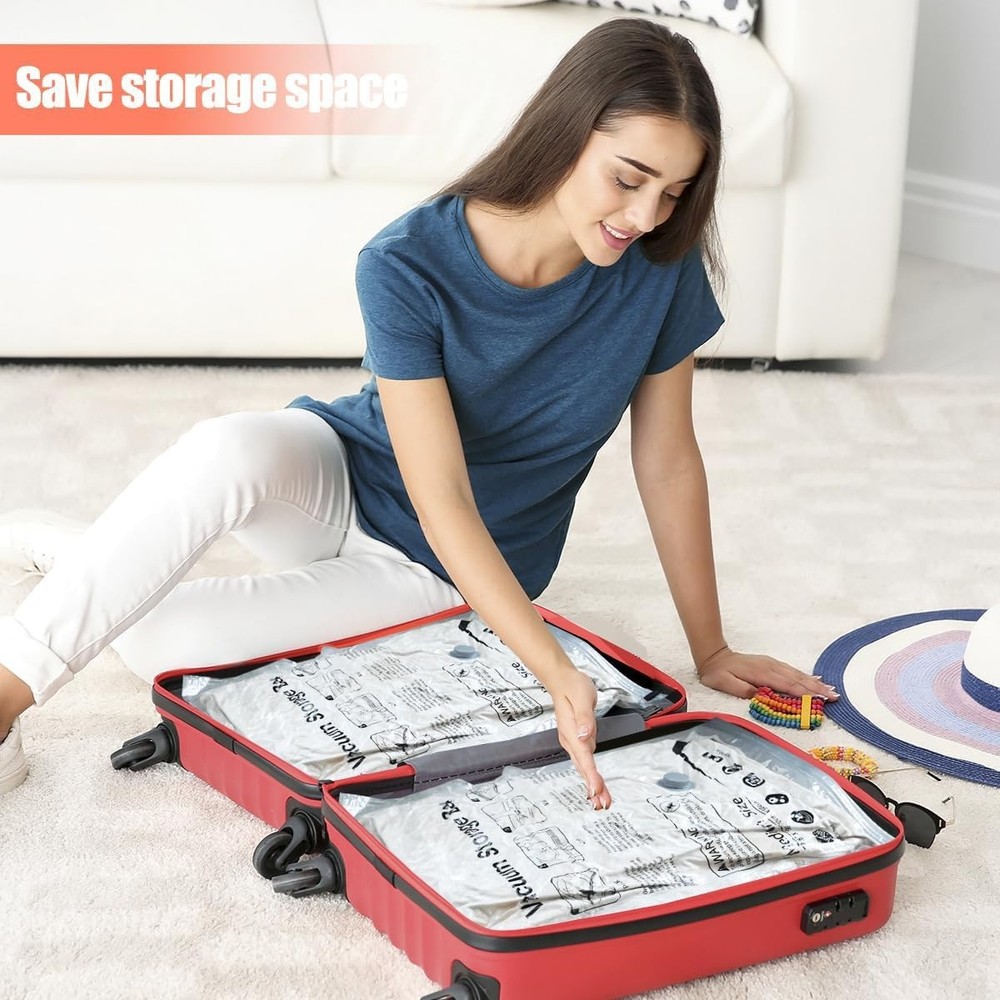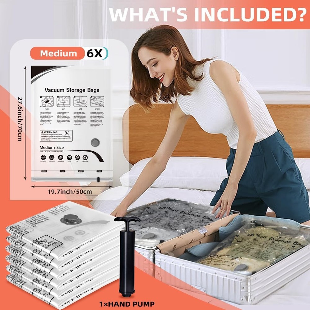 Free eBay listing template designed by dewiso.com Vacuum Storage Bags, Space Saver Bags, Compression for Comforters and Blankets, Sealer Clothes Storage with Hand Pump. (6× Medium) FREE AND FAST SHIPPING! About this item PA+PE 【80% Space Save】Our vacuum bags add more room to your clothes storage & wardrobe, lofts & suitcase Reduce original volume by 80%. Our vacuum sealer bags can be used for a variety of items including clothes, comforters, pillows, duvet, beddings, etc. 【High Quality】Our vacuum storage bags are made of PA+PE, flexible and durable. our vacuum bags get the air out in the suction process. 【Unique Design】Adopting a unique double zip seal design, with the triple-seal turbo valve, Can be used repeatedly. 【Easy To Use & Store】The one-way valve can adapt the vacuum cleaner, you can easily suck the air out and get the compression done fast and easy. Also, the package comes with a hand pump which is portable for travel. 【Pack Included】6 × medium compression bags( 27.56” X 19.68”), 1× hand pump. Product We offer a 30-Day Return Policy on items which you are not completely satisfied with. You have the option for a full-refund or an exchange of the item. No returns are available on items shipped outside of the US . Shipping We offer Free Shipping to the US and ship within 2 business days of payment, usually sooner. We use UPS express shipping. That's why your products are usually delivered within 3 days . Contact We try our very best to make sure every customer is completely satisfied. If there's a problem , message us! We're happy to help. 24/7 live chat available.