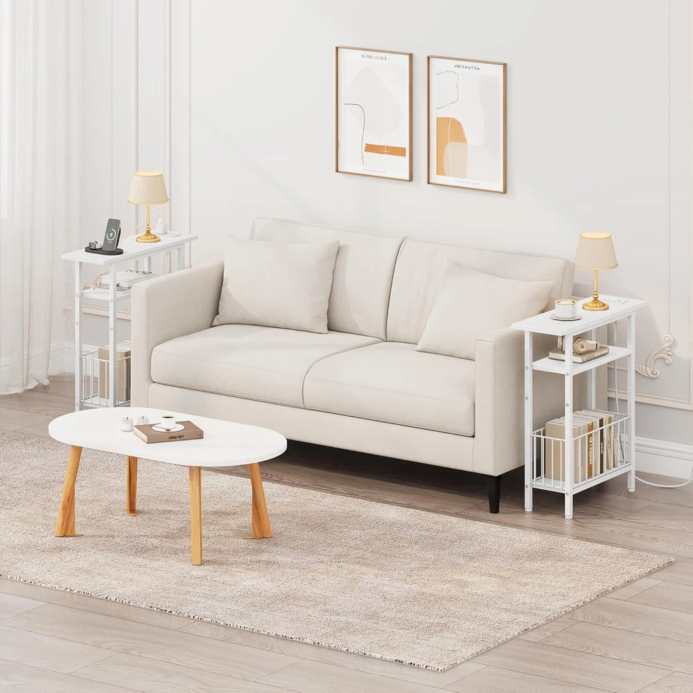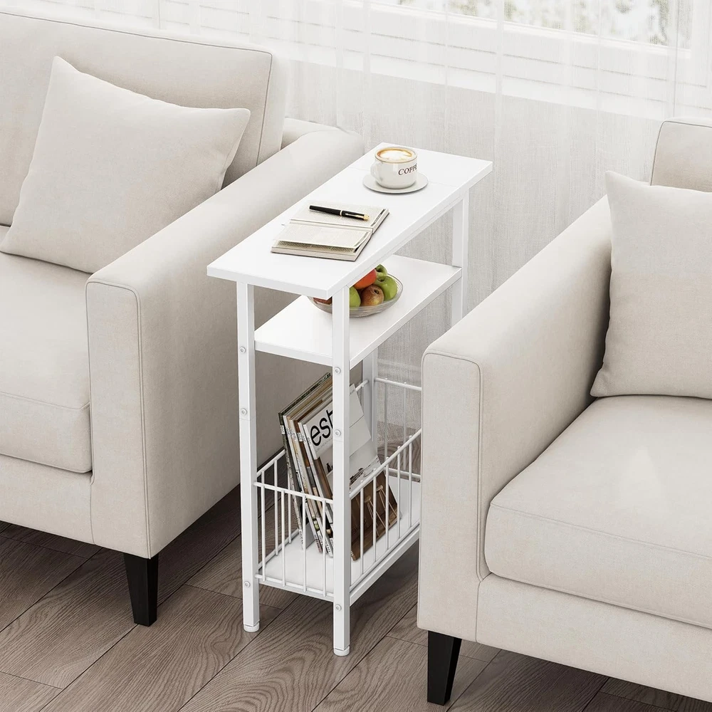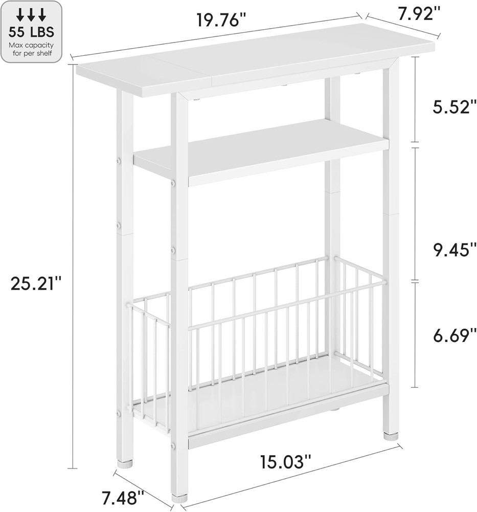 Vagusicc Narrow Side Table, Skinny Table for Couch, 3-Tier Small White Product Details Brand: Vagusicc Product Dimensions: 19.76"D x 7.92"W x 25.21"H Color: White Shape: Rectangular Style: Ordinary Frame MaterialTop Material Type: Alloy SteelEngineered Wood 【Suitable for Tight Spaces】The small side table for small spaces measures 19.76"D x 7.92"W x 25.21"H. With its compact design, this tall side table takes up little space and can effectively fit into the gaps between couches or in tight spots beside the bed 【 Side Table with Ample Storage】The 3-tier storage end table meets all your diverse needs. The widened top shelf offers more space to hold a lamp, photo frame, coffee, etc. You can place your phone or other devices on the second shelf to charge. The bottom shelf features a sturdy metal basket, perfect for storing more magazines and books 【Sturdy & Durable】The side tables living room is composed of sturdy square steel tube, open three-layer premium wood board, and sturdy metal basket, ensures a long service time. 4 adjustable feet can adapt to uneven ground, make it more stable and protect floor from scratches 【Multiple Use】Retro-stylish design makes the bedside tables perfect match to your home, can be served as a skinny end table, slim couch side table, coffee table, chair side table, hallway table, or slim nightstand in living room, bedroom, office or study 【What to Do if Any Parts Missing?】White night stand comes with detailed assembly manual, numbered parts, and necessary tools, making the procedure easy for you to complete. If there are any quality problems about our small nightstand, missing instruction manual or parts, please contact us to get electronic manual, free parts or NEW item for replacement